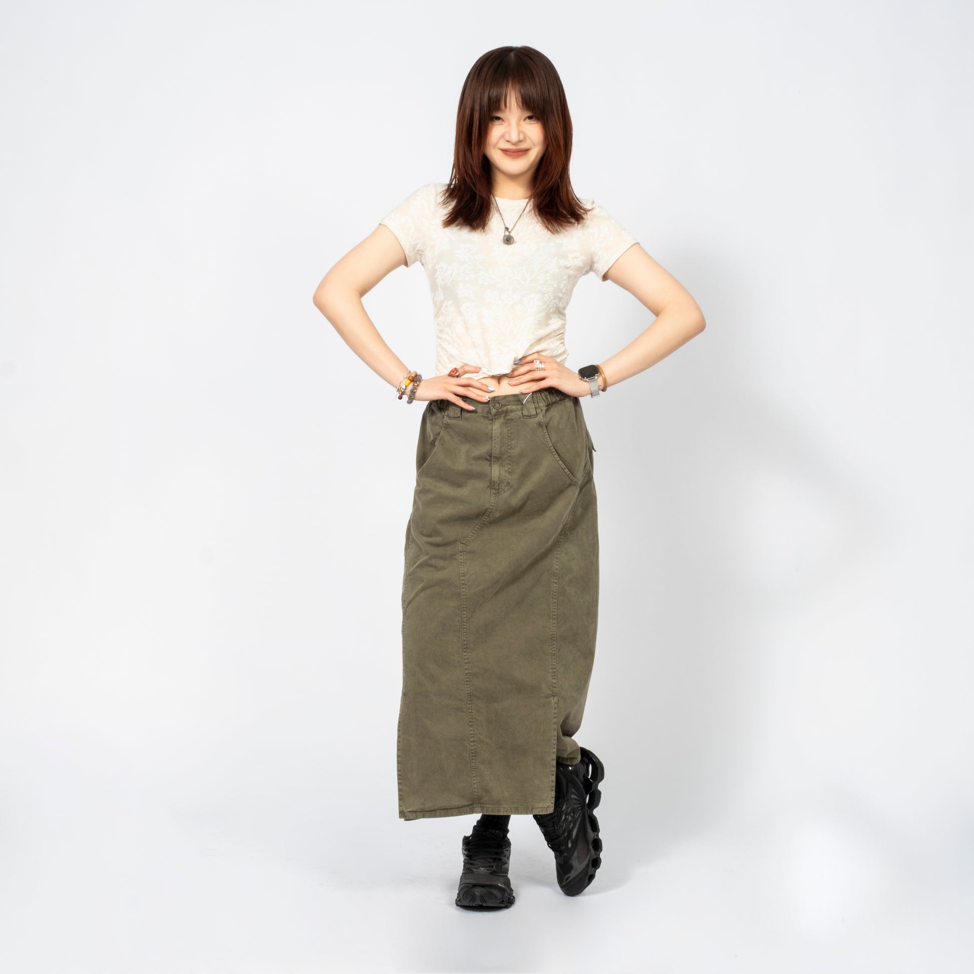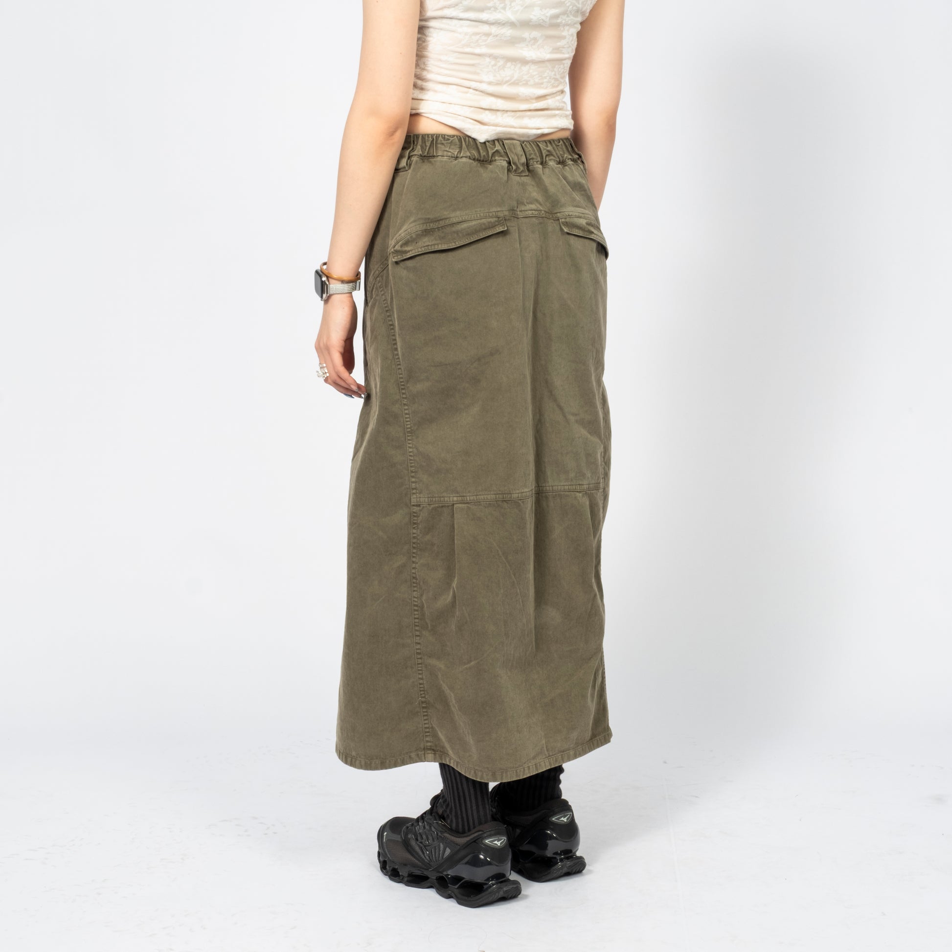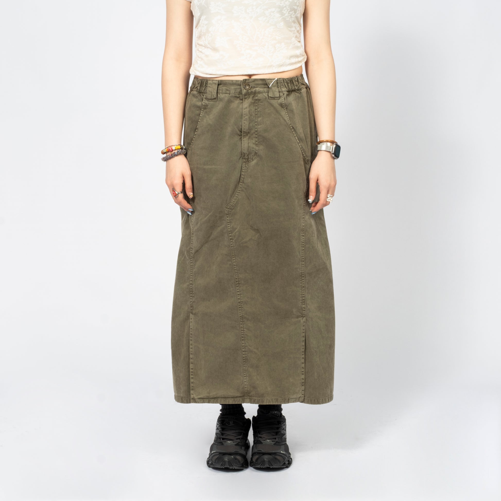 A maxi skirt from the ADVENTURE series featuring a front slit, elastic waistband, and flowing curved seams. Garment-washed for a soft vintage mood with double stitching that adds subtle structure and depth.