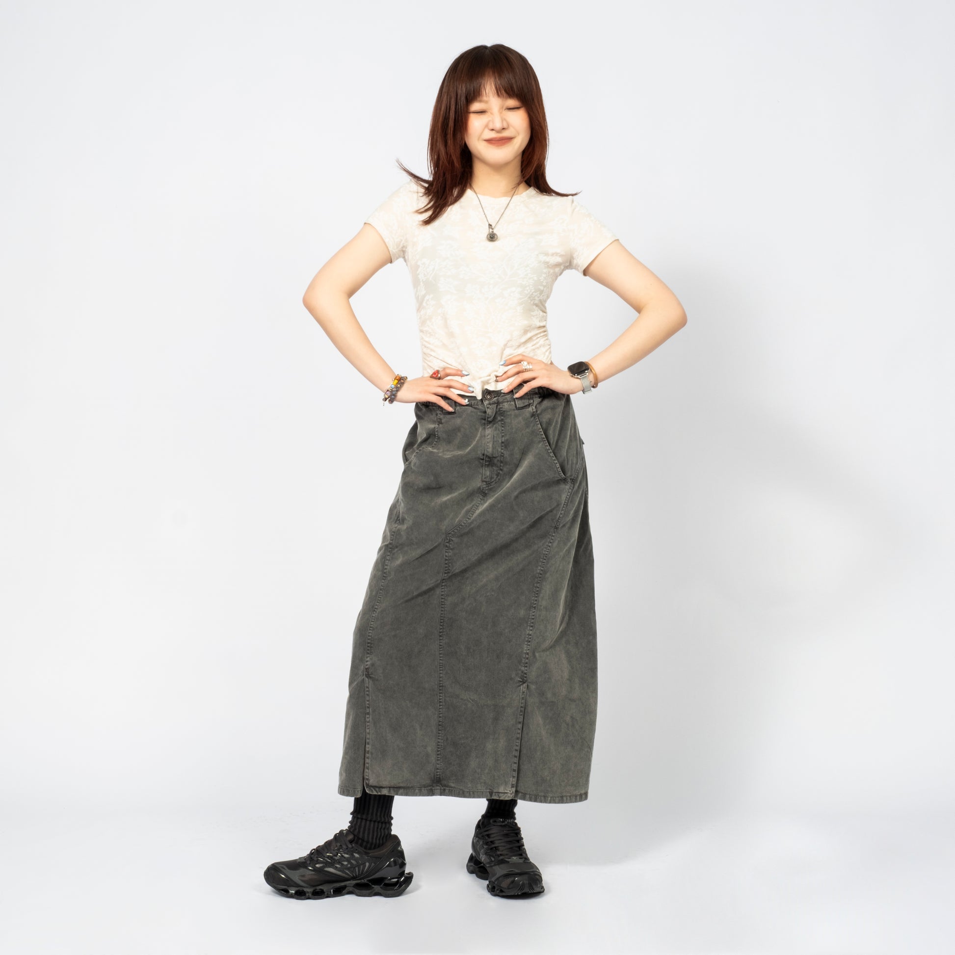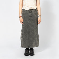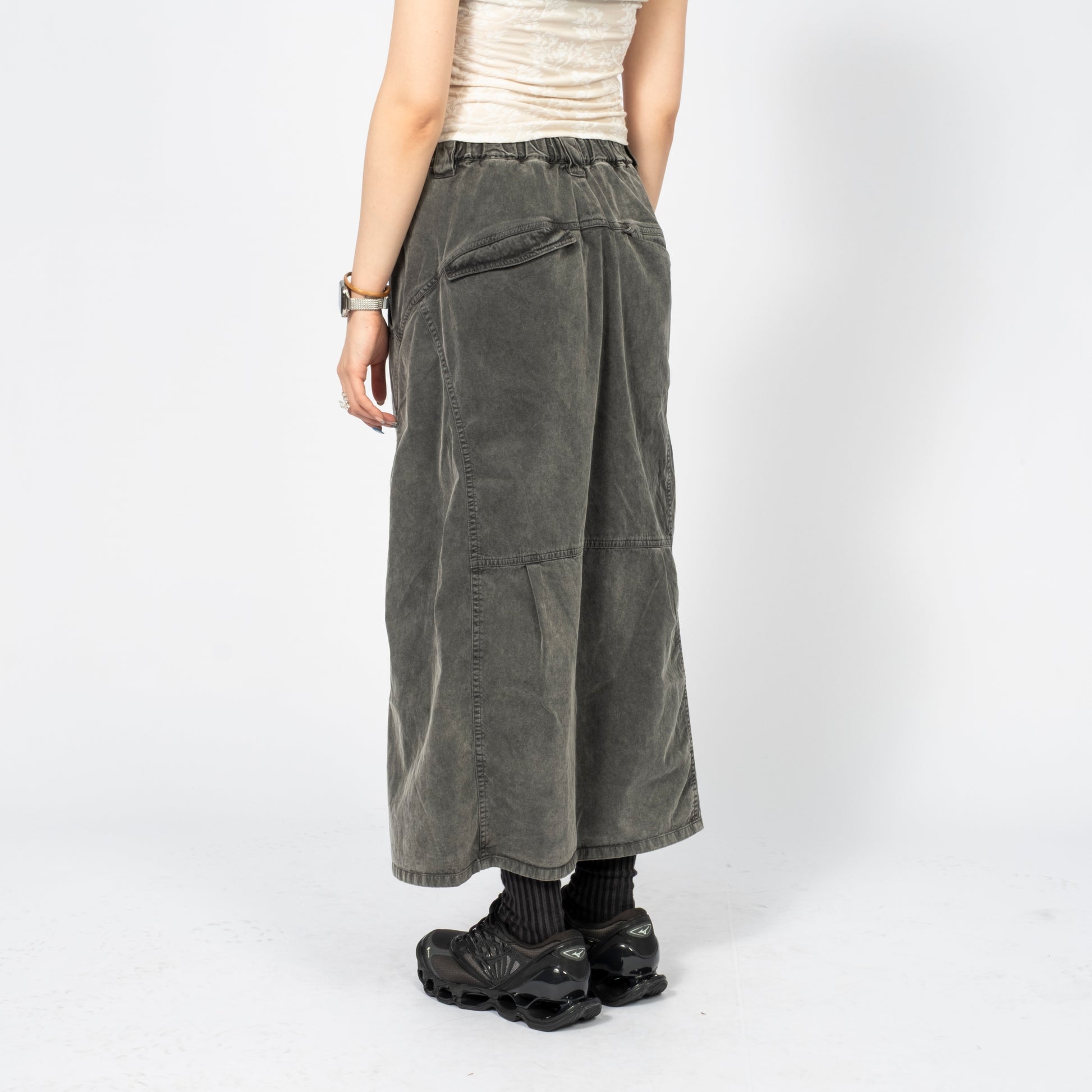 A maxi skirt from the ADVENTURE series featuring a front slit, elastic waistband, and flowing curved seams. Garment-washed for a soft vintage mood with double stitching that adds subtle structure and depth.