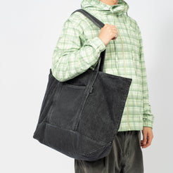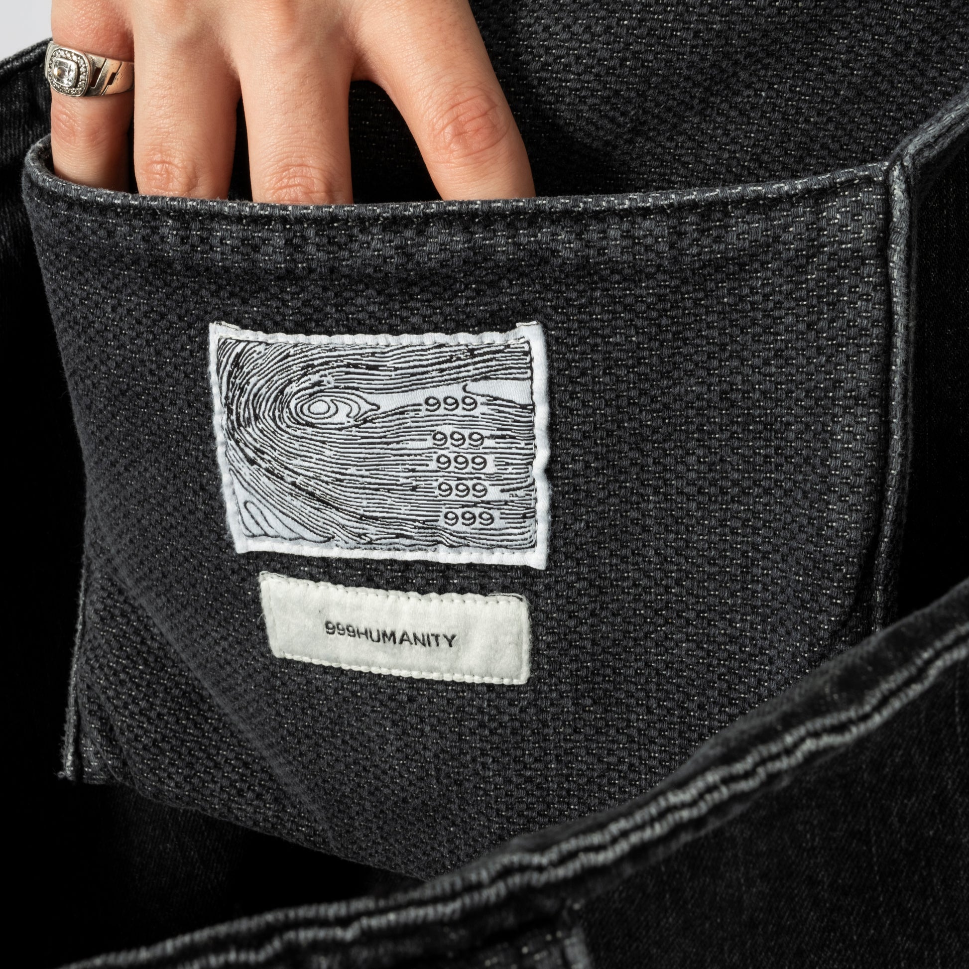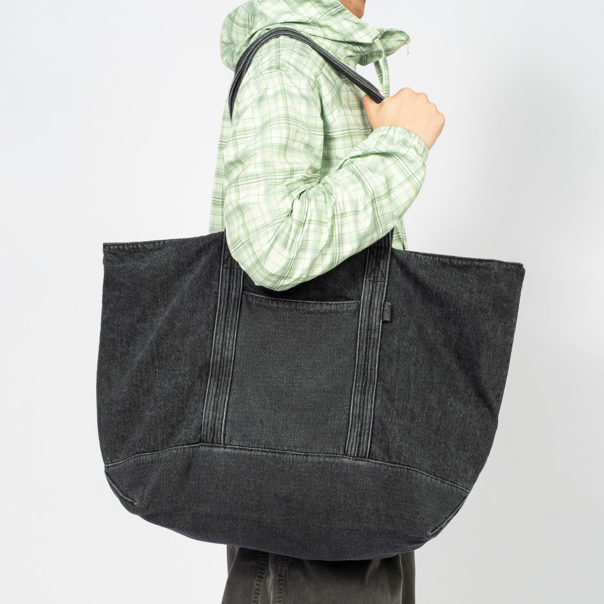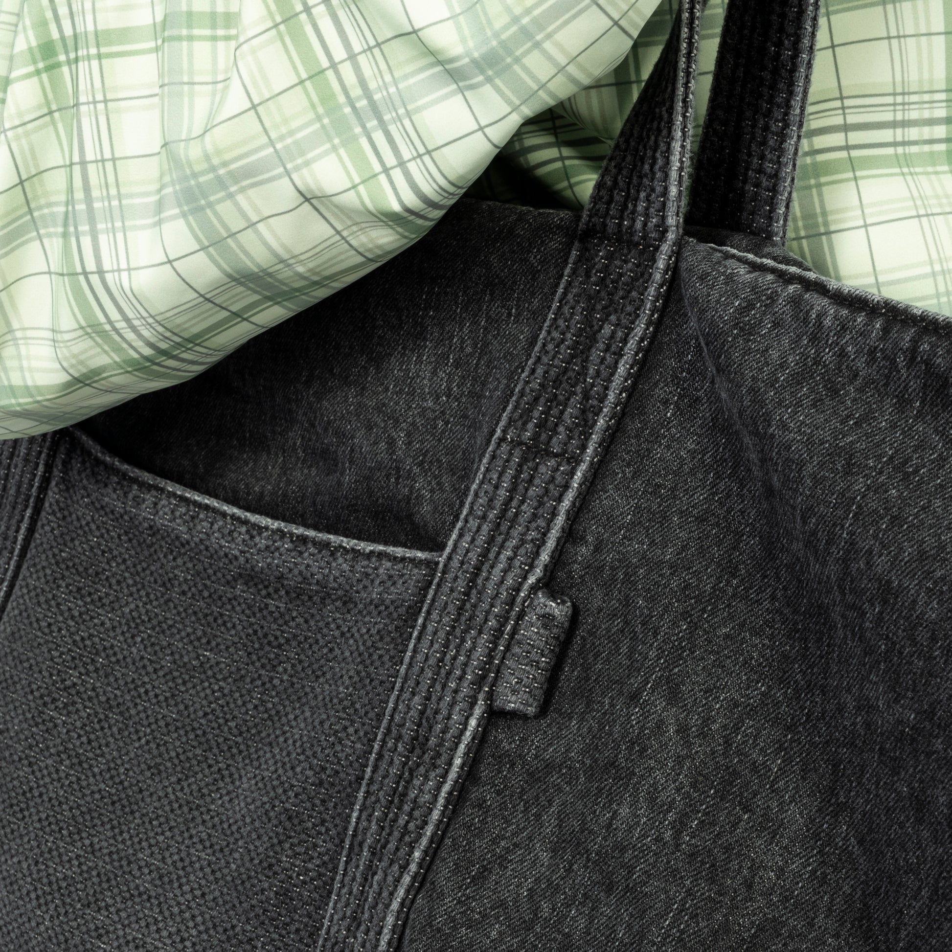 An oversized tote reimagined with 999HUMANITY’s unique sensibility. Crafted from high-density jacquard denim with soft gradient washing and contrast denim label detailing. The generous shape, exterior and inner pockets, and signature washed finish make it both practical and striking.