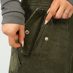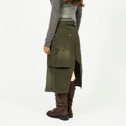 A khaki-toned denim skirt finished with a vintage wash, blending utilitarian details with layered texture. The A-line silhouette is accented by cargo pocketing and pleated check fabric that cuts through the front and back for added depth.