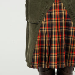 • Khaki-toned denim with vintage wash • Front and back centre cut with layered check pleated fabric • A-line silhouette with cargo pocket detail • ADSB logo leather label and cantone branding