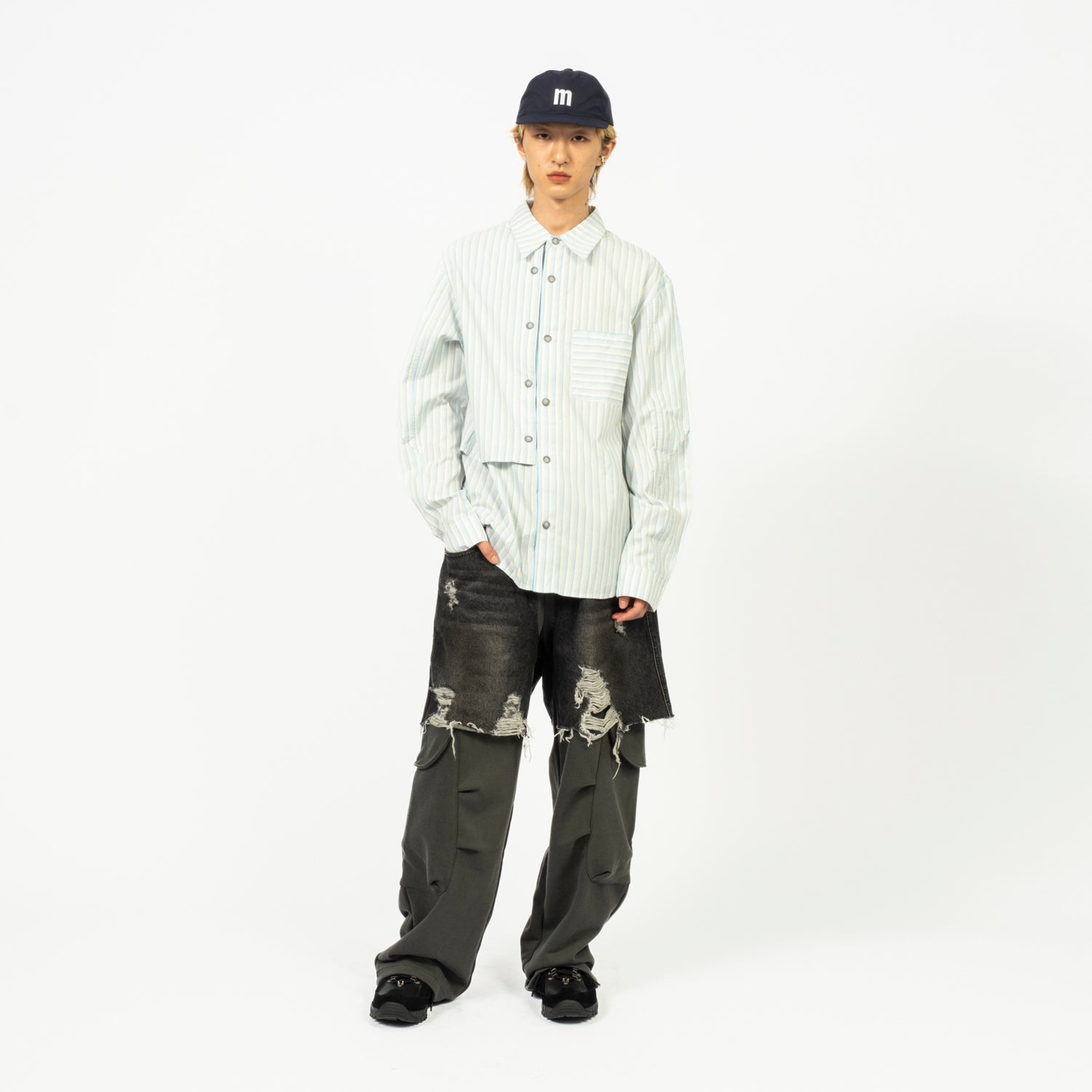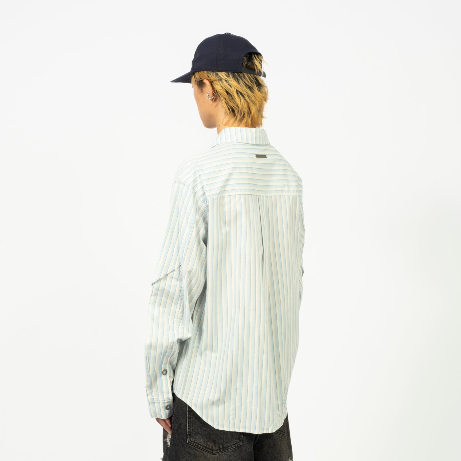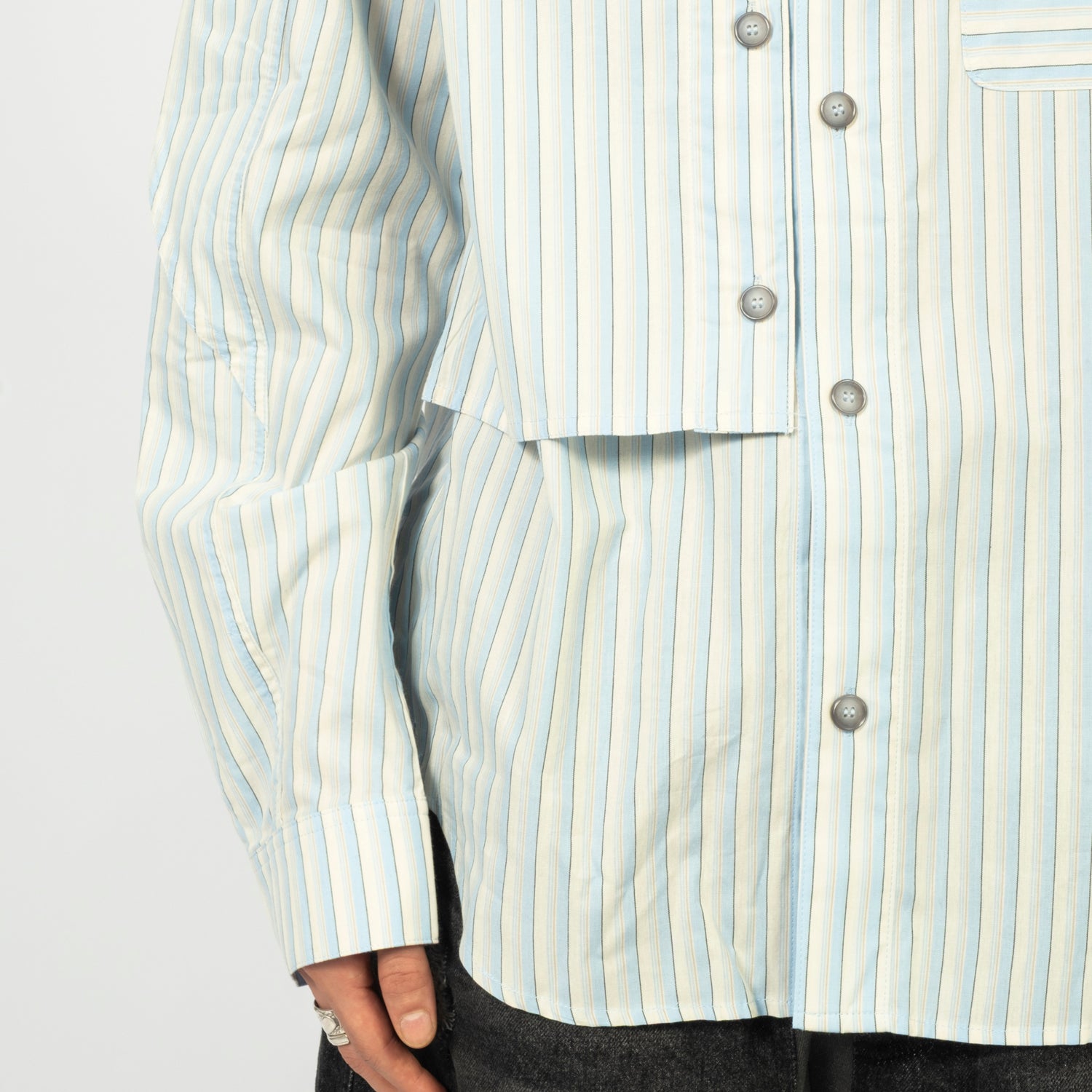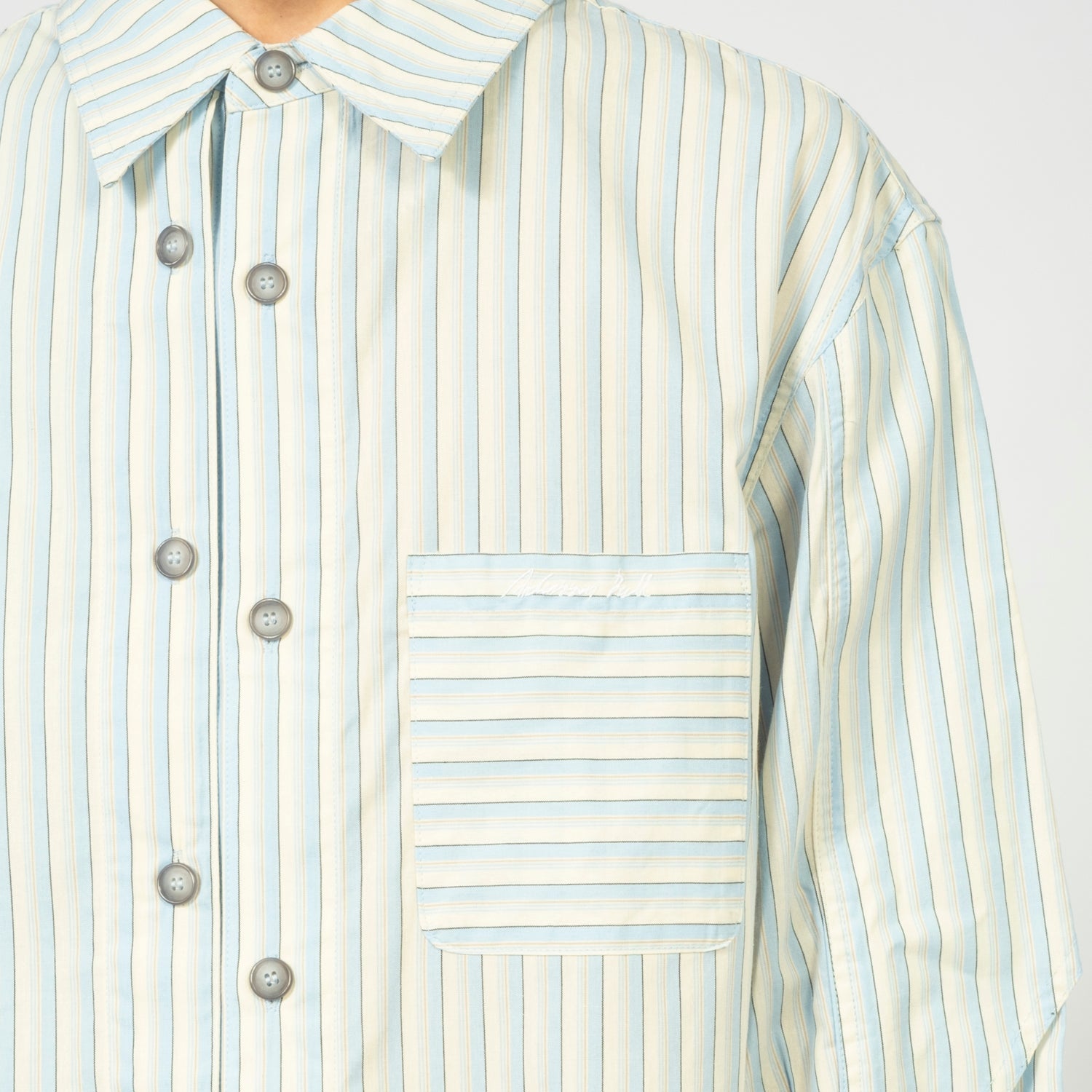 An oversized piece defined by bold proportion and layered asymmetry. The striped fabric adds graphic rhythm, while the flap construction and engraved hardware bring depth and a refined finish.