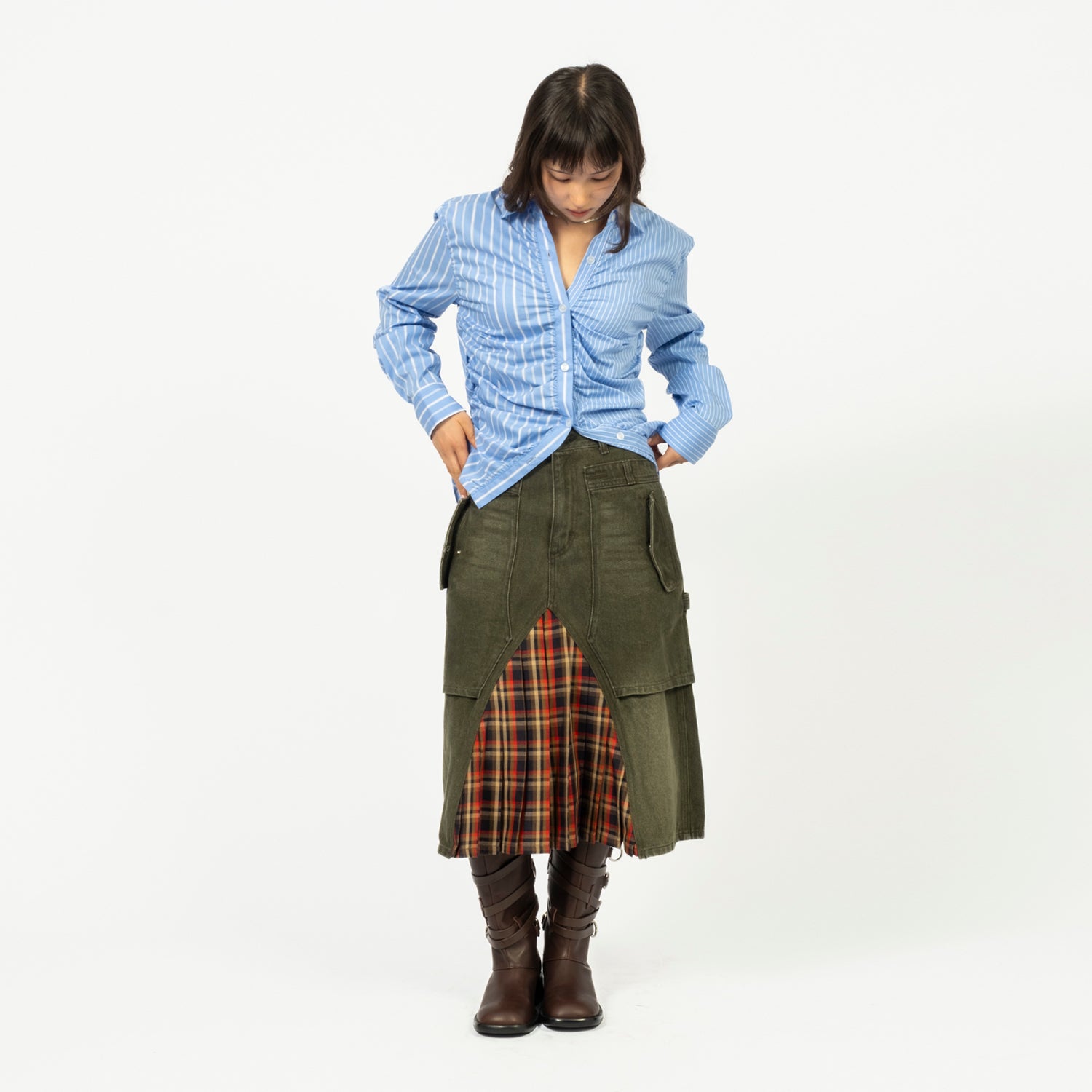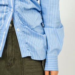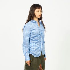 • Regular fit with shirring detail • Mixed blue stripe pattern fabric • Draped silhouette • ADSB logo domed tip at the yoke • Shell button detailing