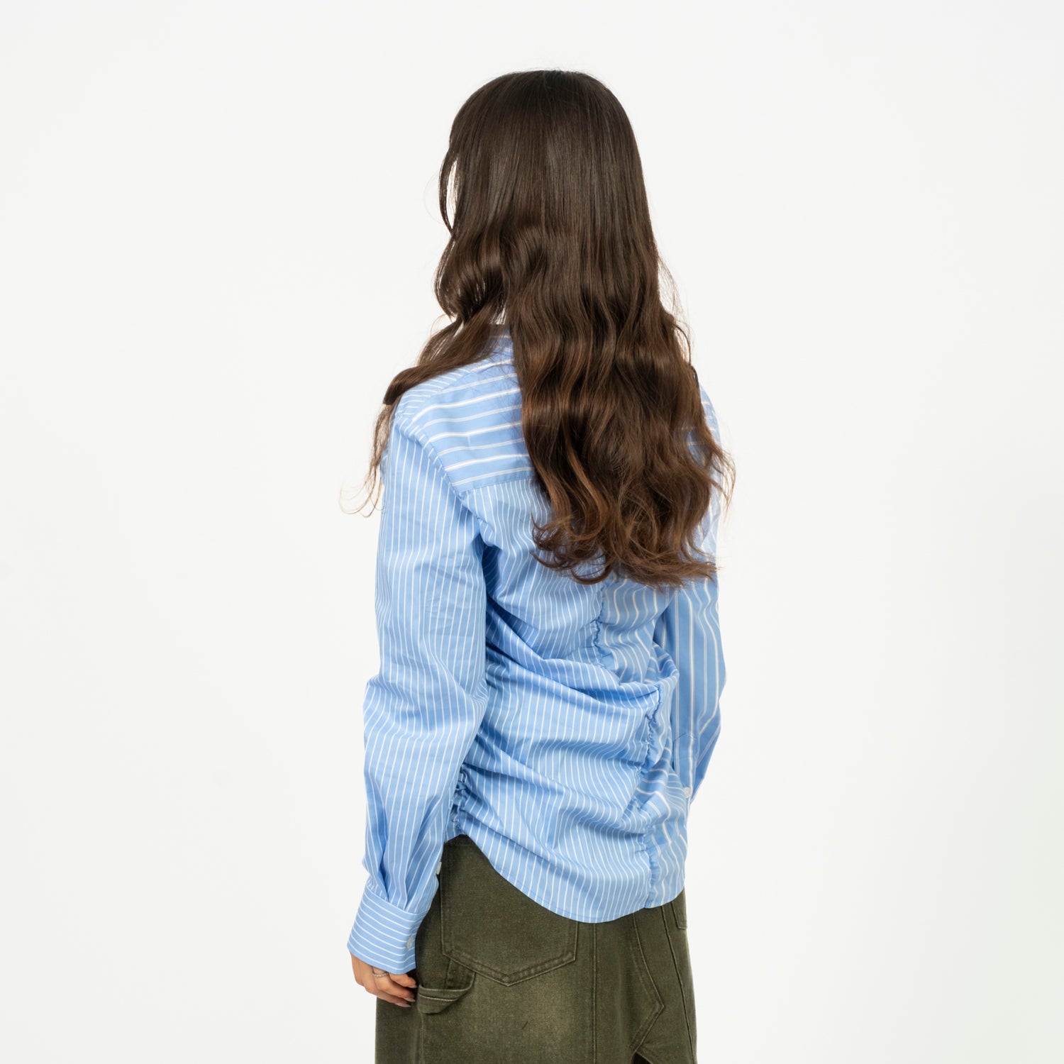 A regular-fit shirt softened with shirring that creates a gentle drape through the body. Two blue stripe patterns are combined for subtle contrast, finished with refined hardware and classic shell button detailing.