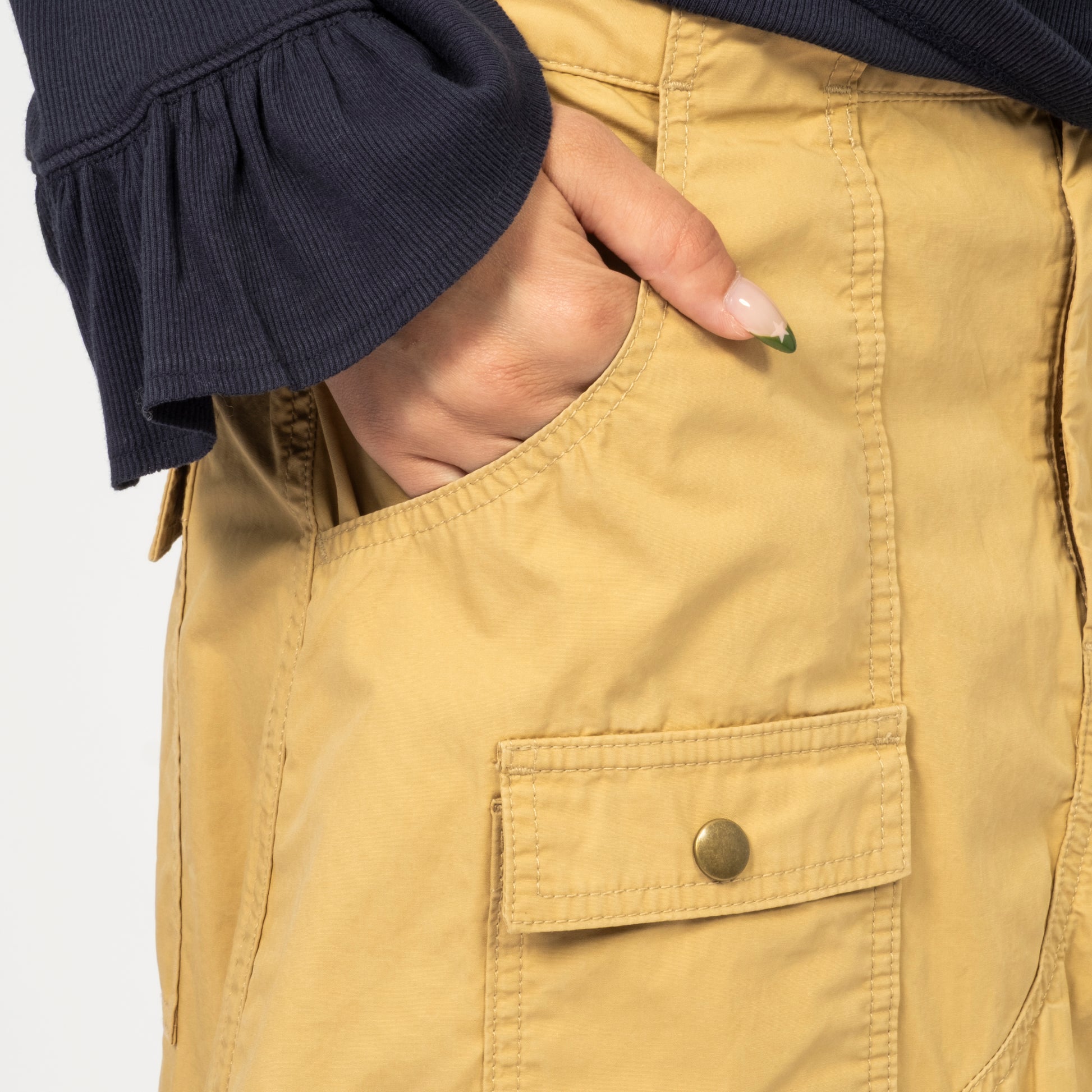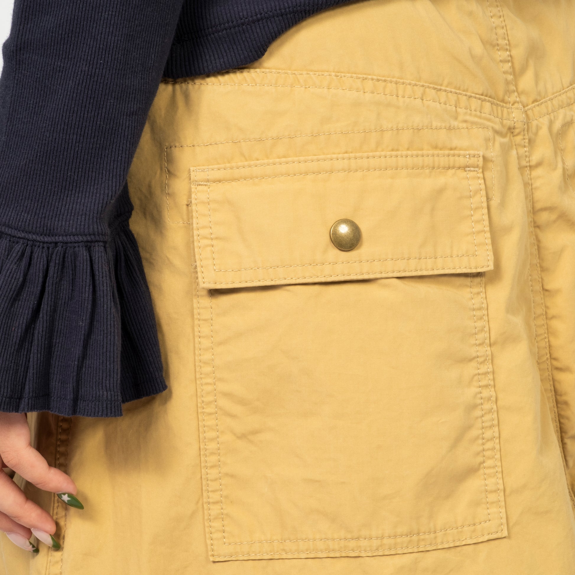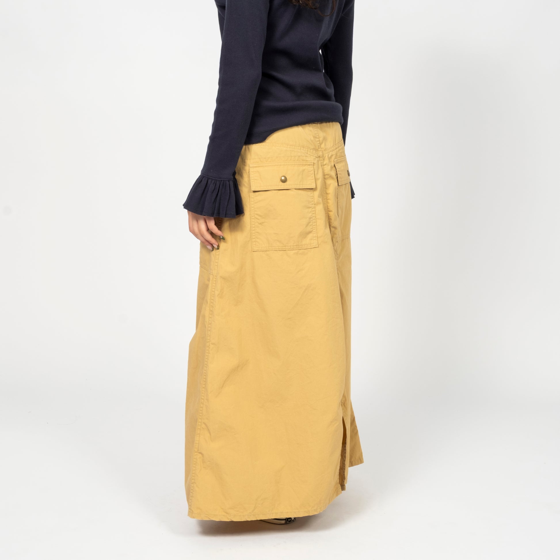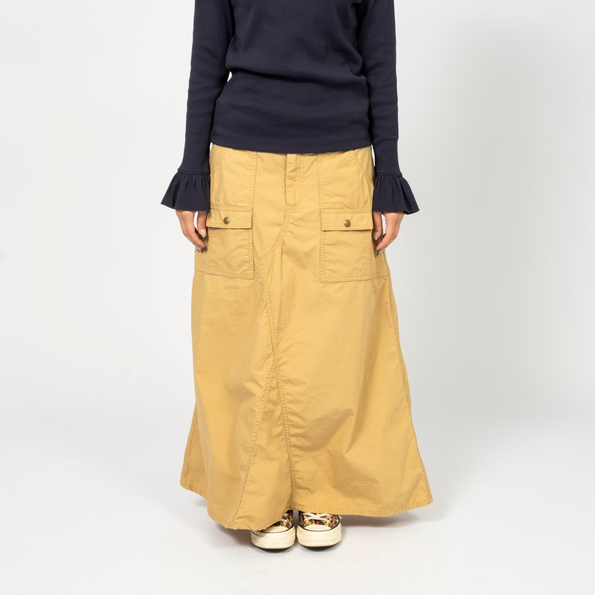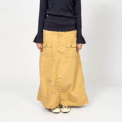 Inspired by the iconic bush pants that were essential in the 70s outdoor scene, these have been reimagined into skirts with a distinctive BEAMS BOY style. The design features pants that are carefully dismantled and opened to create the skirt, with the original stitching retained for an authentic touch. The vintage-inspired look is completed with antique gold buttons, adding a timeless, rugged finish.