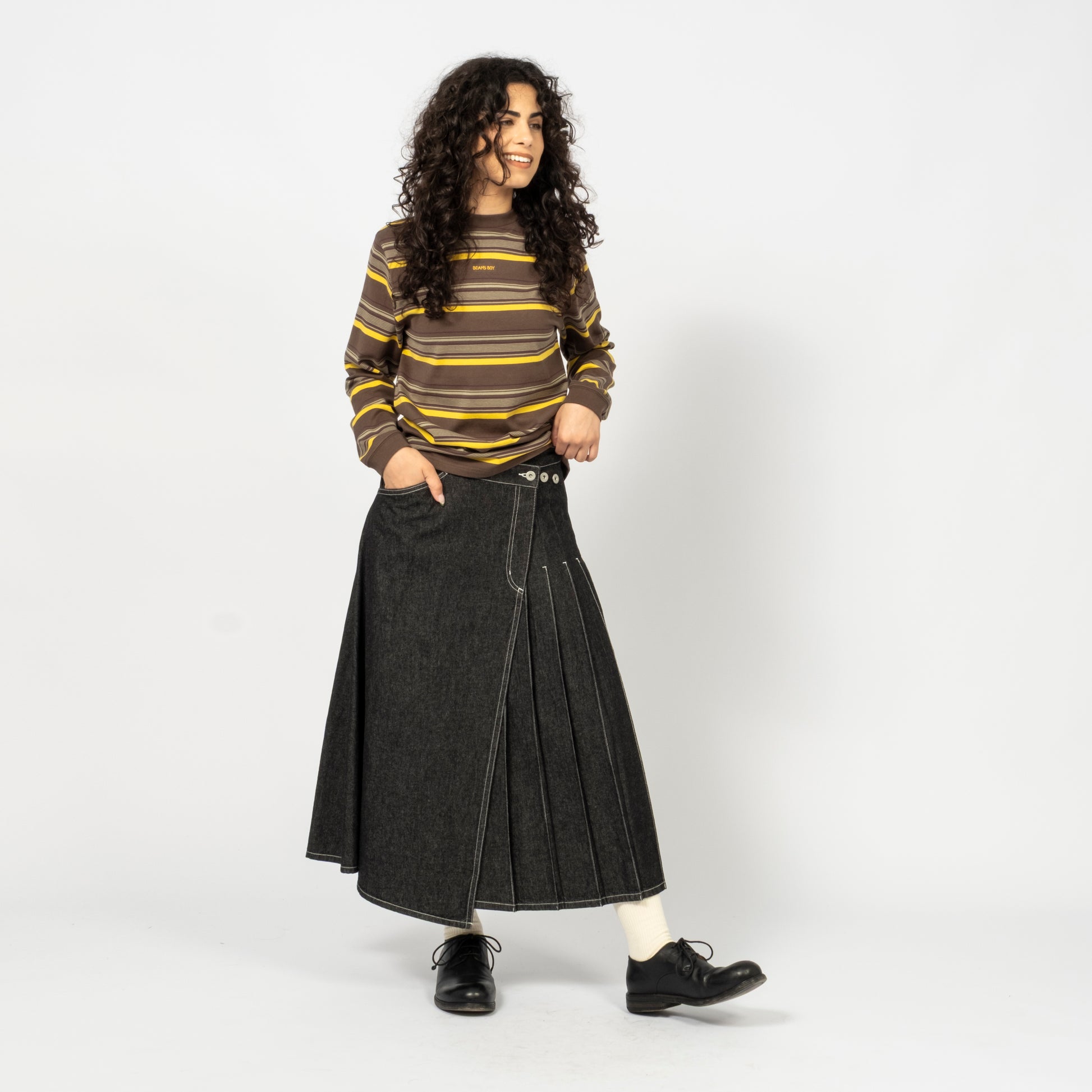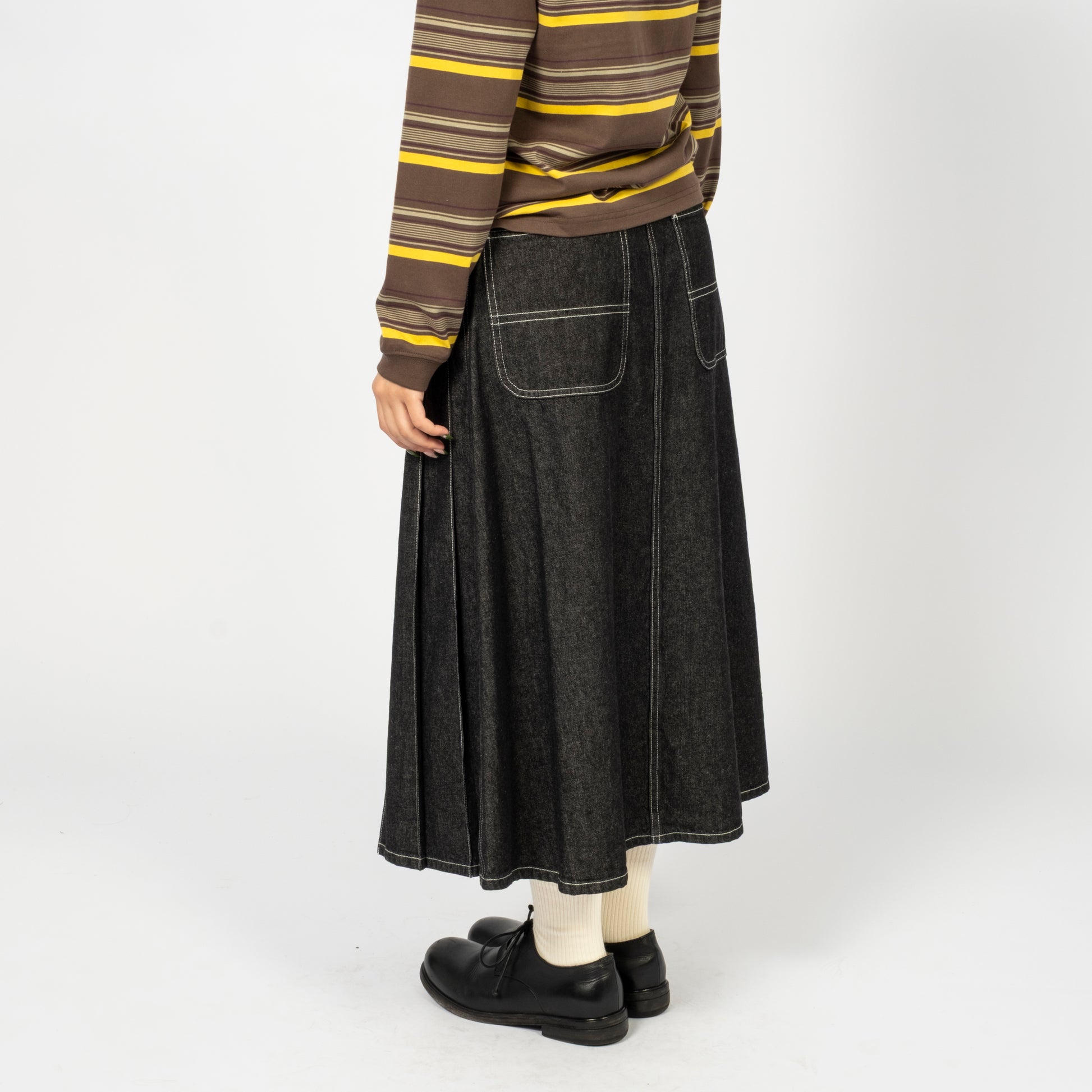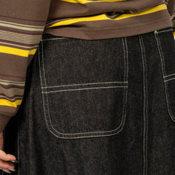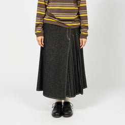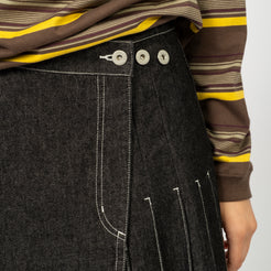 A fresh take on denim — this wrap skirt reinterprets pant details into a clean, modern design. With a flattering A-line silhouette and a refined drape, it brings an unexpected edge to everyday dressing.