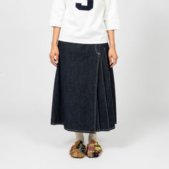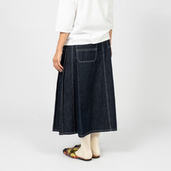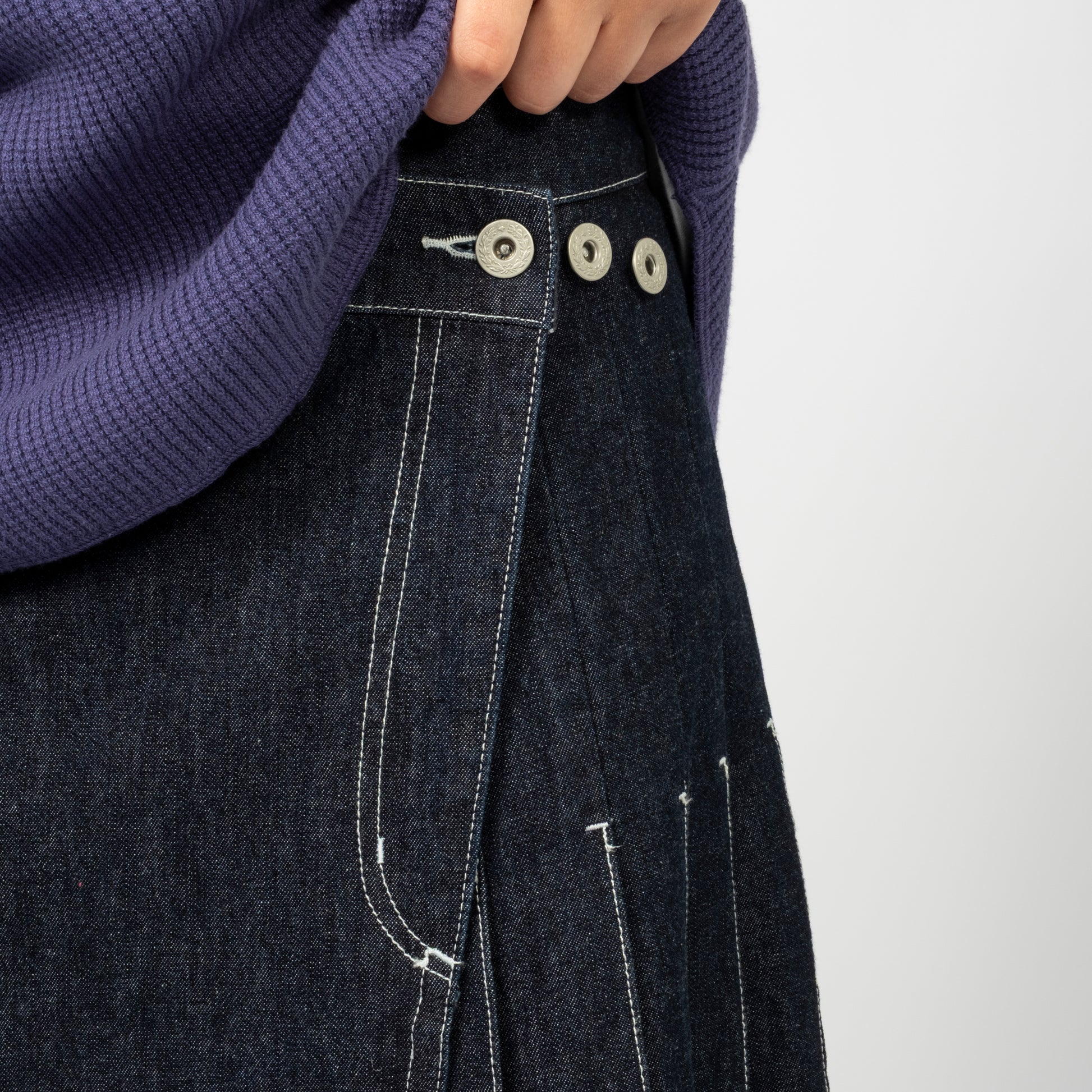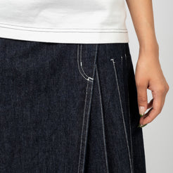 A fresh take on denim — this wrap skirt reinterprets pant details into a clean, modern design. With a flattering A-line silhouette and a refined drape, it brings an unexpected edge to everyday dressing.