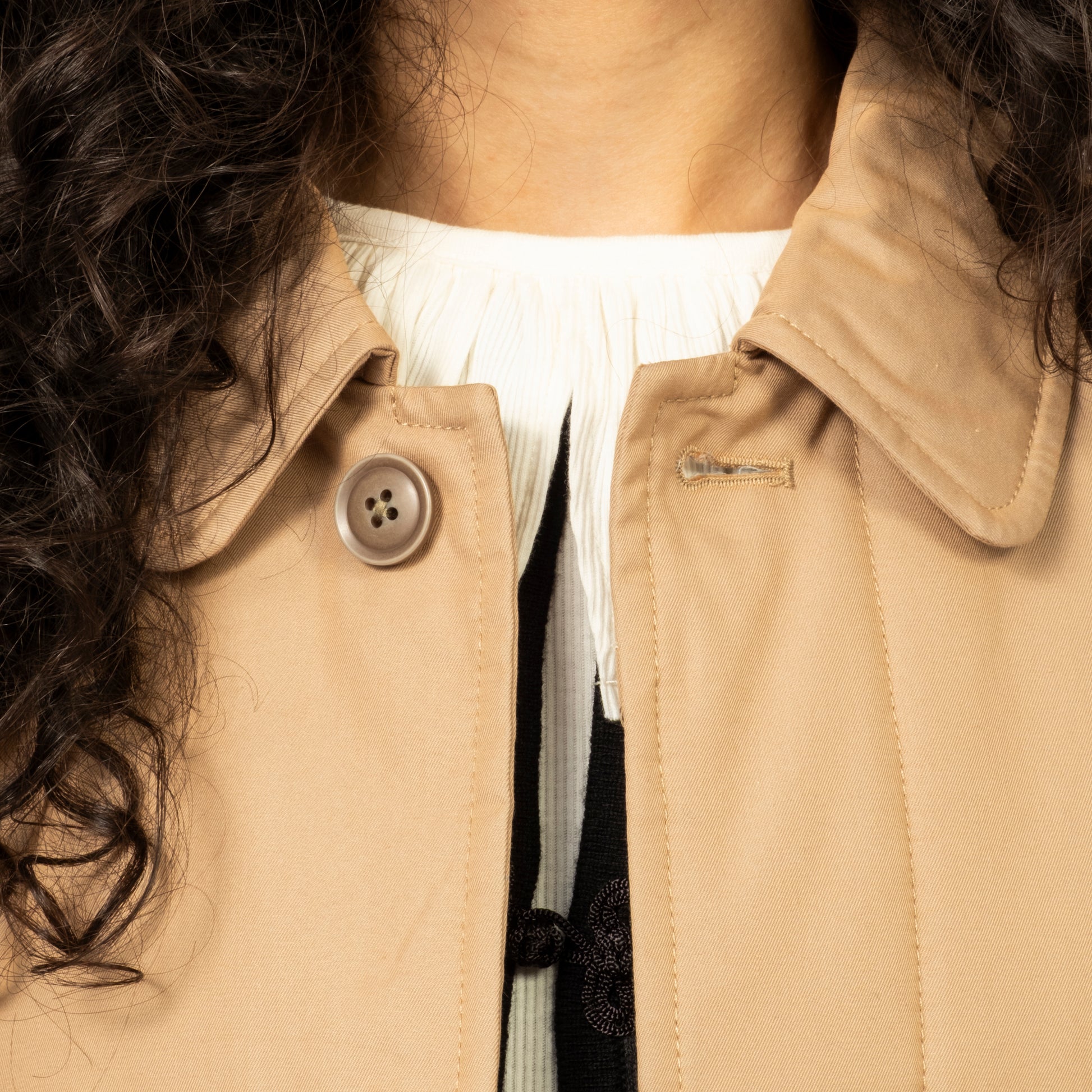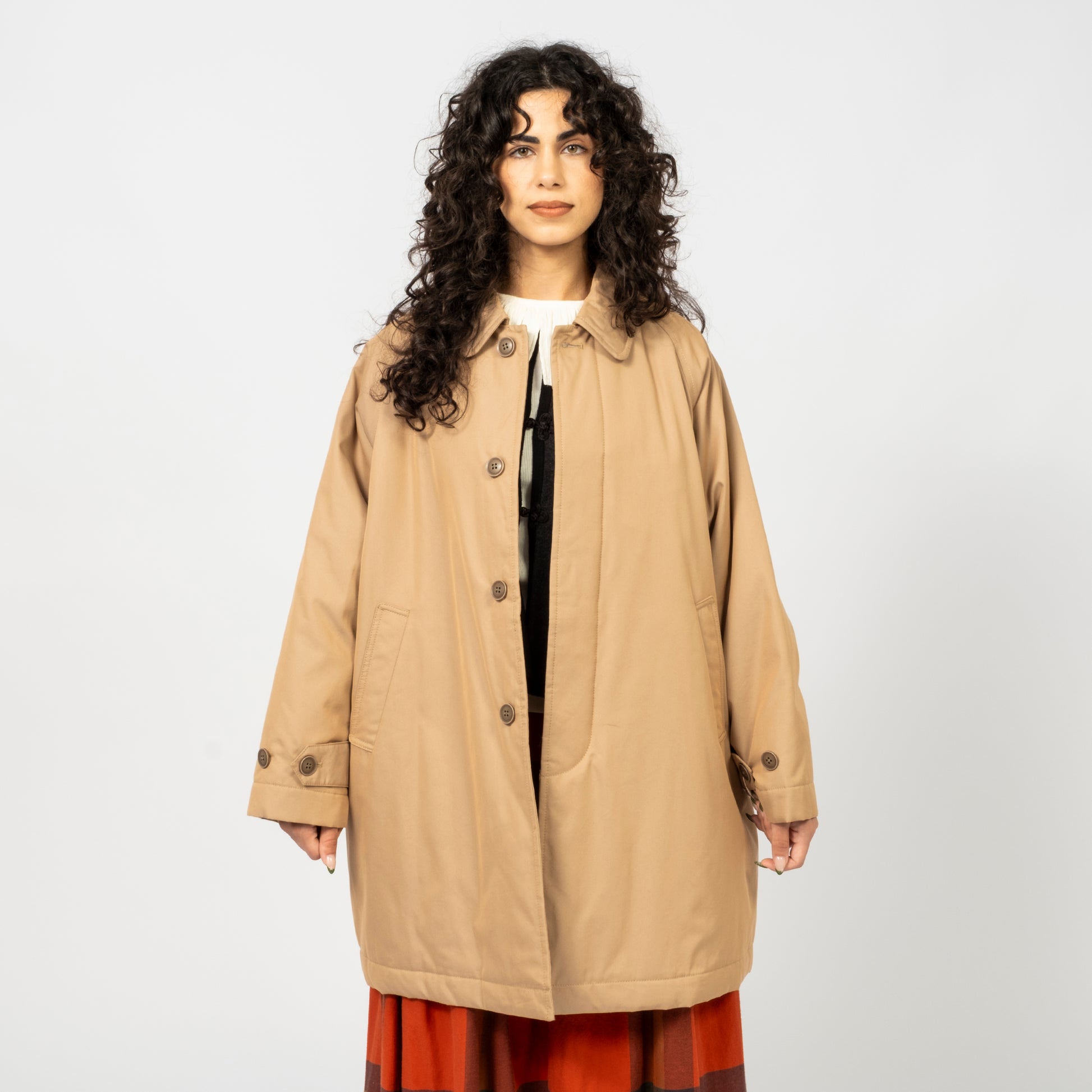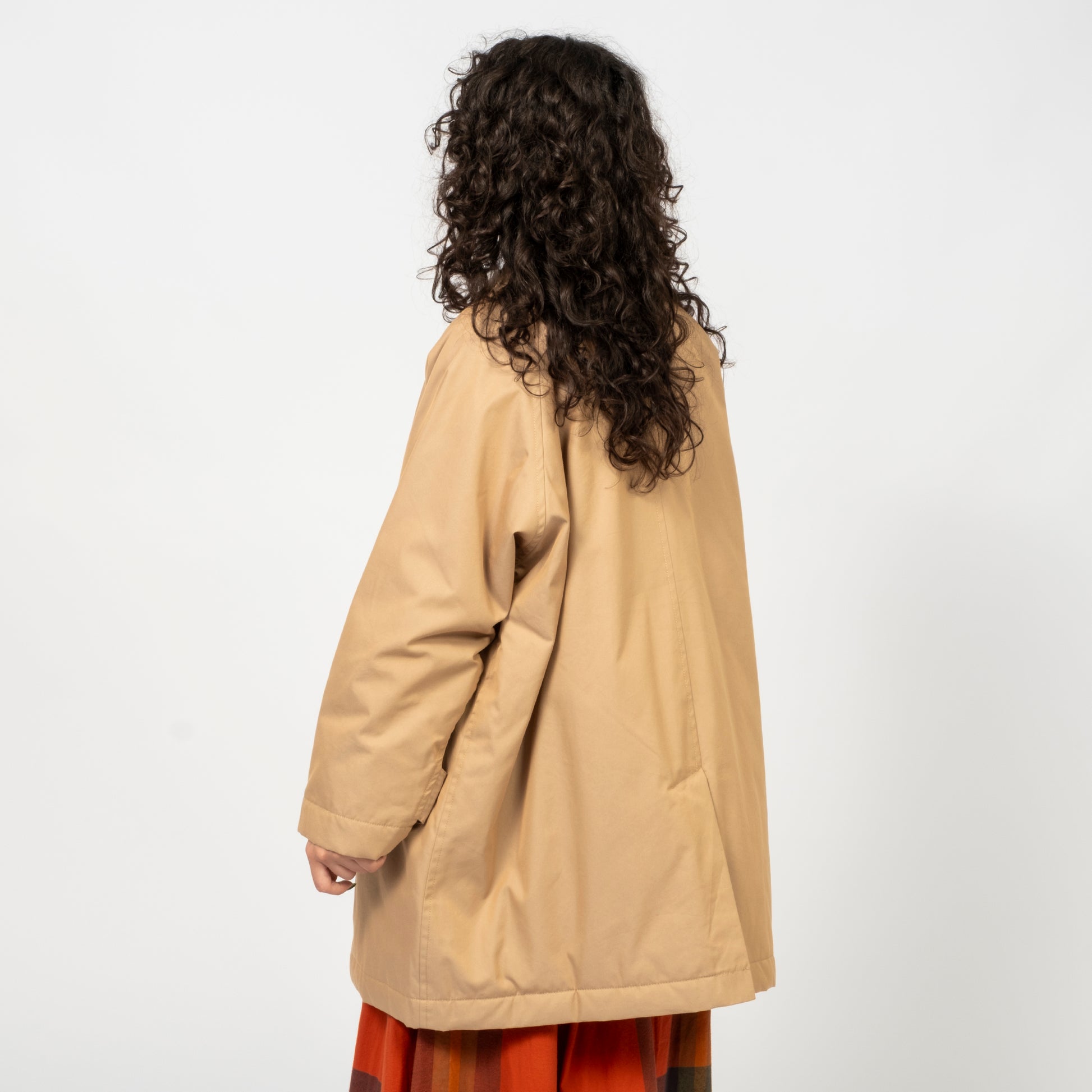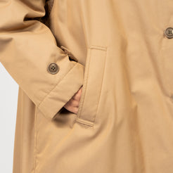 BEAMS BOY A luminous trench coat with a subtle iridescent sheen that shifts beautifully with the light, offering dept...