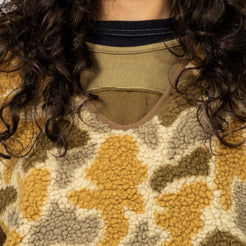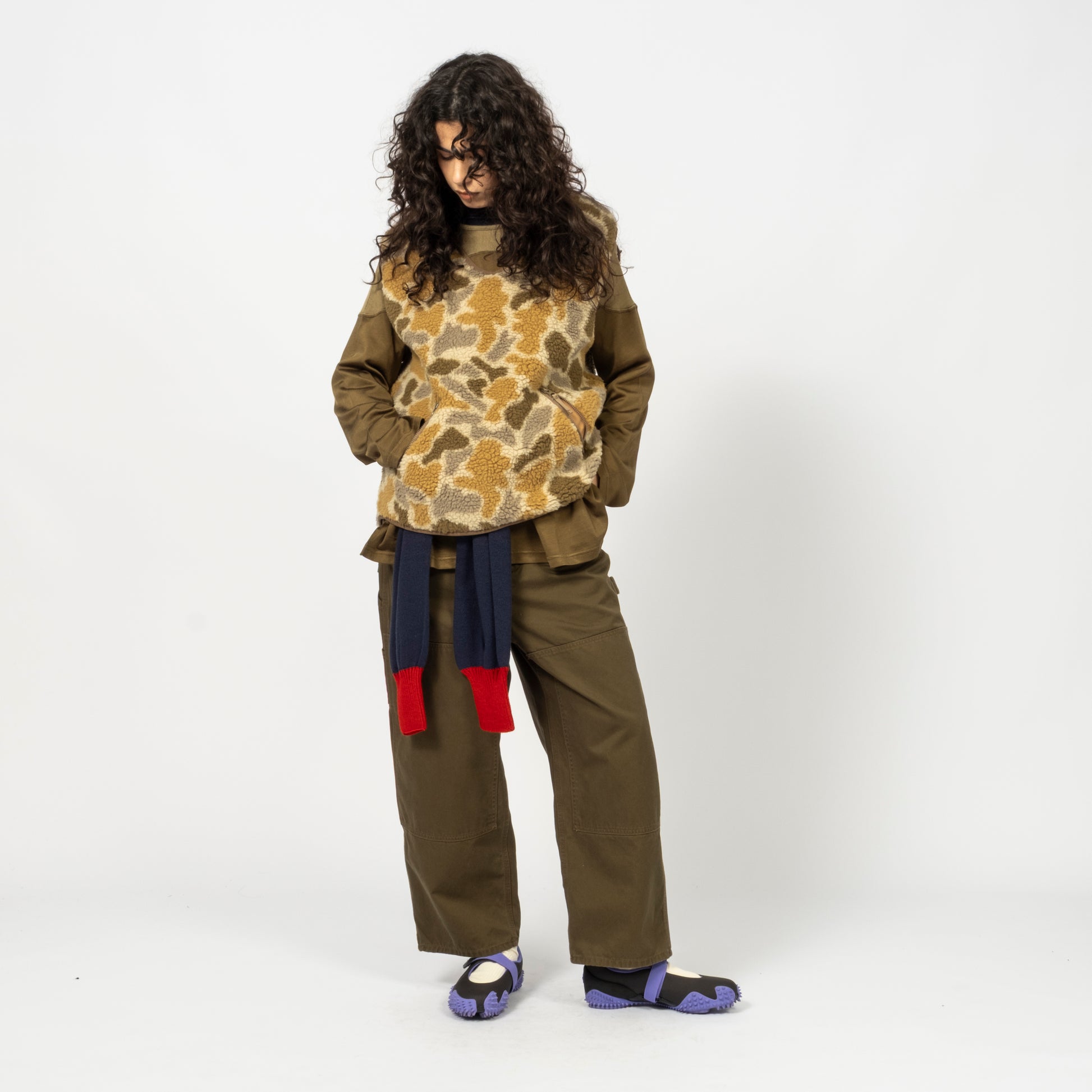 A cozy boa vest with nostalgic character, blending outdoor utility with playful texture. Offered in a soft, boyish camo and an ’80s/’90s knit-inspired patchwork—easy layers with quiet personality.