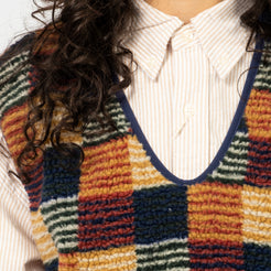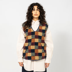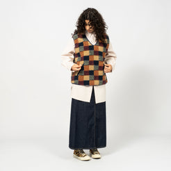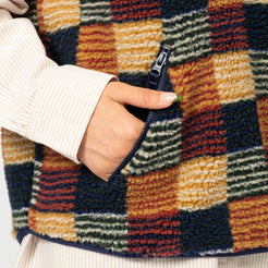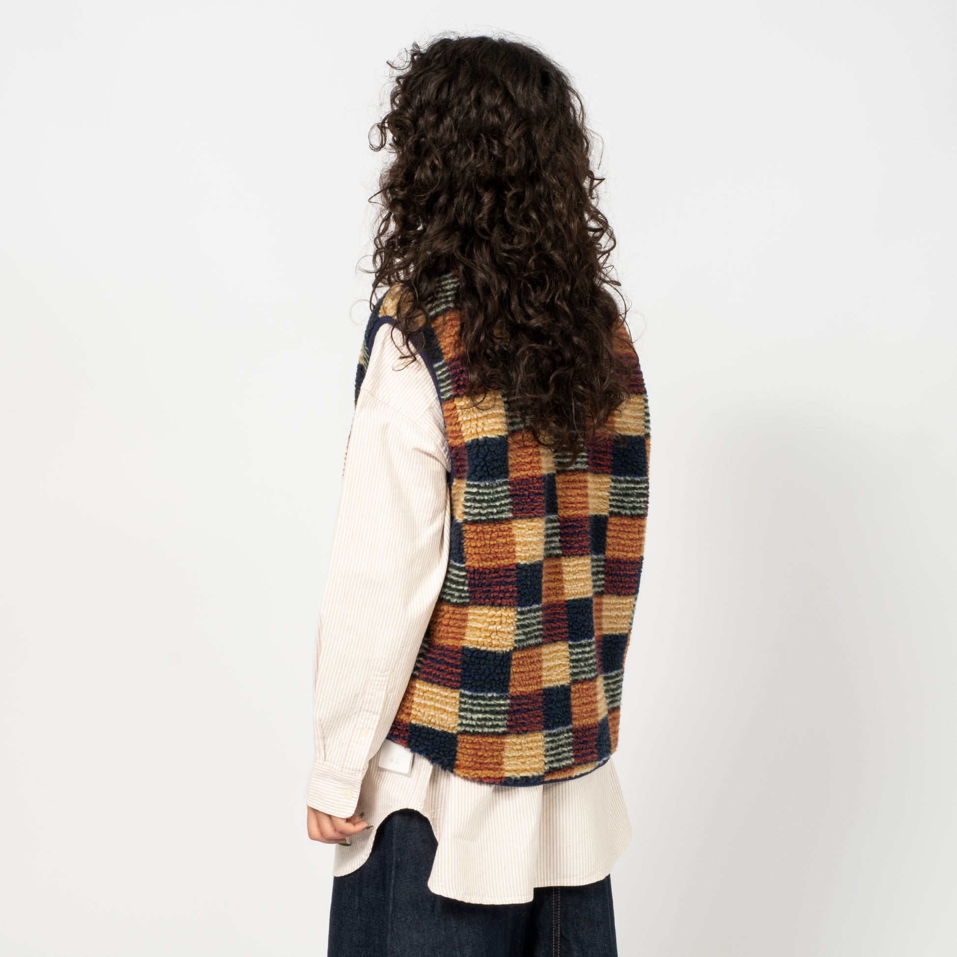 A cozy boa vest with nostalgic character, blending outdoor utility with playful texture. Offered in a soft, boyish camo and an ’80s/’90s knit-inspired patchwork—easy layers with quiet personality.