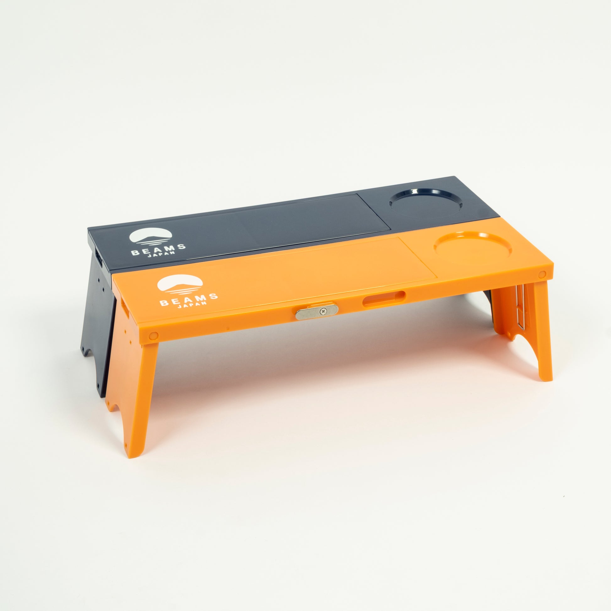 A custom-made outdoor table created by ISETO, specialists in practical plastic household goods. The tabletop includes a built-in drink holder, and the removable tray doubles as a plate for easy outdoor dining. Two tables can be connected side-by-side using the metal joints on the sides, and the foldable legs allow the whole piece to store compactly. A lightweight, versatile table designed for camping and all kinds of outdoor settings.