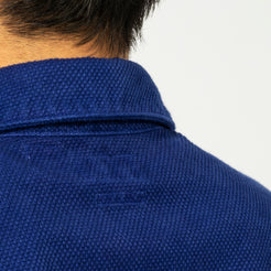 Crafted from an iconic sashiko fabric traditionally used for judo uniforms, this piece balances durability with a soft hand feel that holds its shape over time. Each garment is sewn in off-white, then individually hand-dyed in European work blue indigo, resulting in subtle variation from piece to piece.