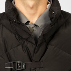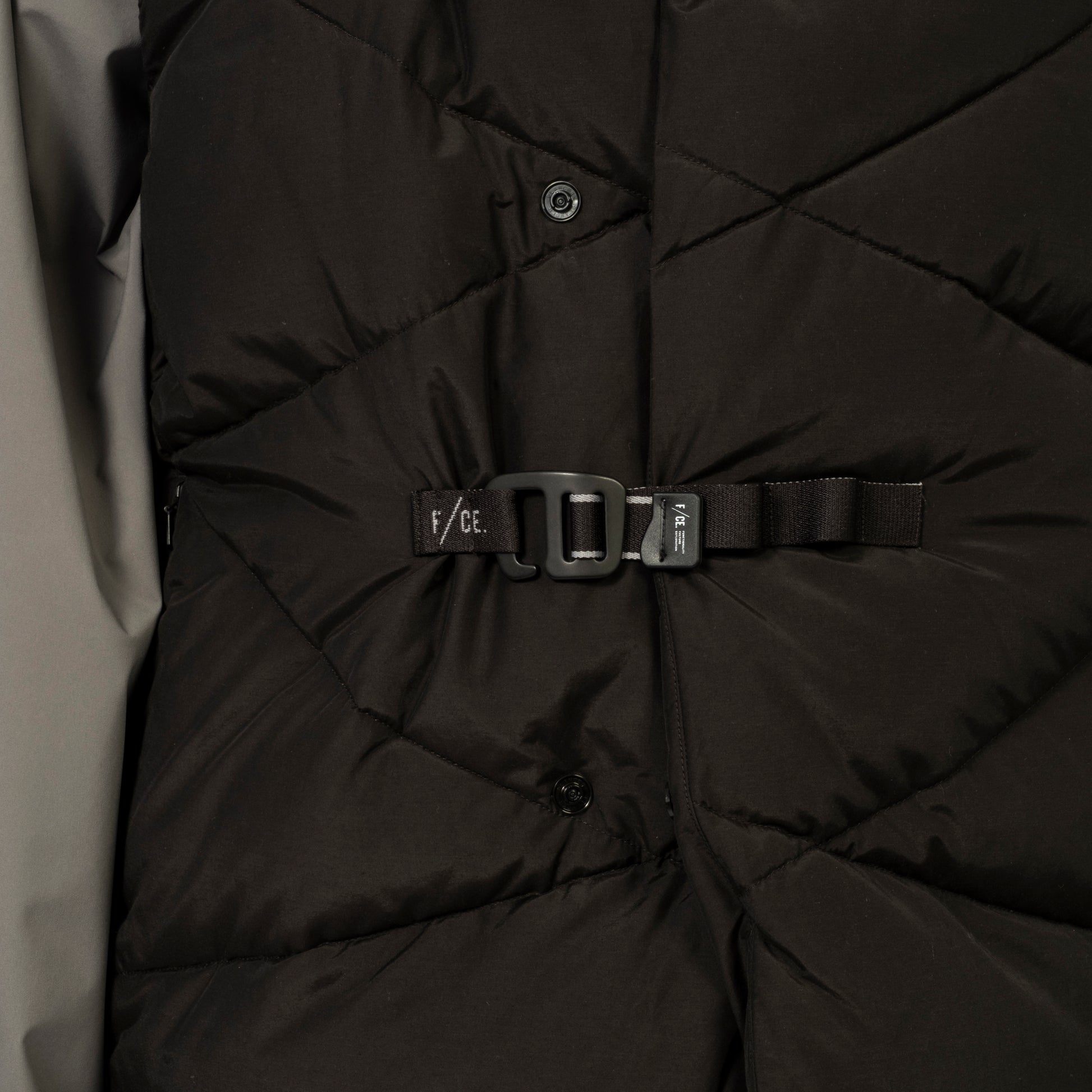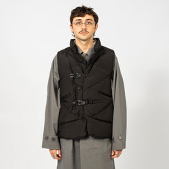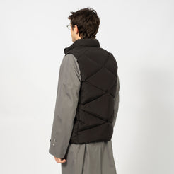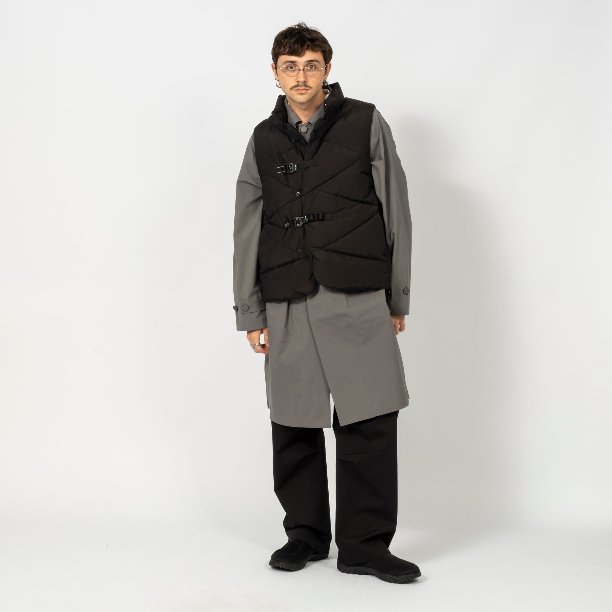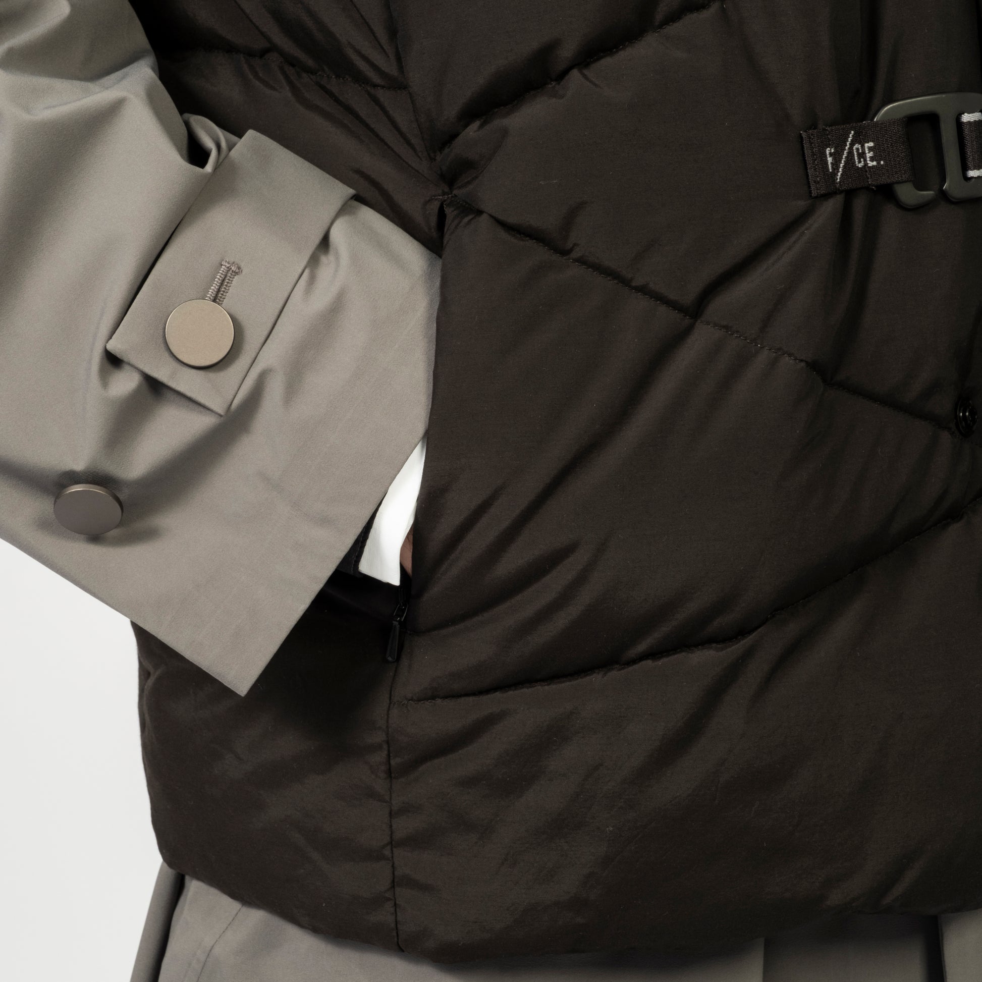 A quilted vest from the recycled-down series, filled with 650FP down that’s carefully reclaimed and rewashed for a new life. The high-density shell blends recycled nylon with organic cotton for a dry matte finish, while Belgium-inspired diamond quilting adds a quiet, modern sharpness. Concealed zip pockets and an adjustable front buckle keep the silhouette clean and customisable, finished in a palette of soft, muted tones with a touch of lavender.