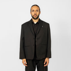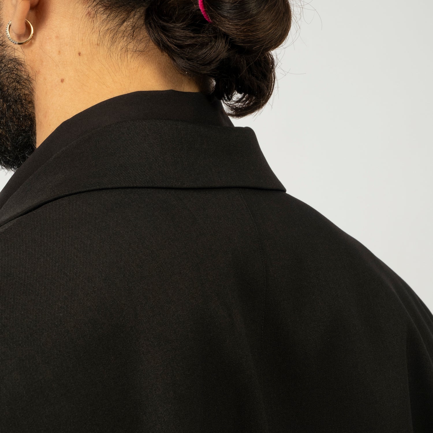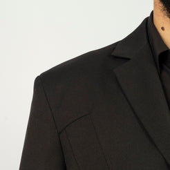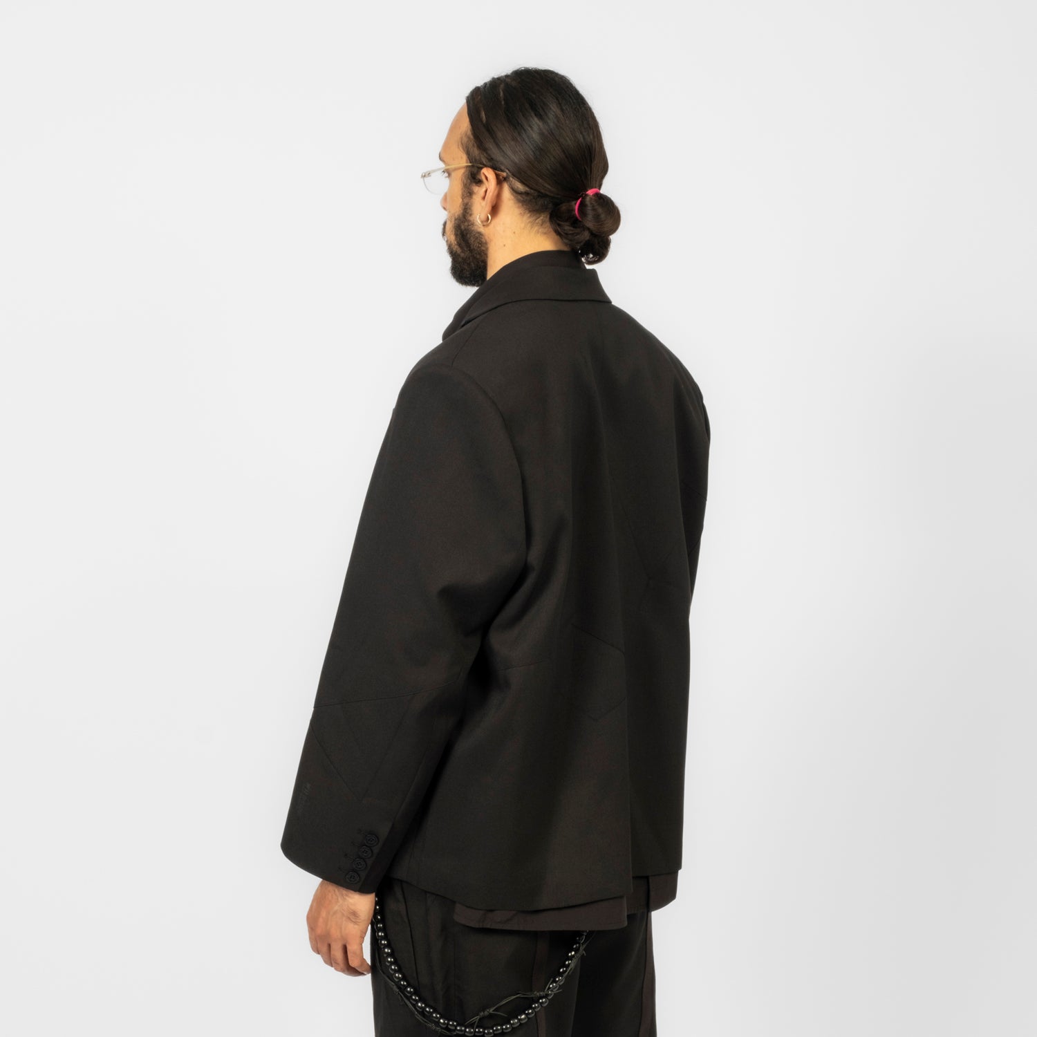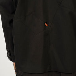 A formal tailored piece reimagined through transformation. Built with classic suiting techniques, the silhouette features a strong, three-dimensional shoulder line and expanded proportions. Subtle seam lines trace rose-branch motifs across the body, while convertible details allow the form to shift between structured and expressive.