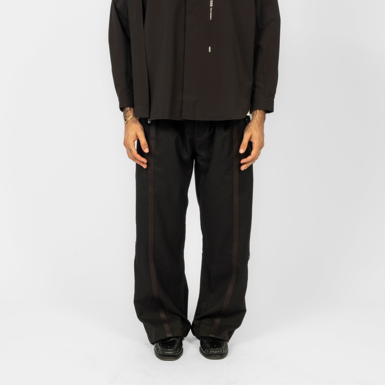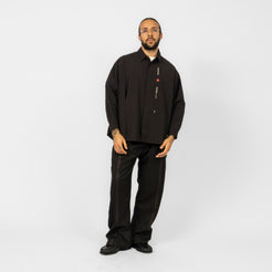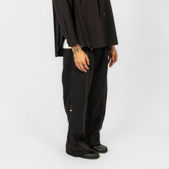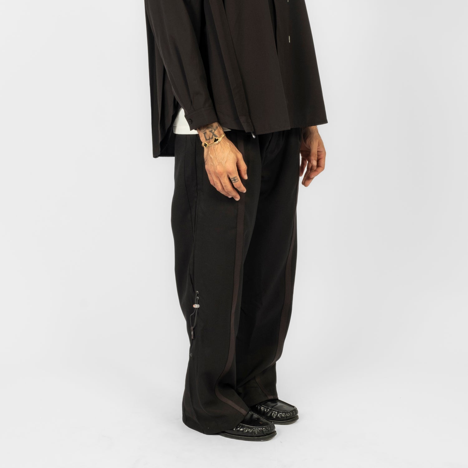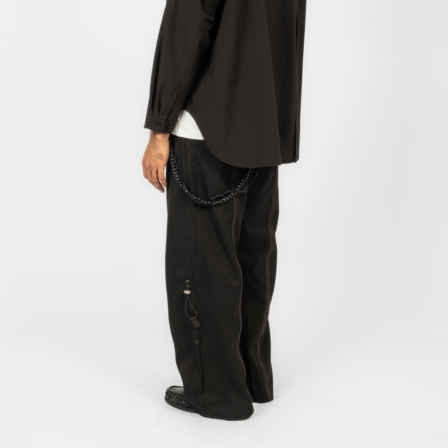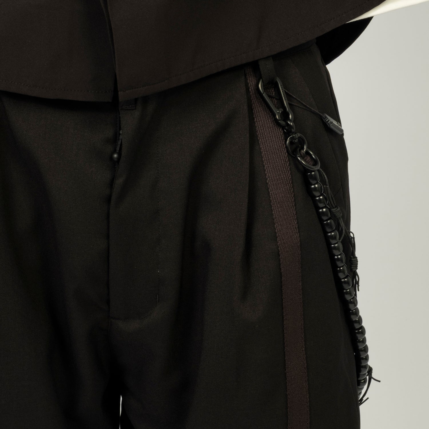 A straight A-line trouser with a transformed silhouette, designed to shift proportion through adjustable detailing. The knee drawcord system alters the outer length and is secured with a spring stopper, while asymmetric belt loops at the right waist allow a detachable Thorns Chain to hook in as a functional accent. Finished with a dry, structured hand feel that adds visual depth and everyday ease.