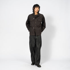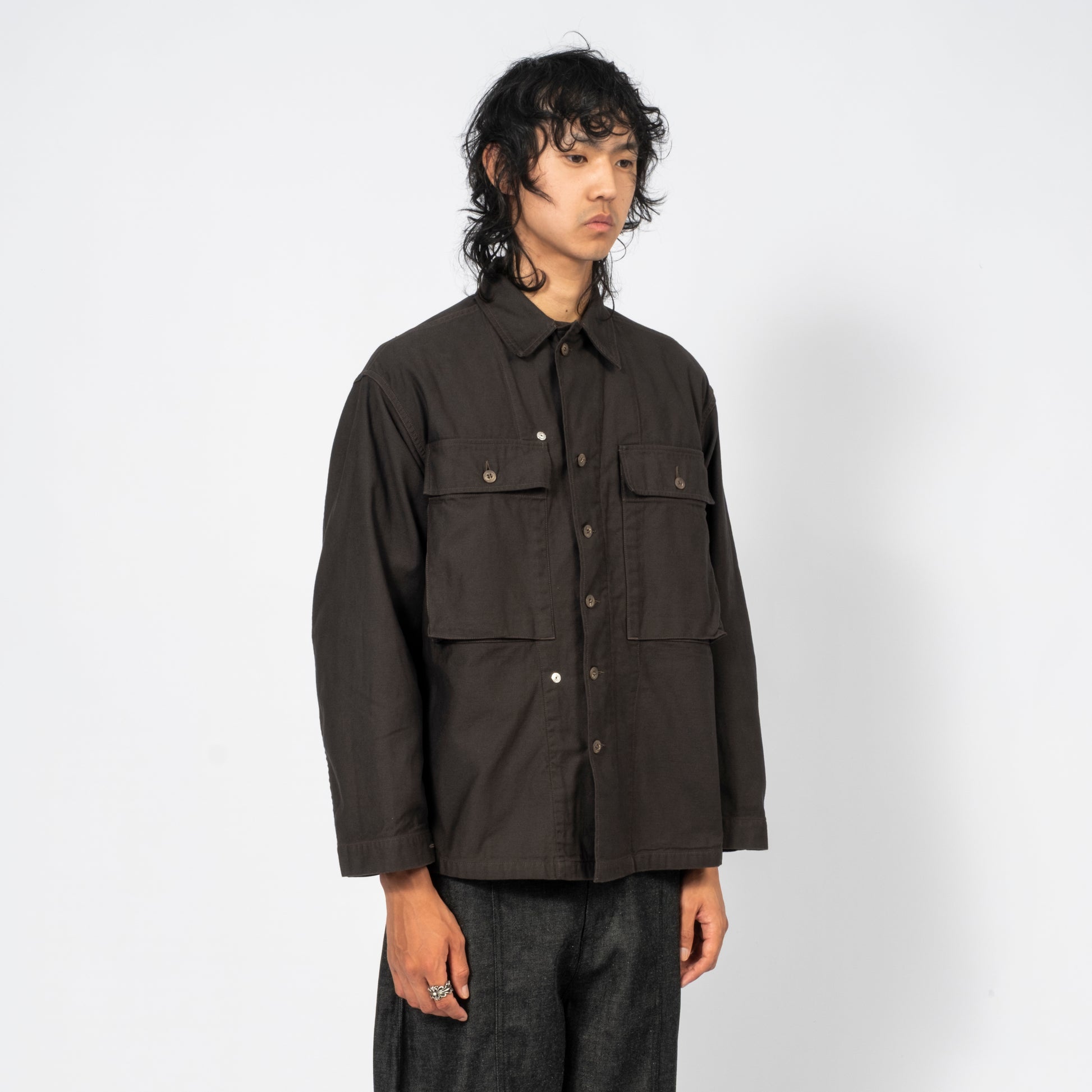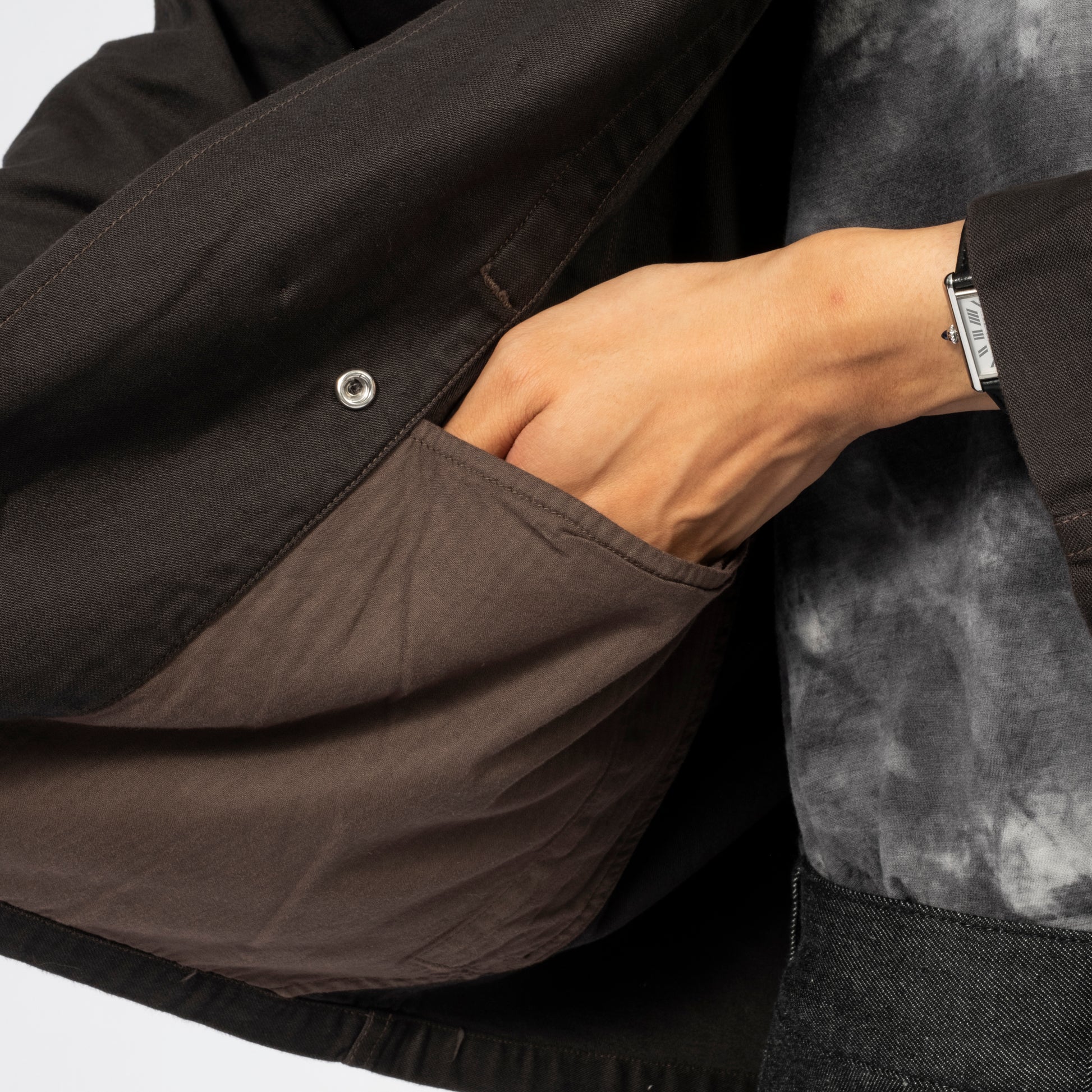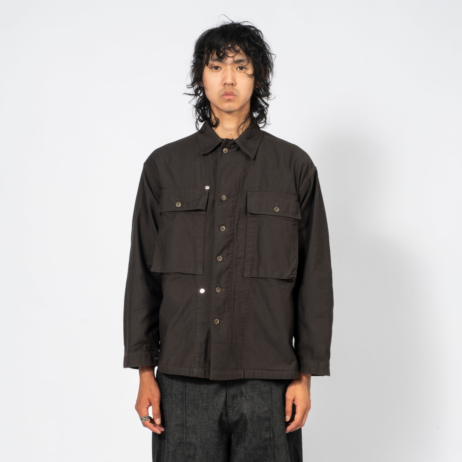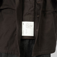 Inspired by the 1940s US Army M-43 HBT jacket, updated with a fuller silhouette, side slash pockets for utility, and a gas-flap front detail. Cut from back satin fabric woven with uneven weft yarns, it develops distinctive character through dyeing and wear. Finished with botanical hybrid dyes, each colour draws from natural pigments.