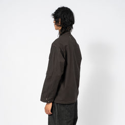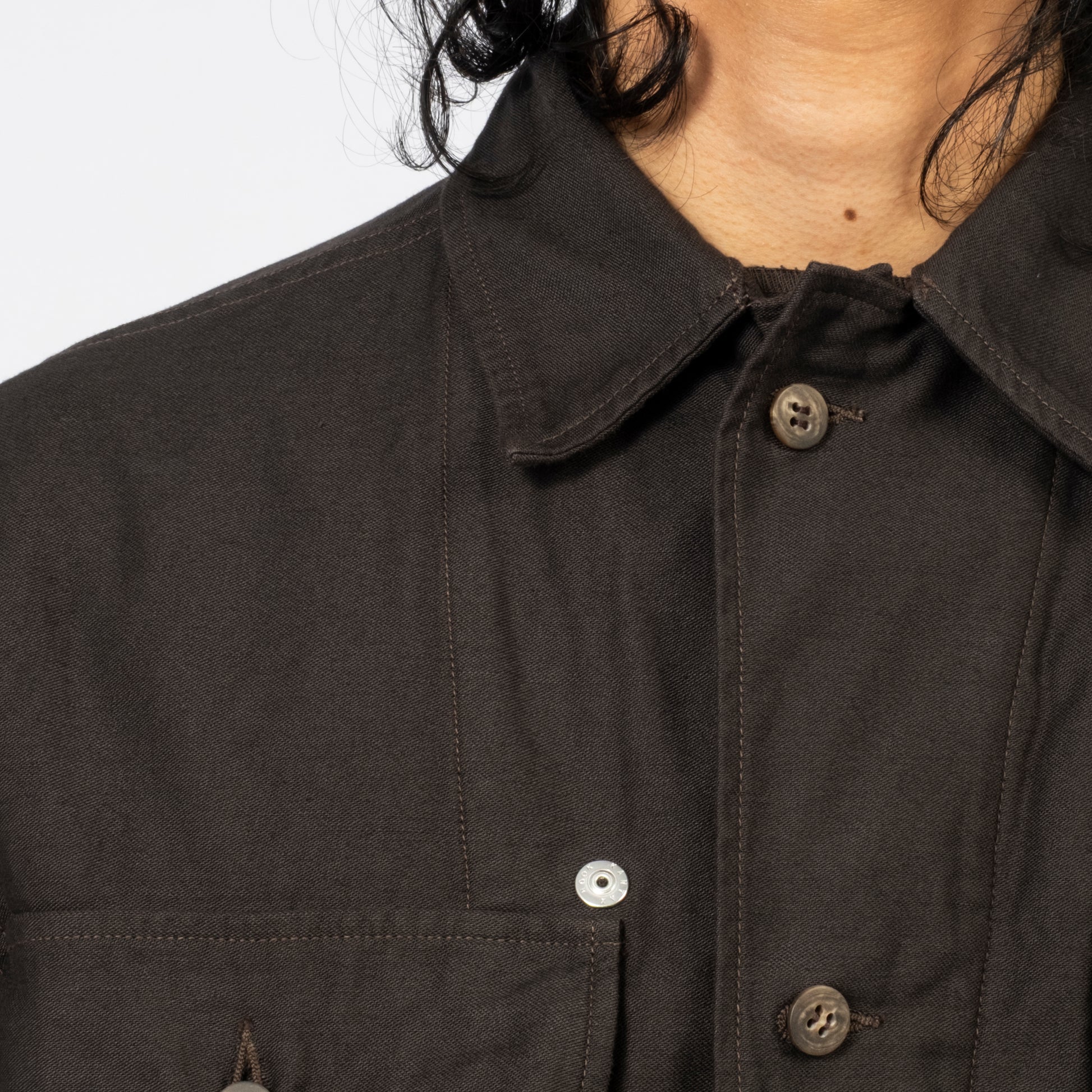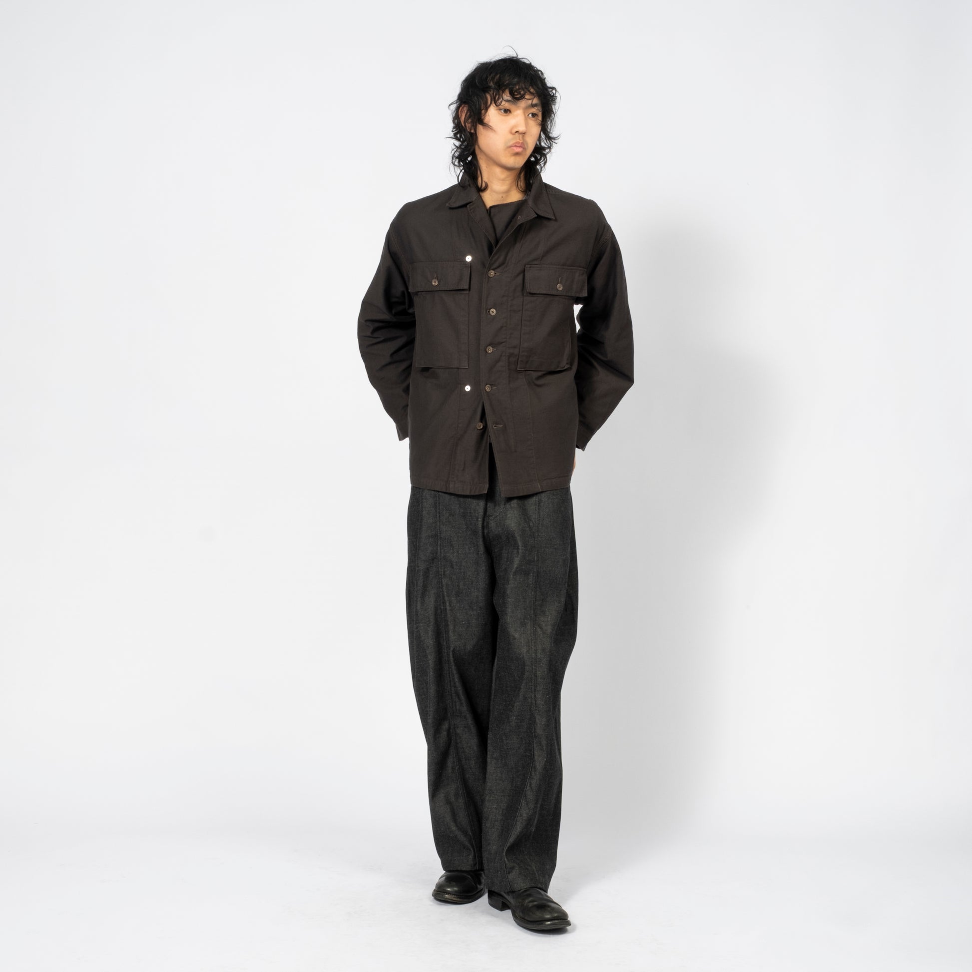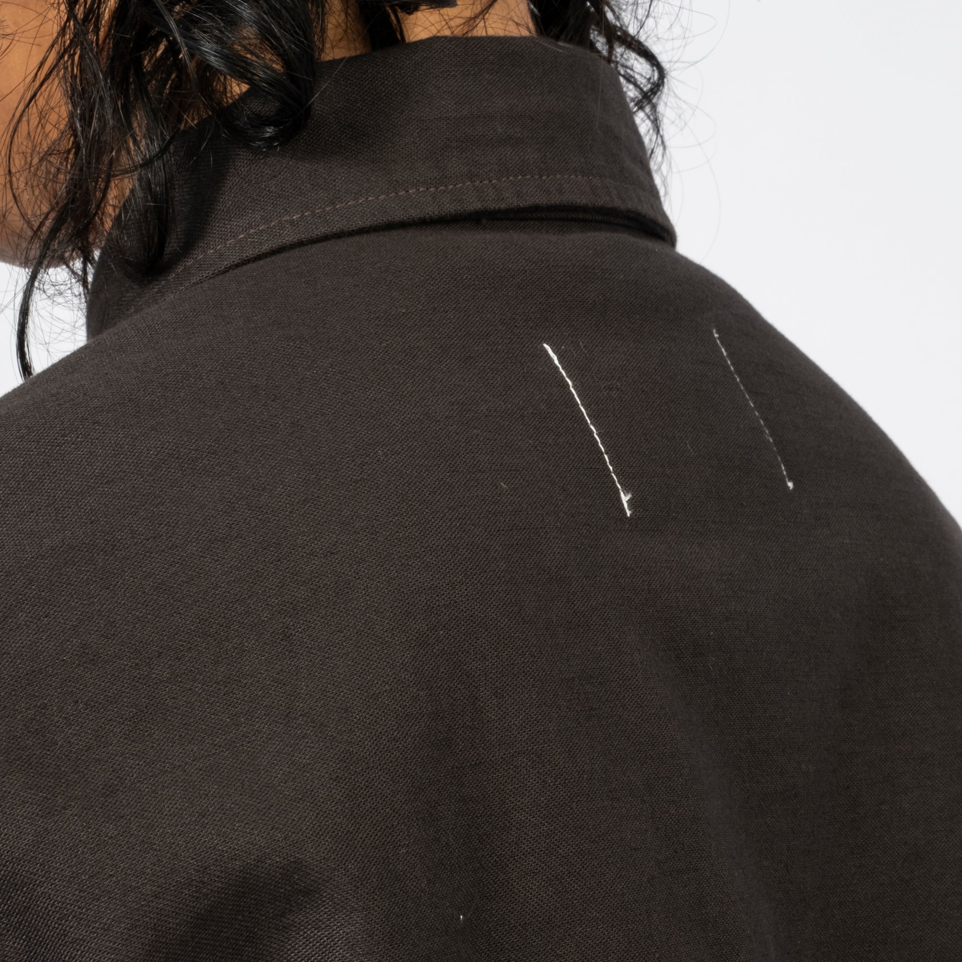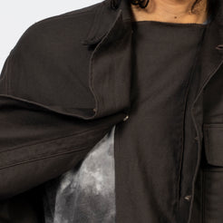 Inspired by the 1940s US Army M-43 HBT jacket, updated with a fuller silhouette, side slash pockets for utility, and a gas-flap front detail. Cut from back satin fabric woven with uneven weft yarns, it develops distinctive character through dyeing and wear. Finished with botanical hybrid dyes, each colour draws from natural pigments.