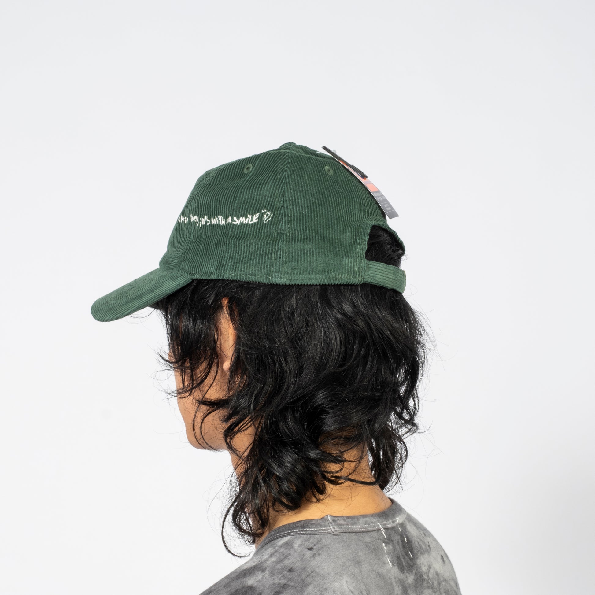 A soft corduroy baseball cap embroidered with a simple message for peace: “PEACE BEGINS WITH A SMILE” alongside the brand’s concept “LIKE ANN INN.” Thick corduroy gives it structure and texture, while an adjustable back strap makes it easy for anyone to wear, any day.