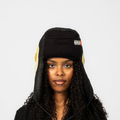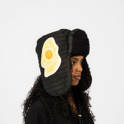 A pilot cap constructed from three different fabric types, designed to deliver strong structure and volume through layered padding. Each piece is carefully handmade by Japanese hat artisans, then finished with leather “fried-egg” patches at the sides, individually painted by LEH Atelier, giving the cap a highly artistic, one-of-a-kind presence.