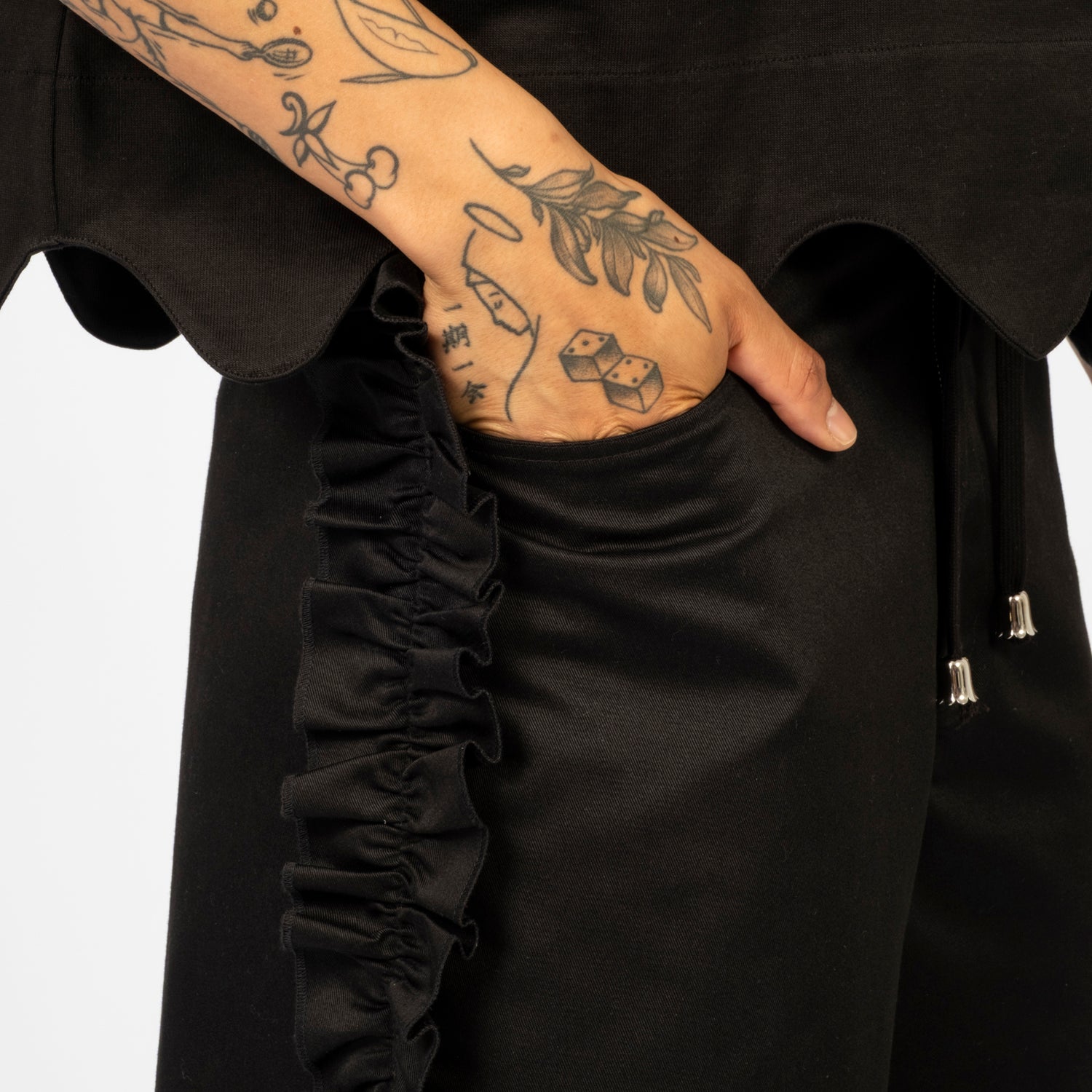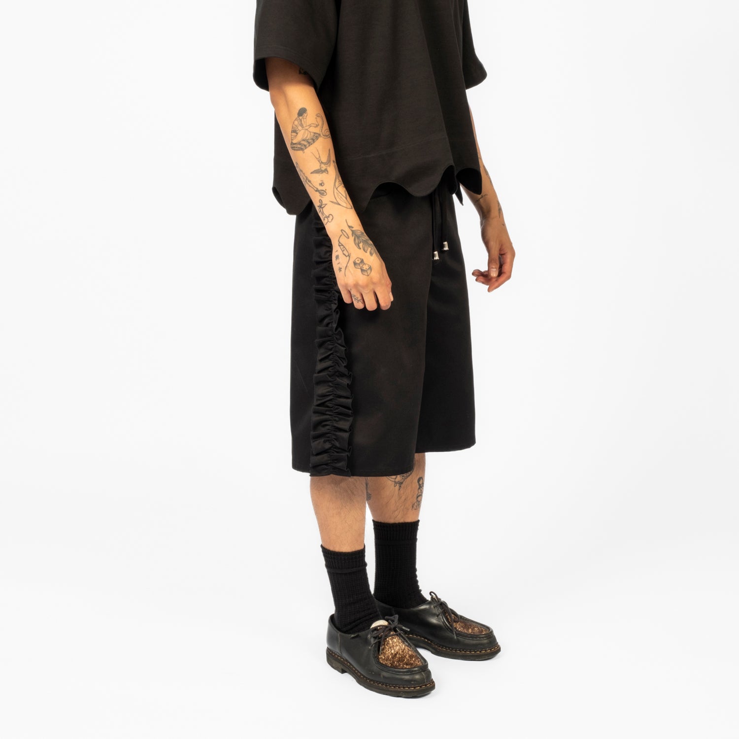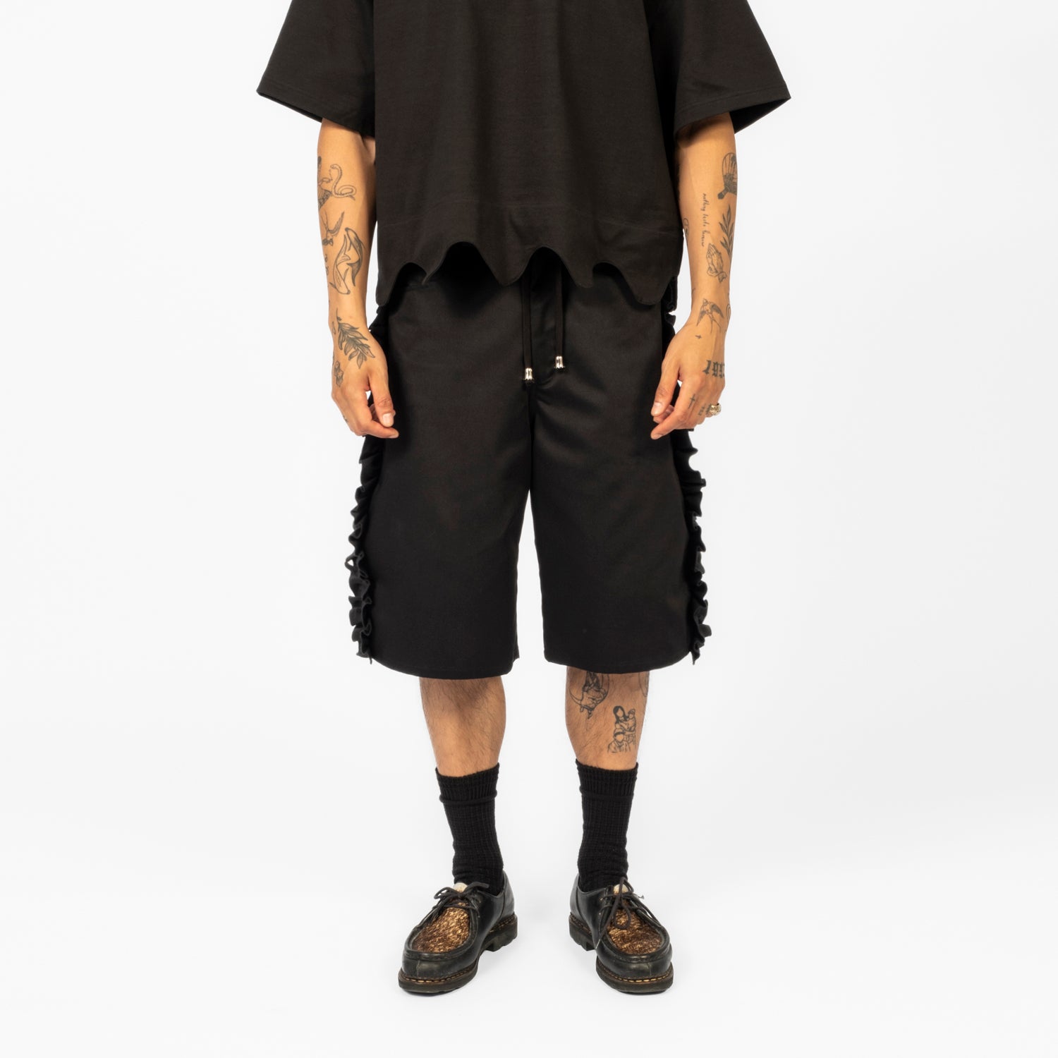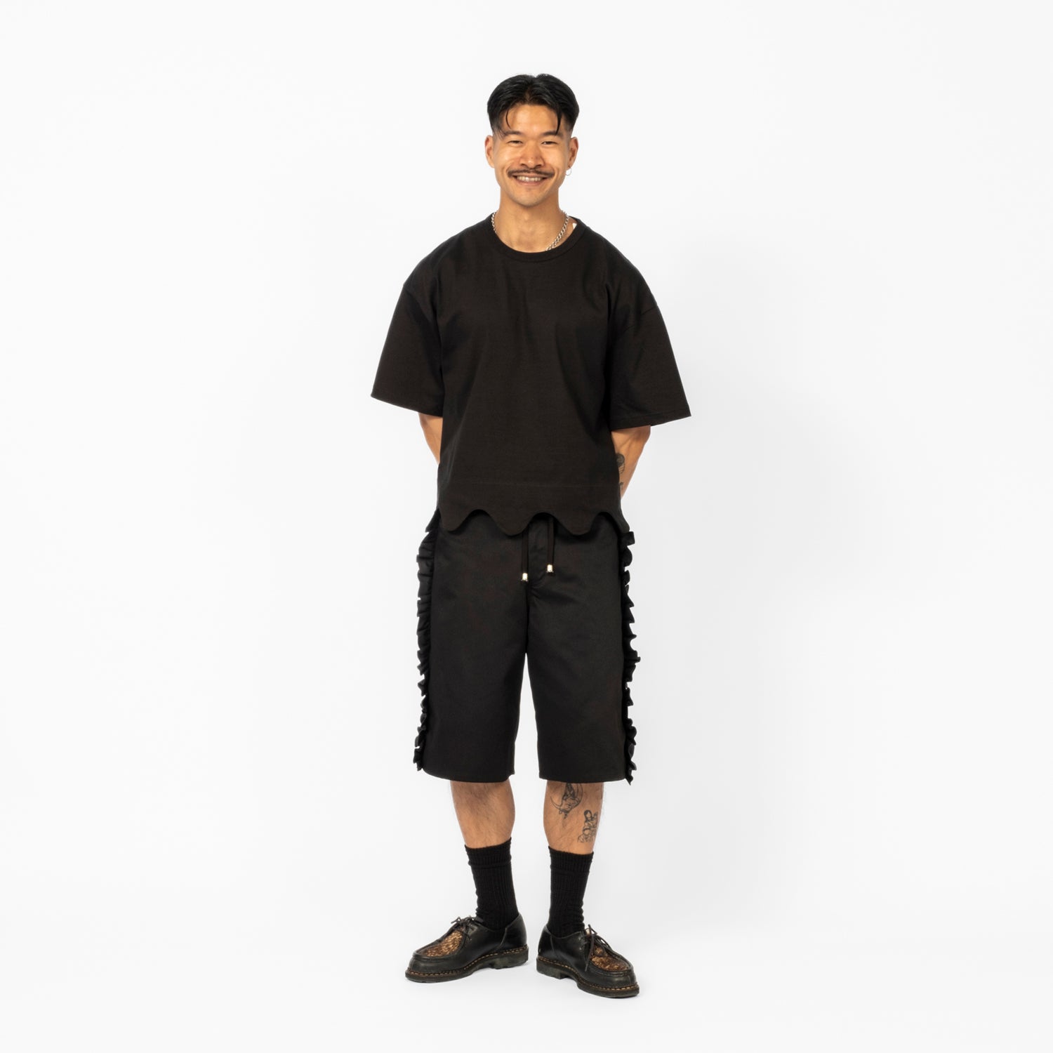 This short-sleeve shirt features a scalloped hem and round collar. Made from moderately thick, resilient cotton, it has a cool, linen-like feel. The shorter length and wider fit make it versatile for various body types, and it's perfect for both men and women.