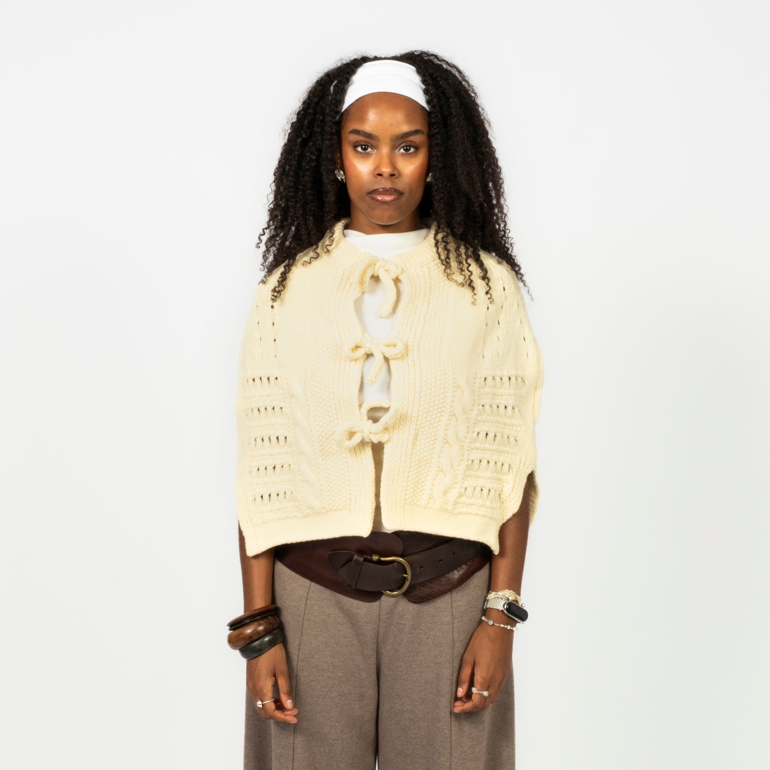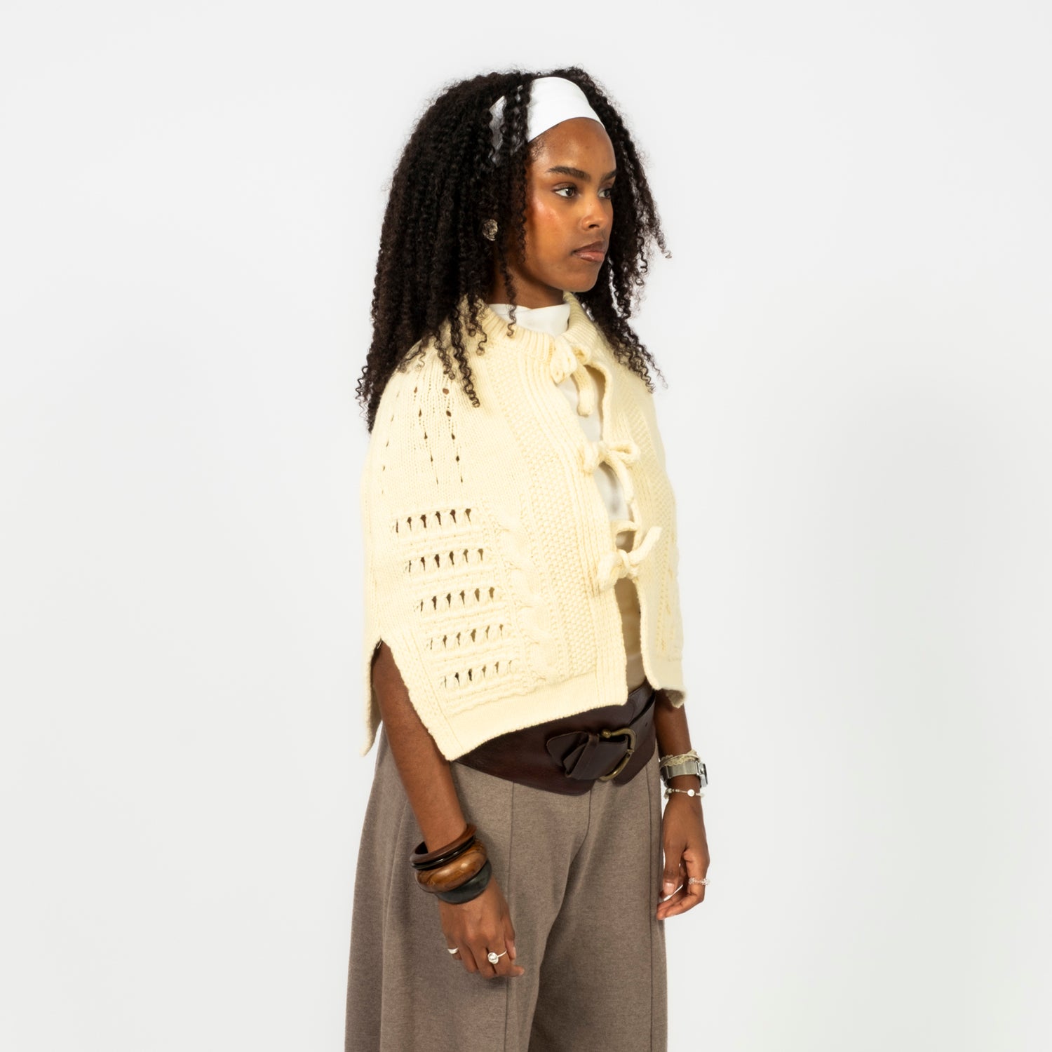 A sculptural cape inspired by the traditional British Gunsey knit, reworked through a refined pattern arrangement. Knit from premium merino wool, it feels warm and voluminous with a light, soft hand, making it easy to layer across seasons.
