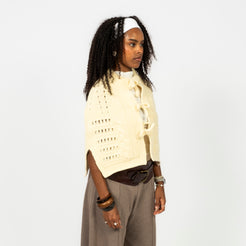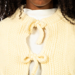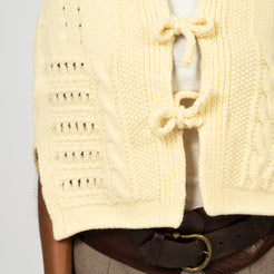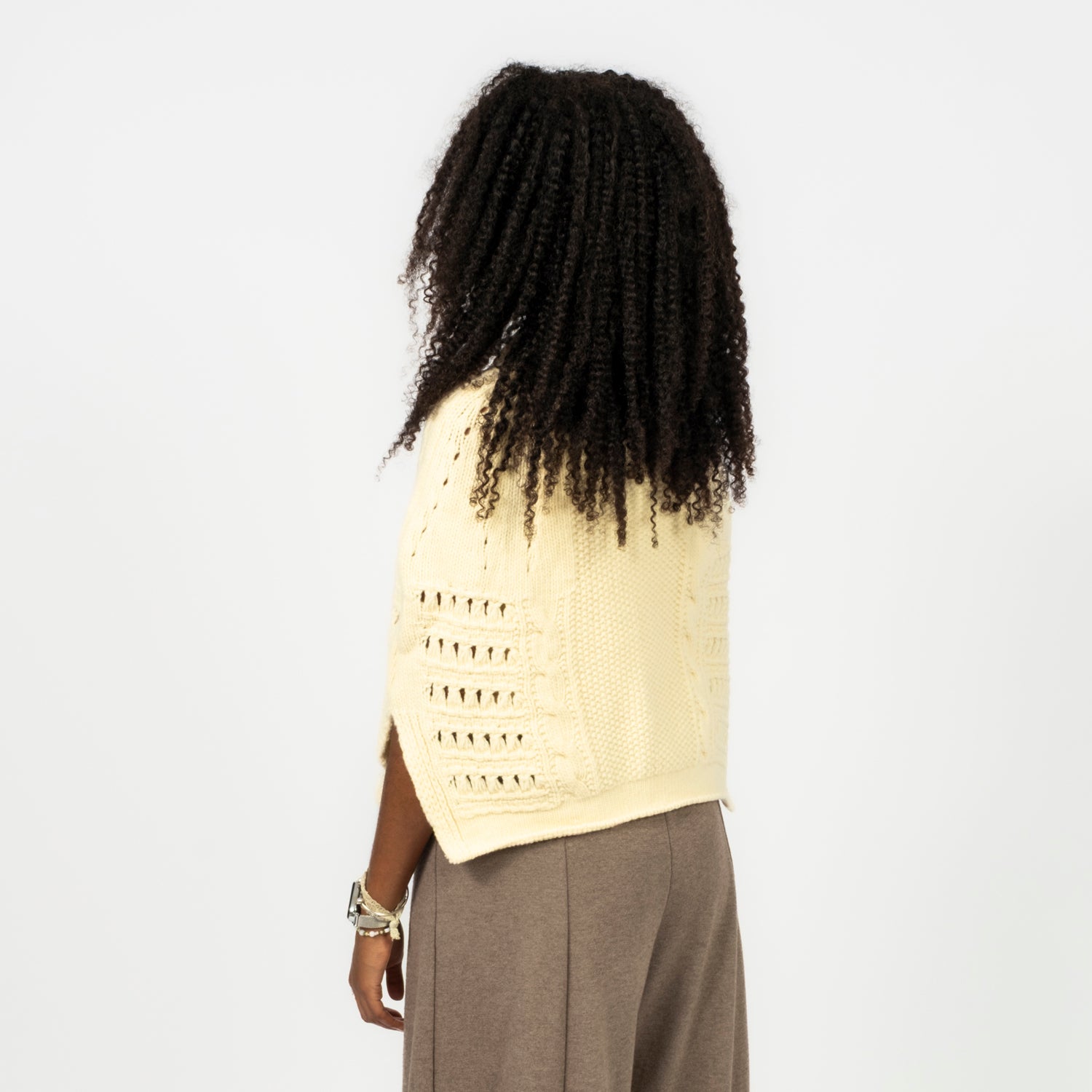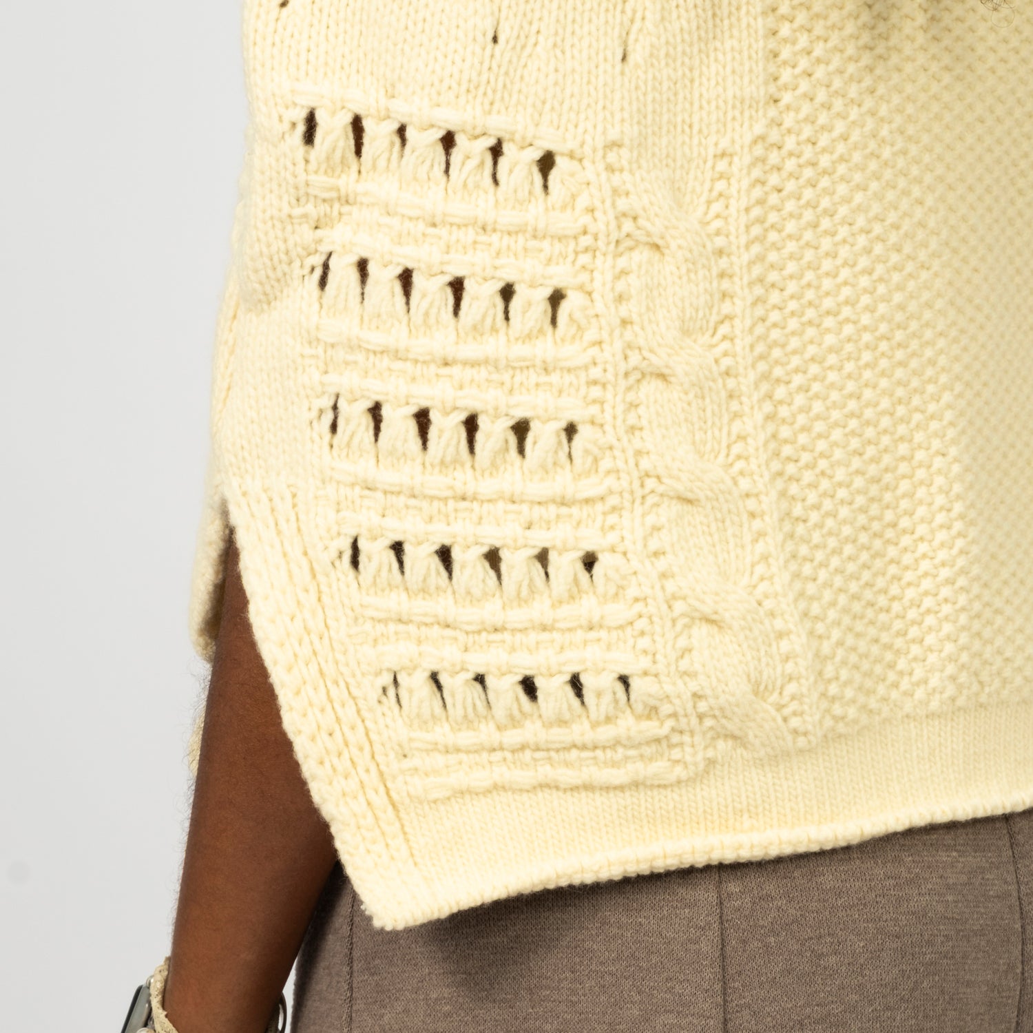 • Gunsey knit–inspired pattern arrangement • Merino wool knit with warmth and volume • Lightweight, soft hand feel • Designed for versatile layering over tops or outerwear