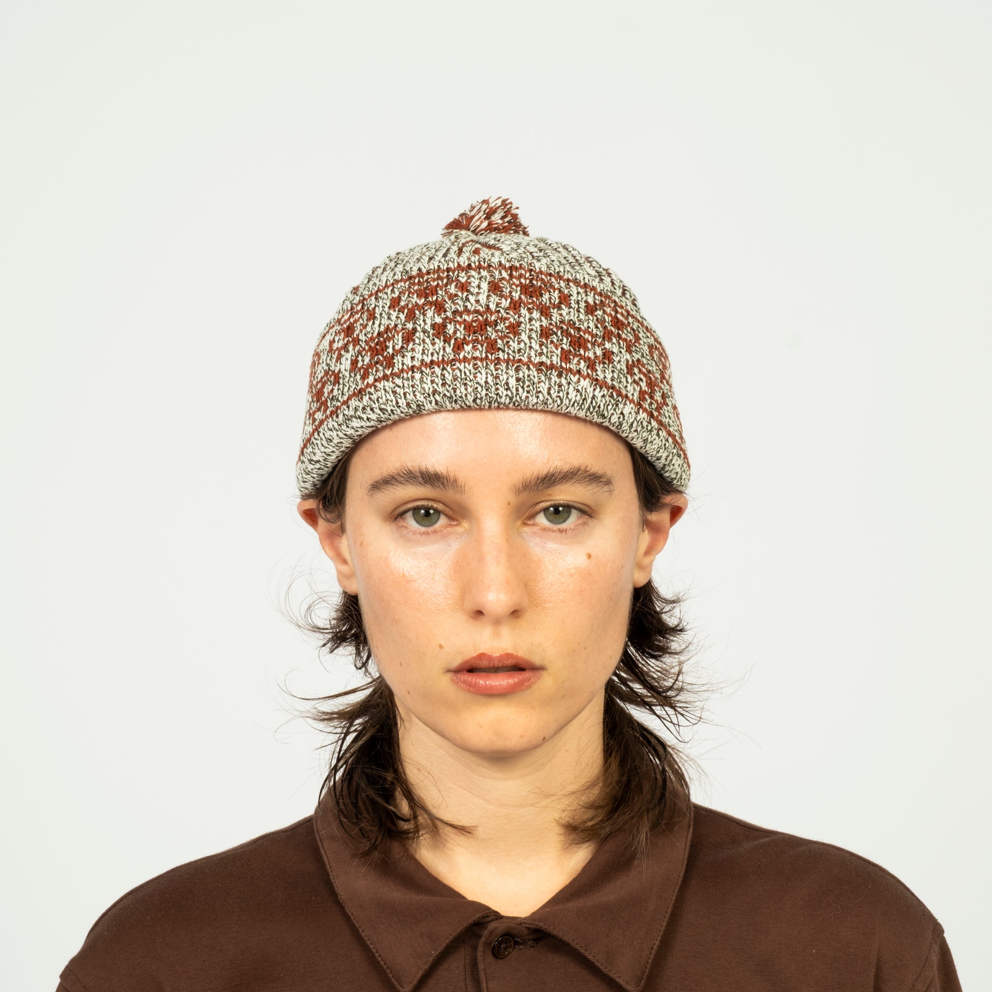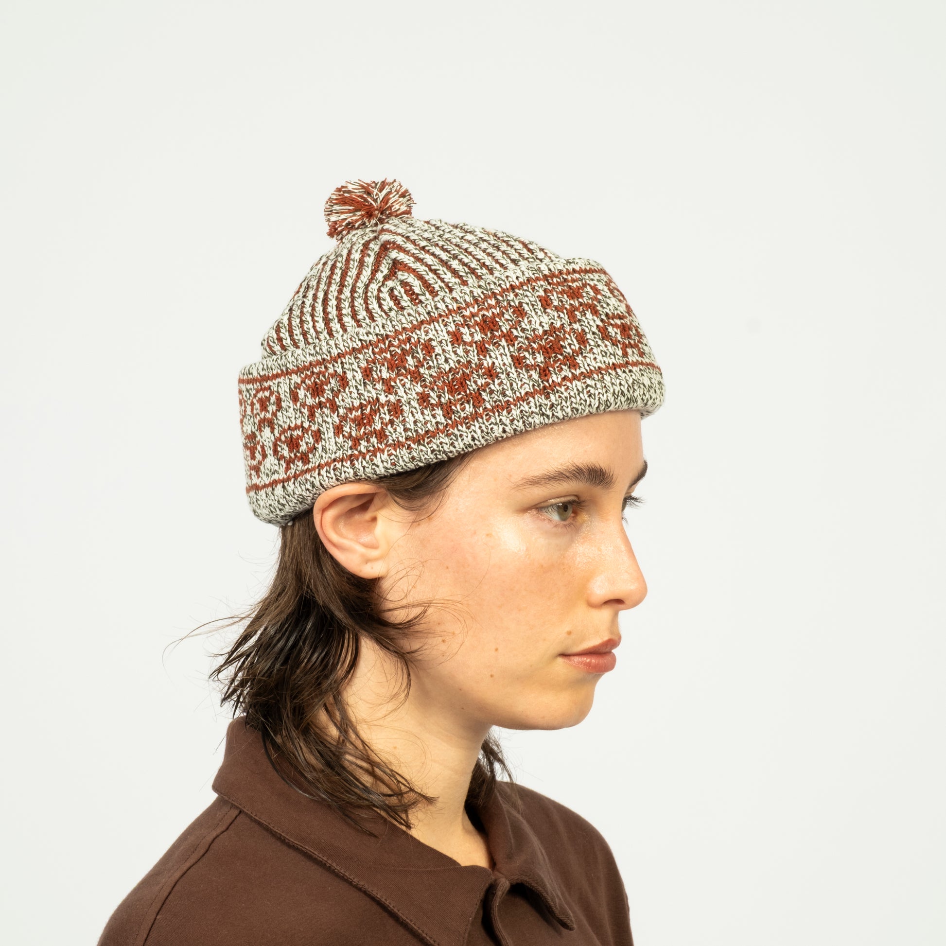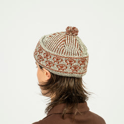 A Pakistan-made beanie finished with a digitally inspired sheep motif, giving the piece a modern, graphic edge. Knit from a twisted blend of expressive silk and specially processed cotton, it offers both texture and depth with a refined hand feel.