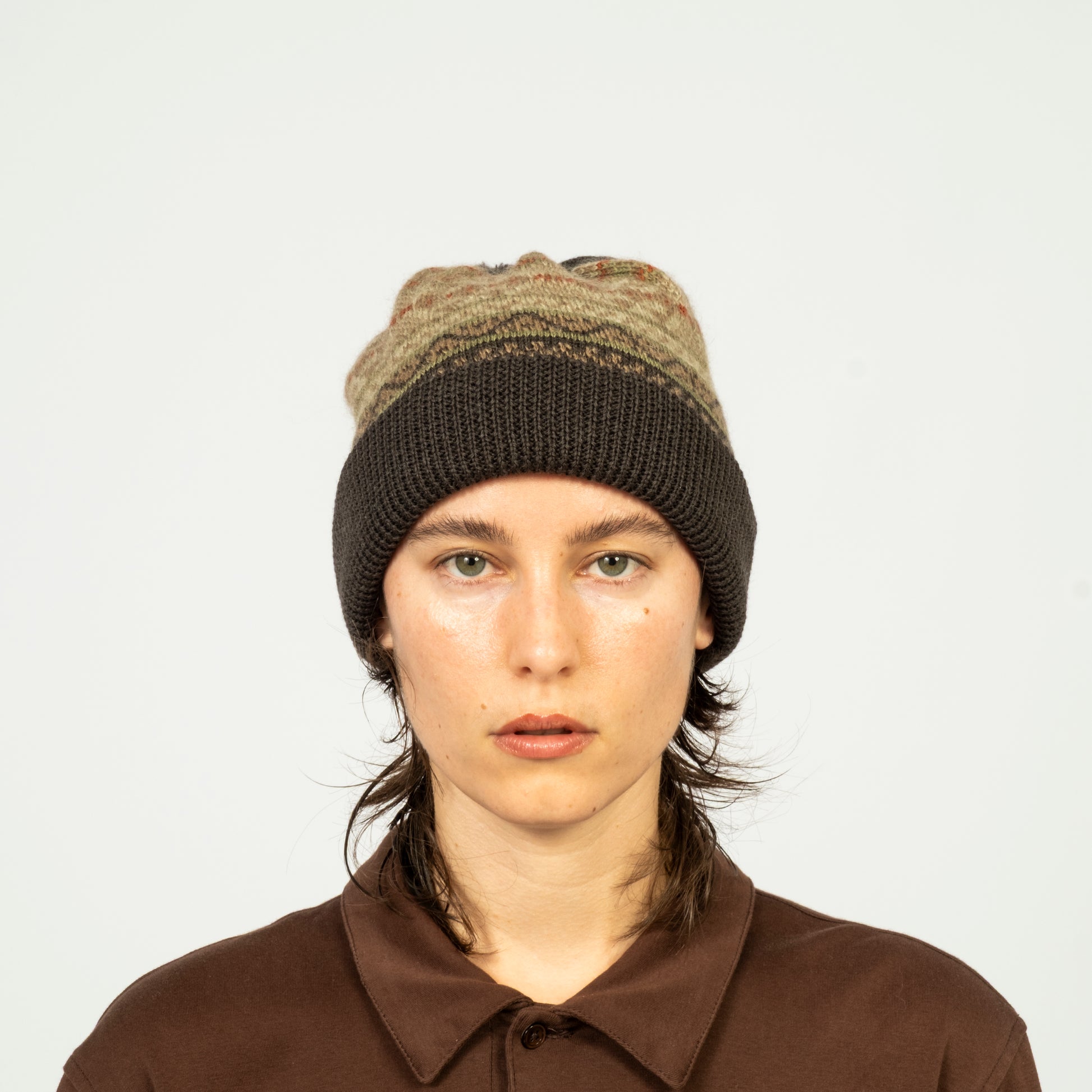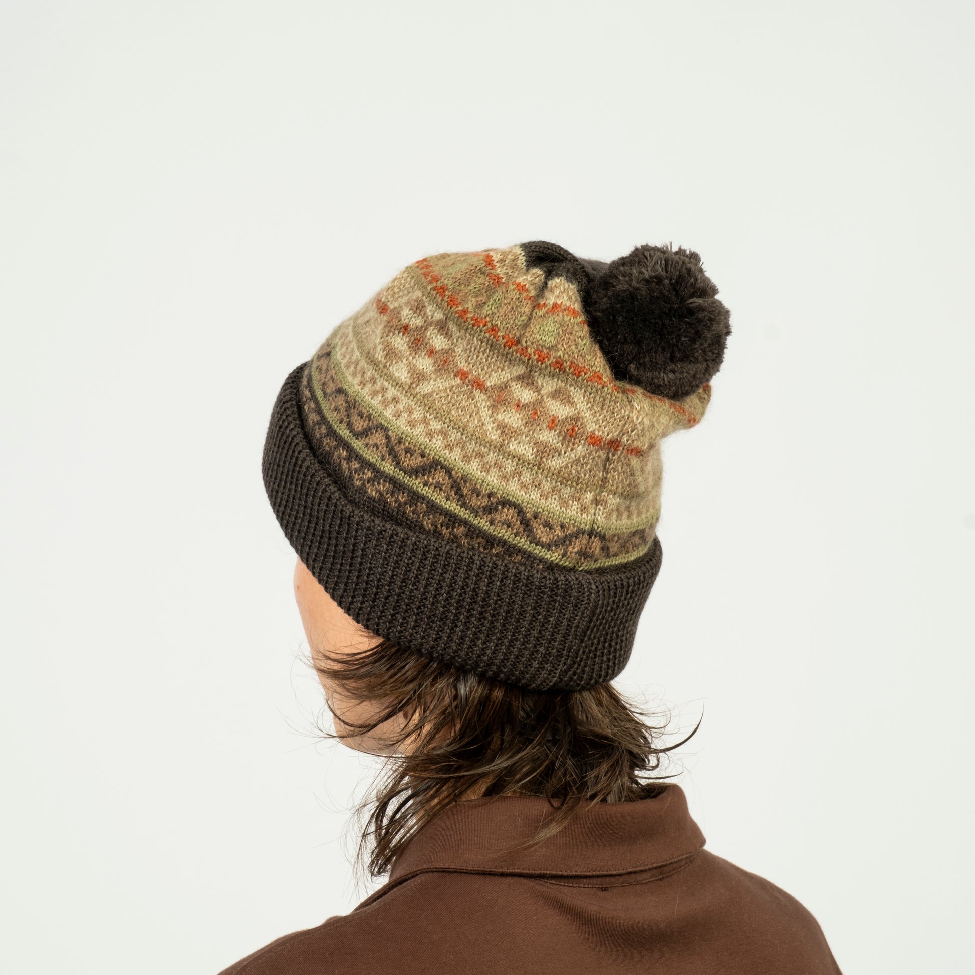 • Fair Isle pattern with balanced colour scheme • Mohair-blended sections for soft texture • Brushed feel that develops with wear • Detachable pom-pom detail • Three-fold ribbed opening for a secure fit