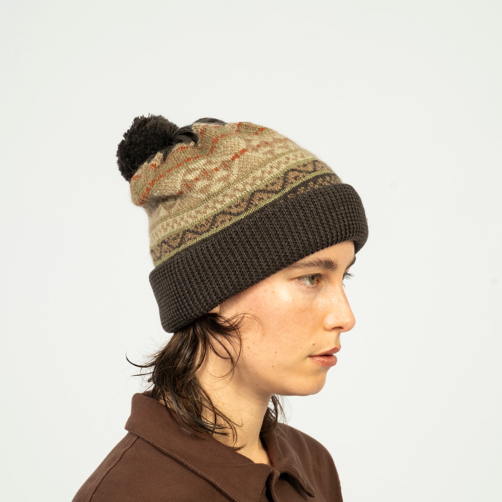 A Fair Isle knit hat finished in a balanced, understated colour palette. Select areas are woven with mohair to give the pattern a soft, textured feel that becomes more expressive with wear. A detachable pom-pom adds a playful accent, while the triple-fold ribbed opening ensures a secure, comfortable fit.