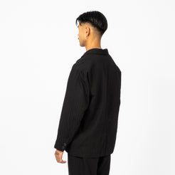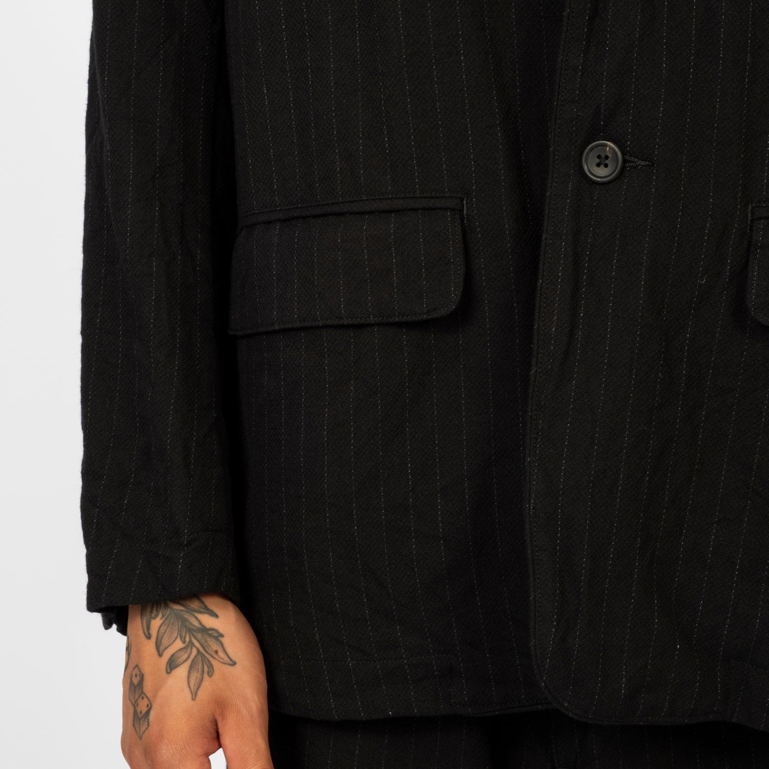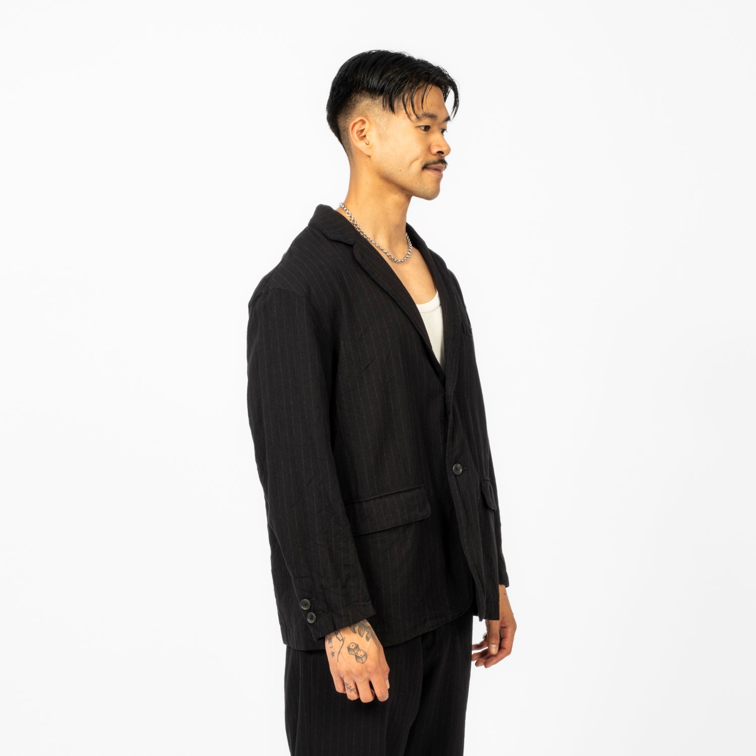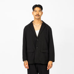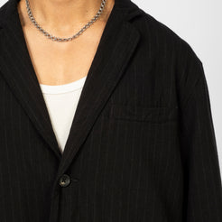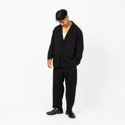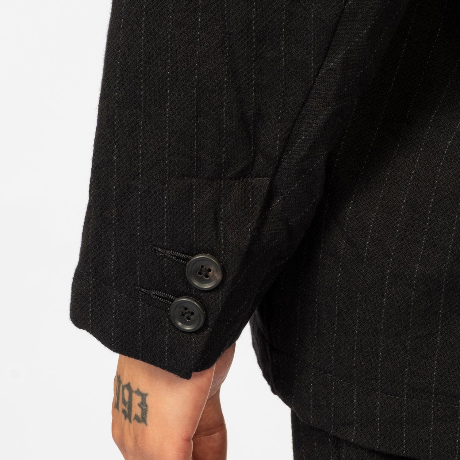 An original Porter Classic fabric woven with cotton warp and wool weft, slowly produced on vintage looms to create a light, airy volume. The hand-washed finish adds natural wrinkles, giving it an effortless, lived-in feel from the first wear. Stripe expression shifts by colour — crisp and defined in navy, subtle and blended in black — creating depth beyond a single fabric.