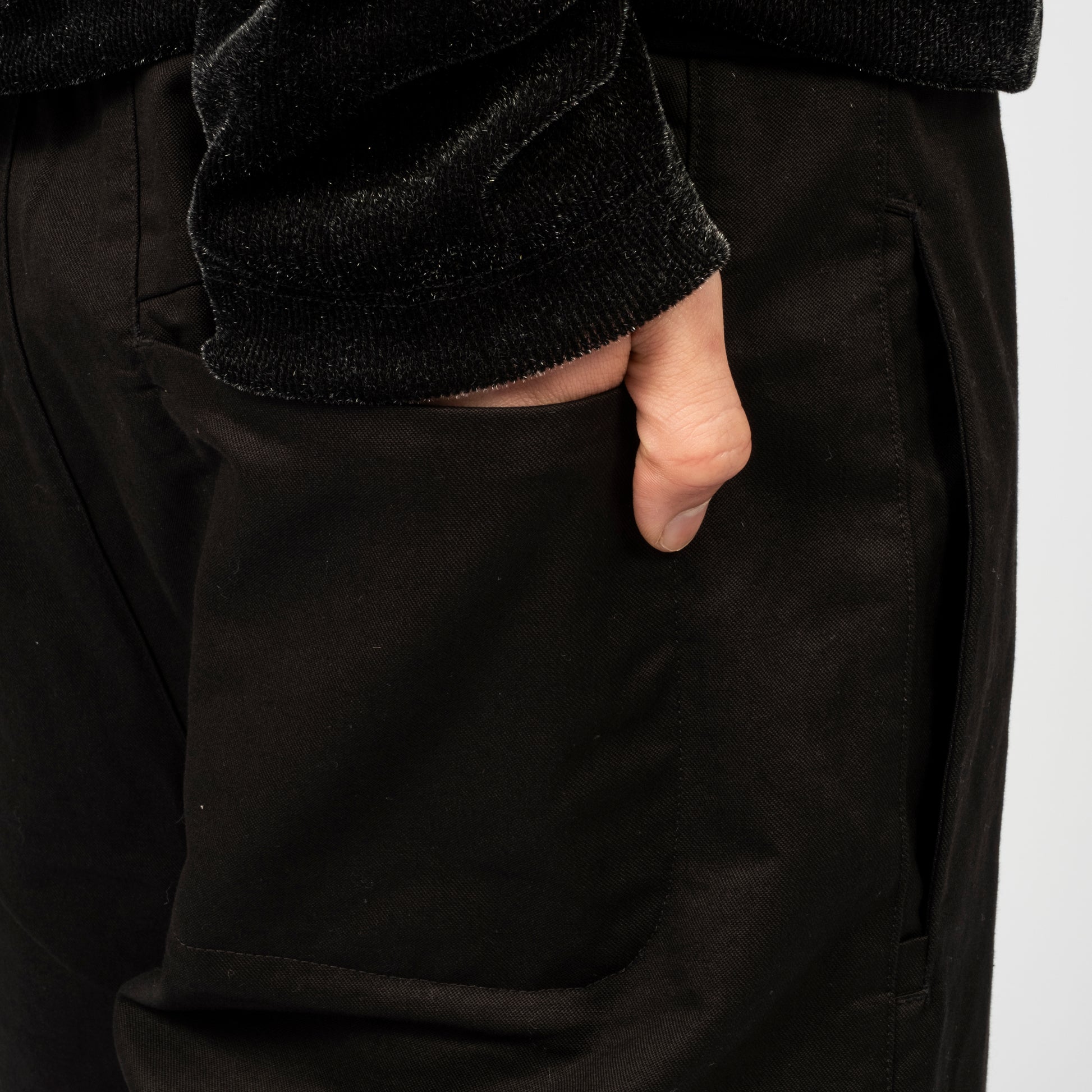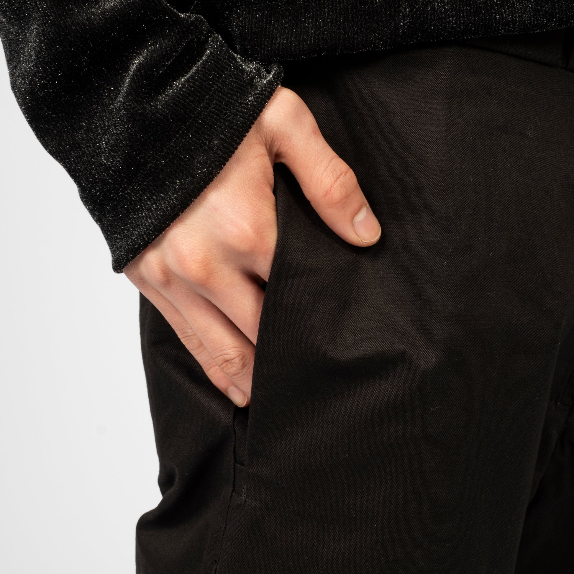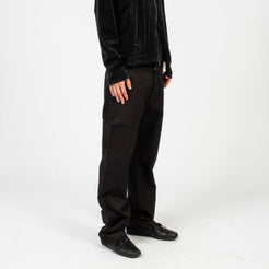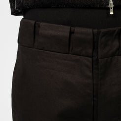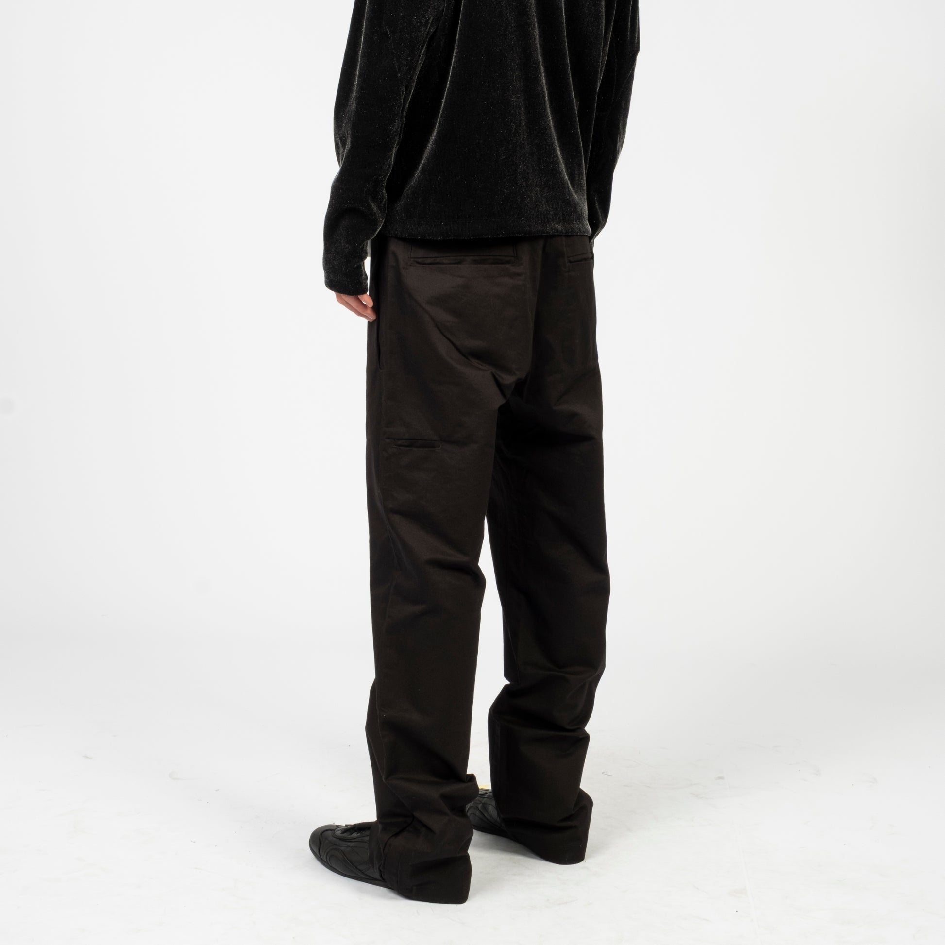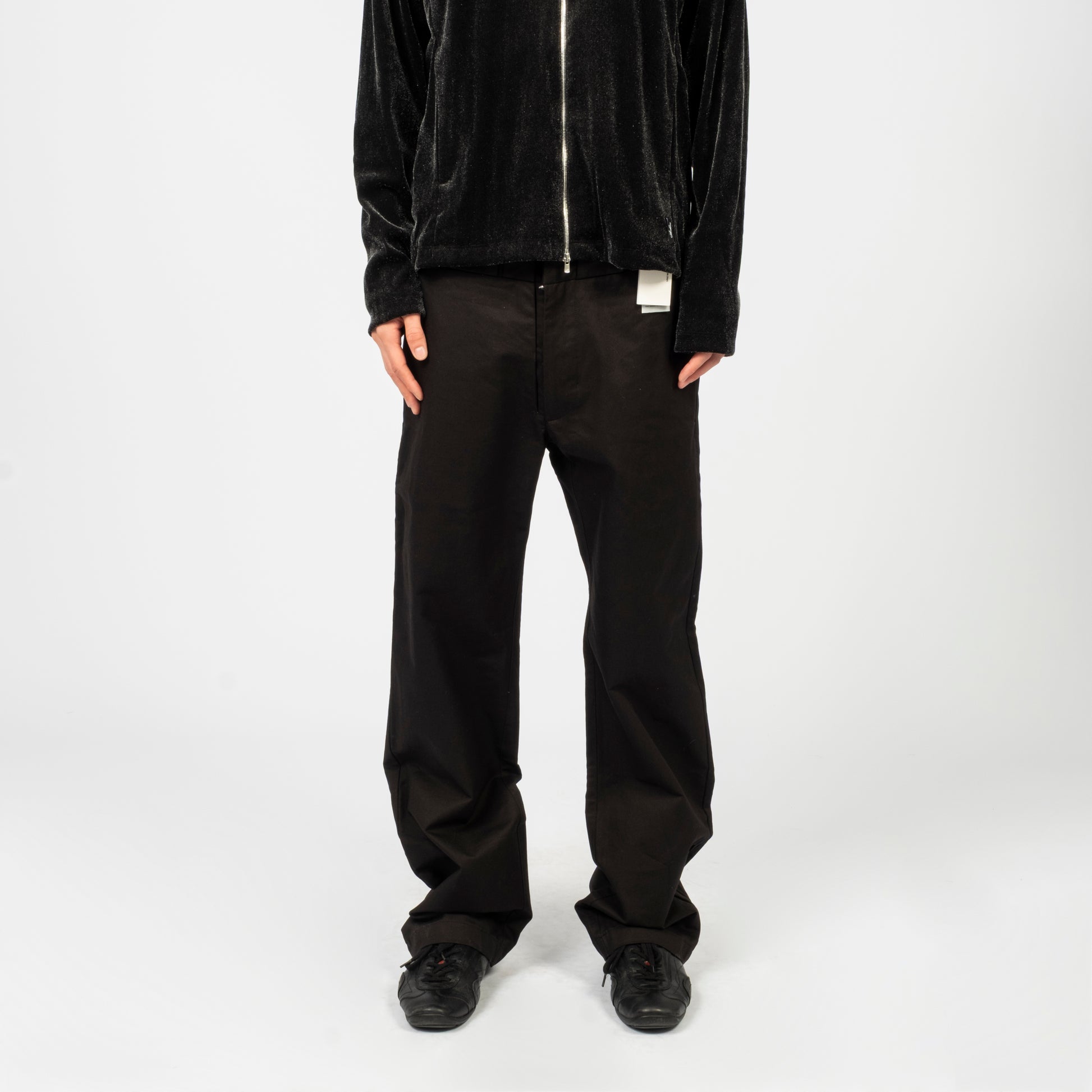 Inverted belt loops at the waist with snap button and zip fly closure. Features side and back pockets with a mock welt detail at the hem for a clean finish and a straight, standard fit.