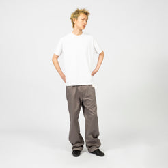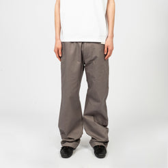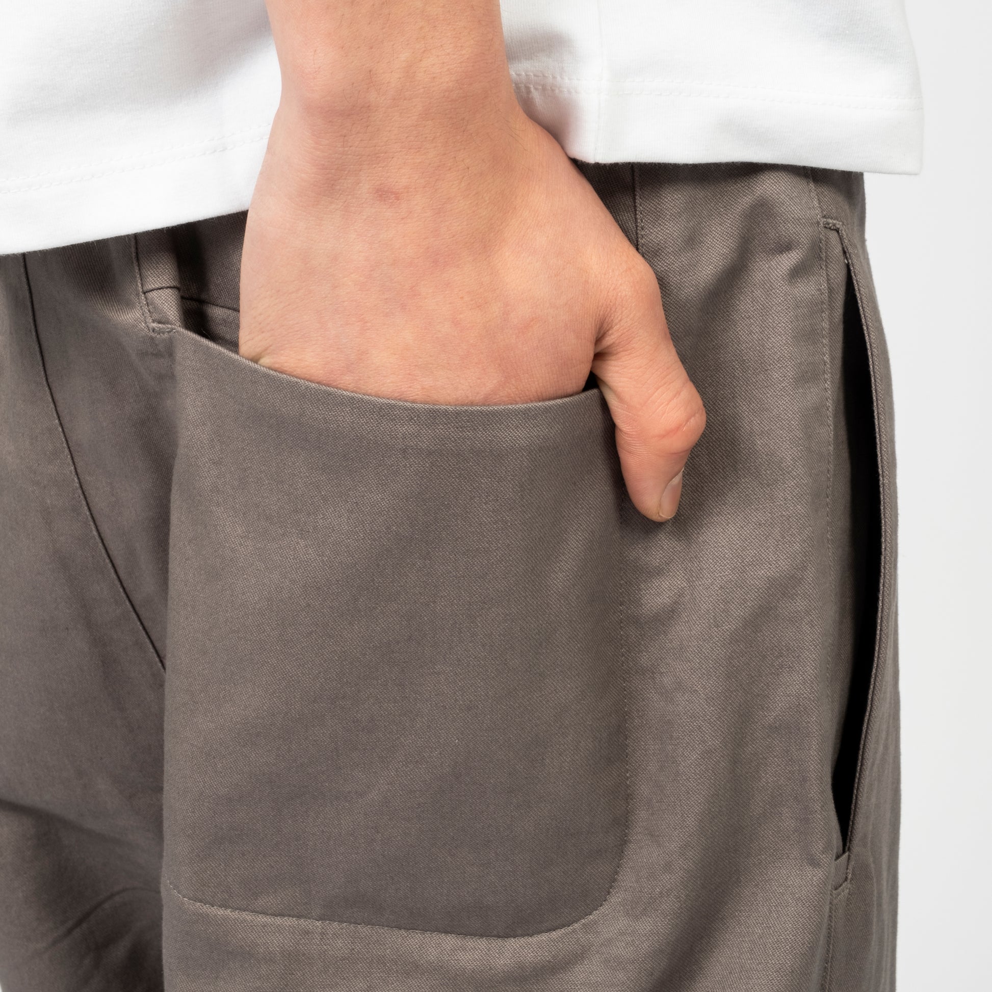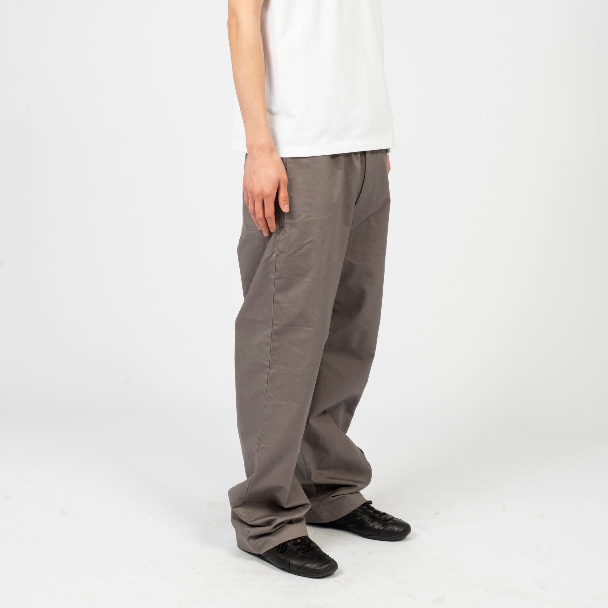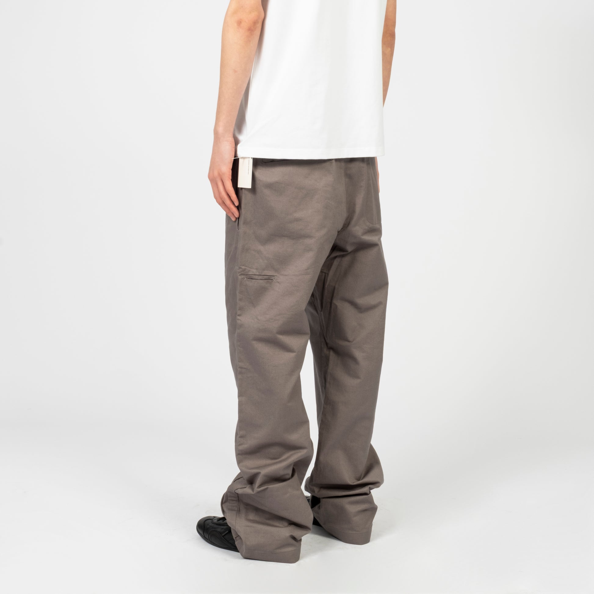 Inverted belt loops at the waist with snap button and zip fly closure. Features side and back pockets with a mock welt detail at the hem for a clean finish and a straight, standard fit.