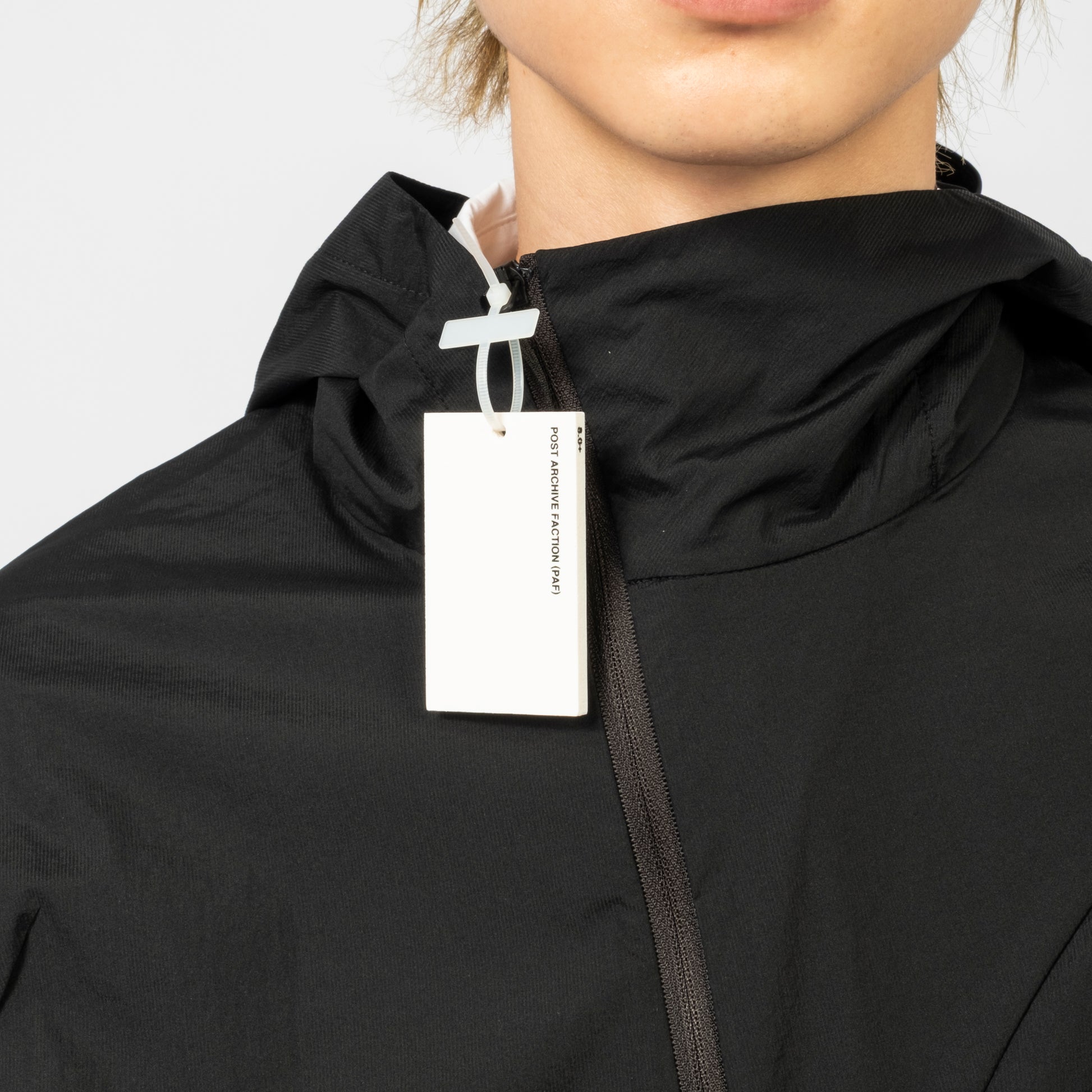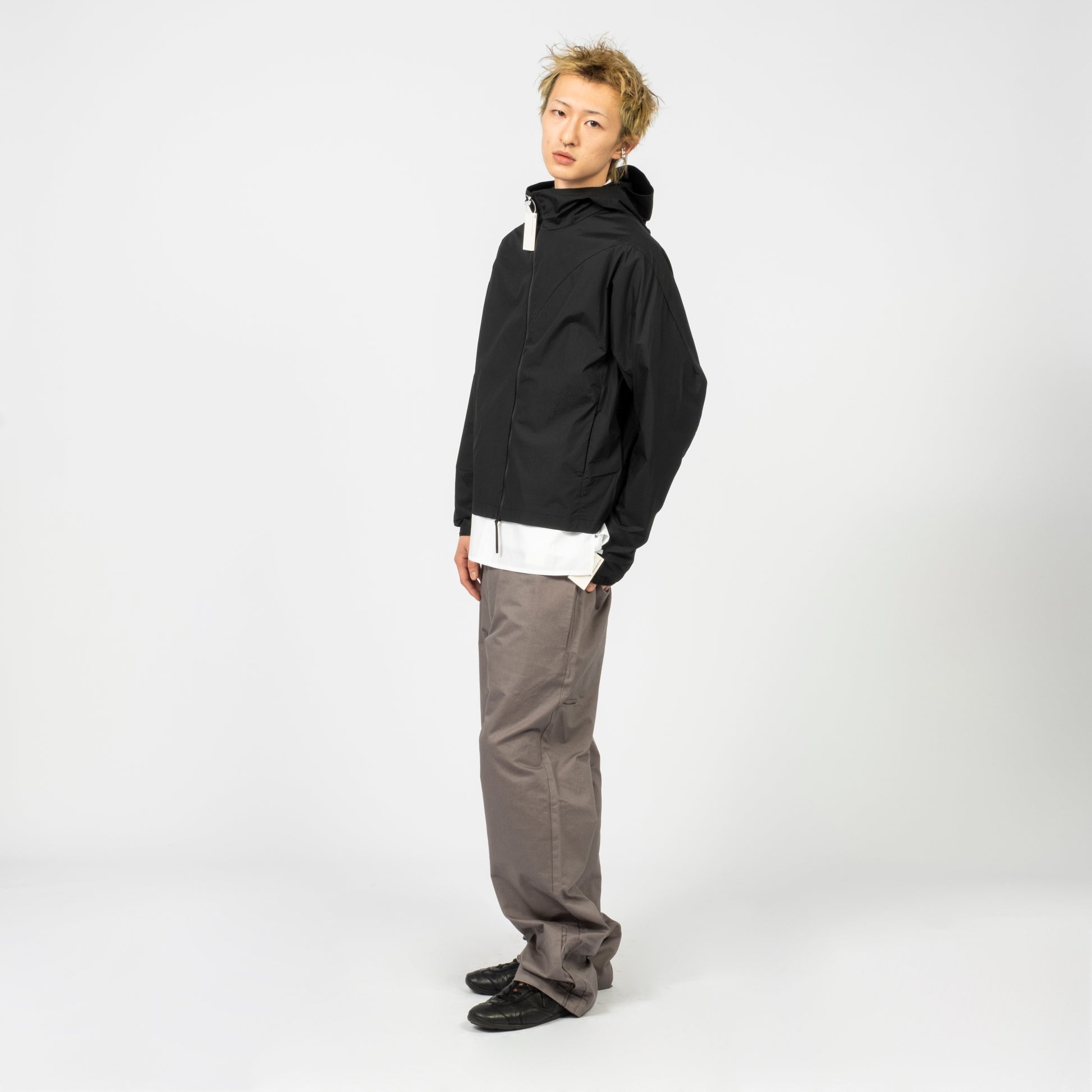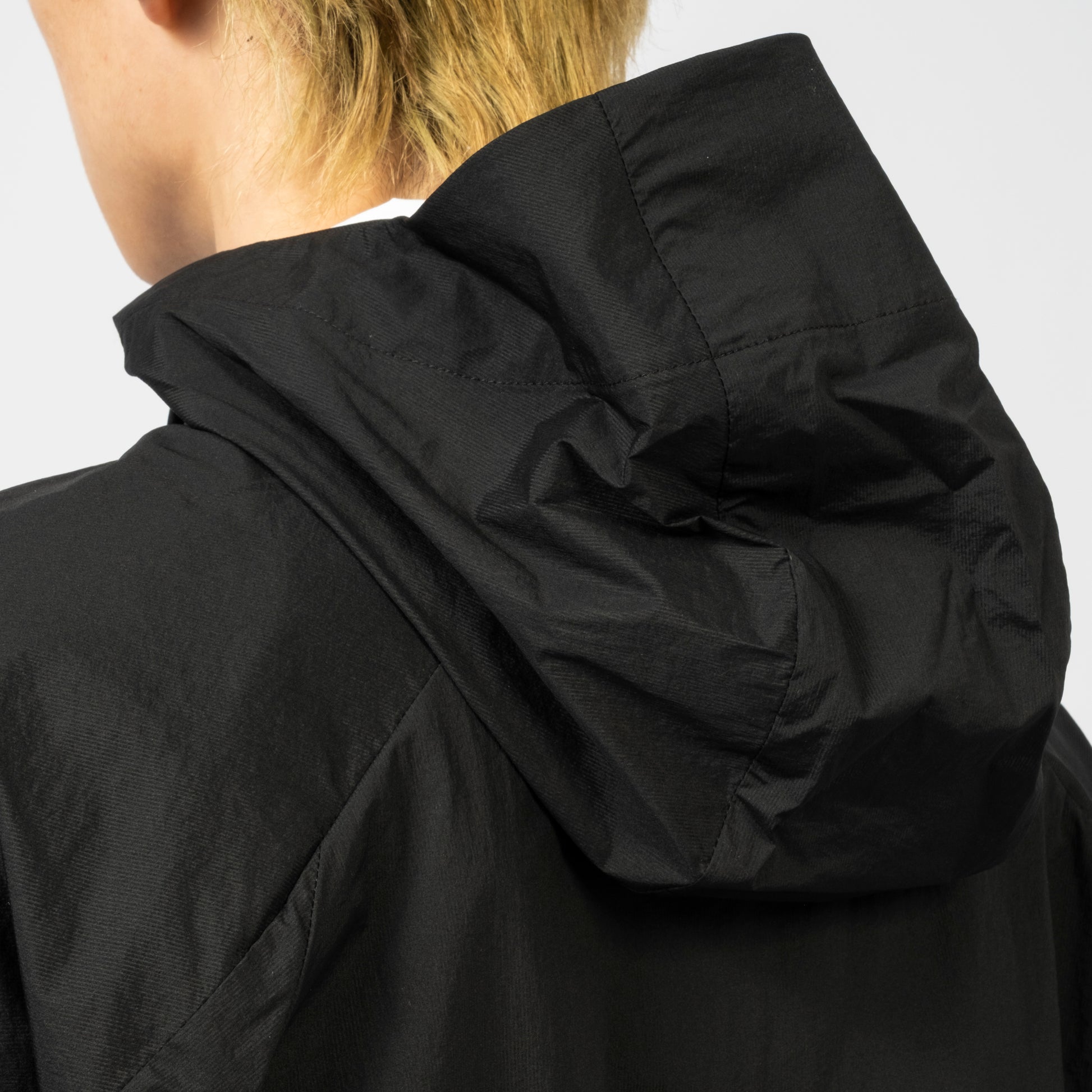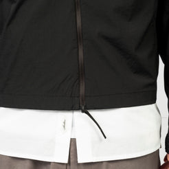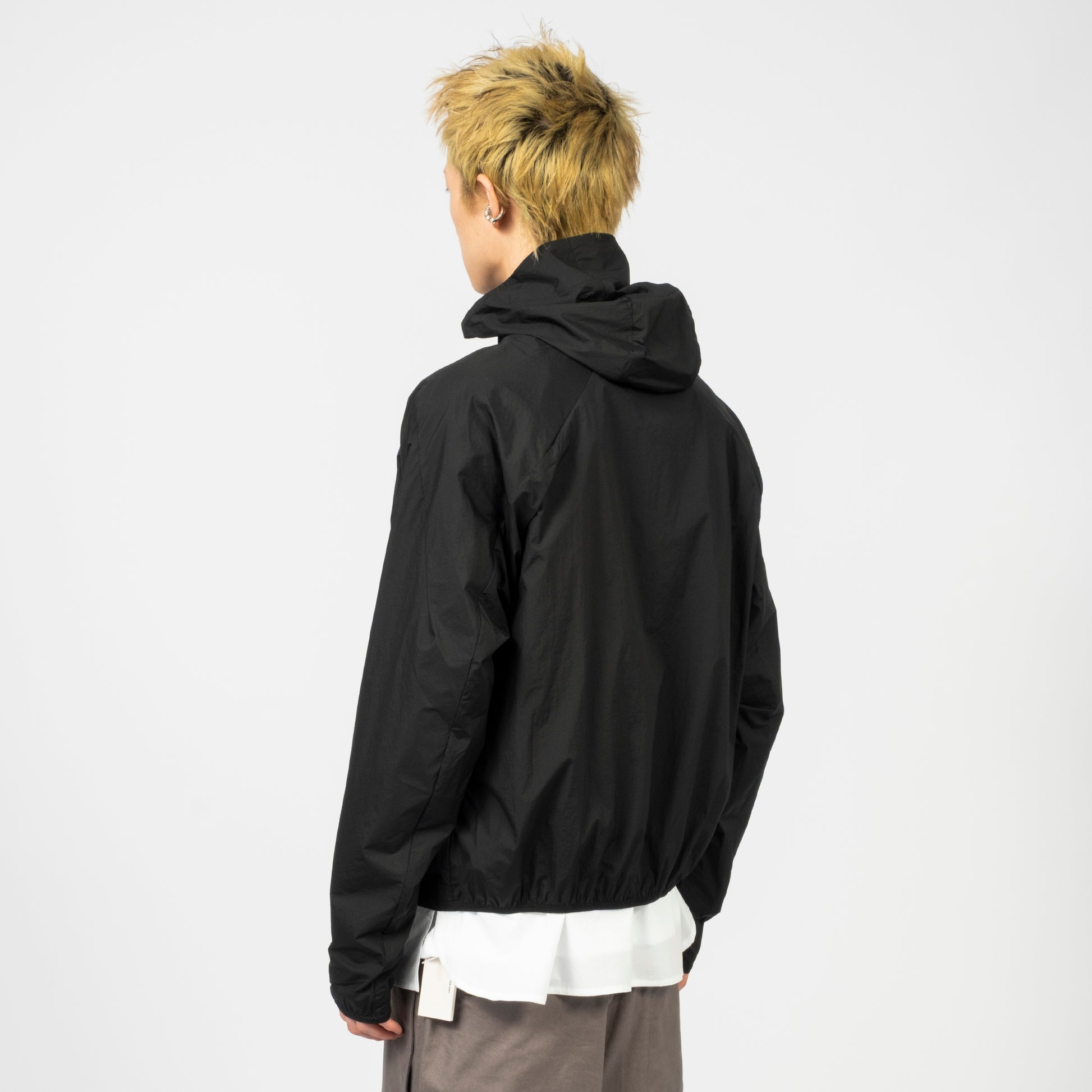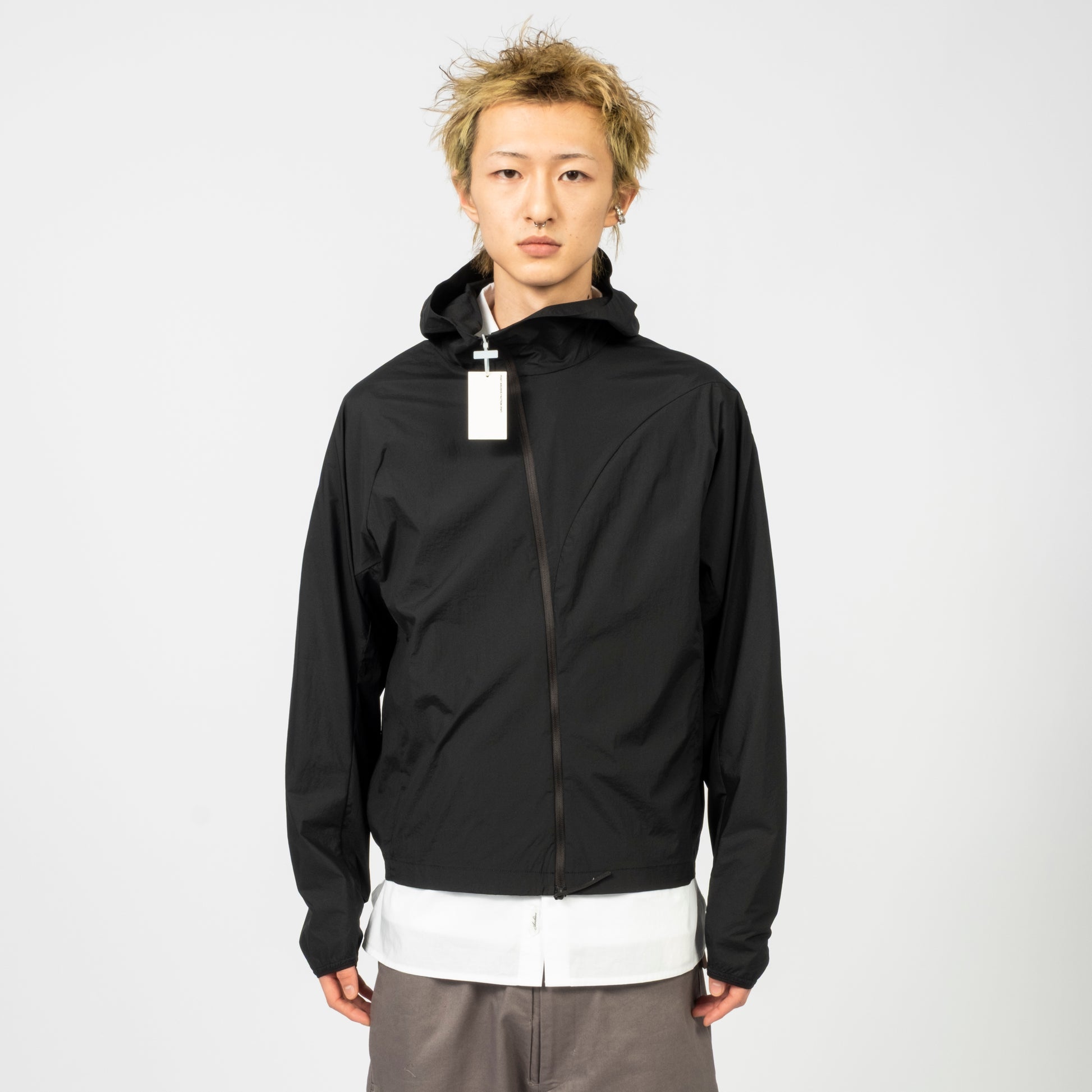 Lightweight jacket with a three-piece hood and protective high collar. Features a diagonal two-way front zip, darted curved seam on the chest, and webbing pull detail for a technical finish in a semi-oversized fit.