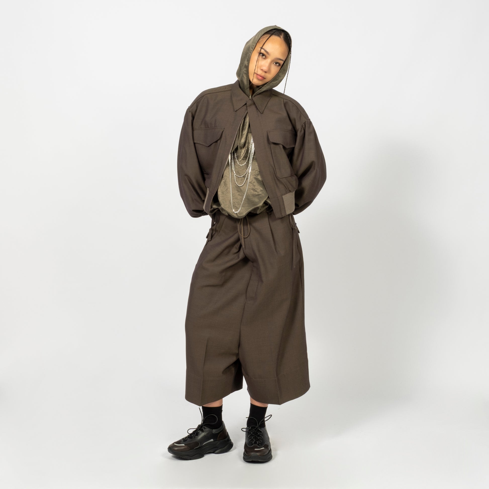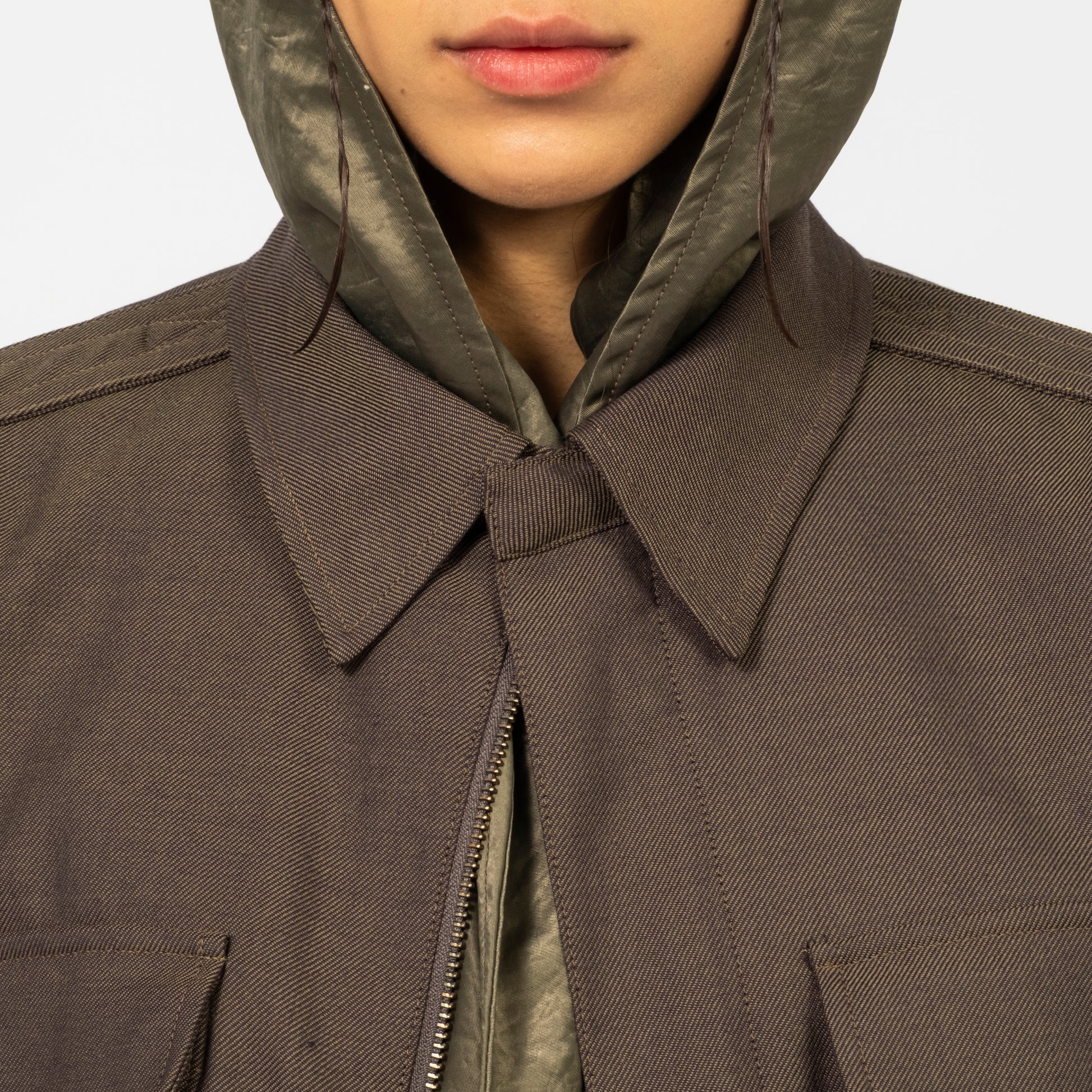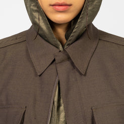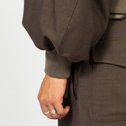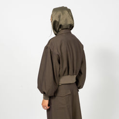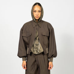 A RHODOLIRION interpretation of the iconic Type A-2 flight jacket, reworked with softer lines and a feminine silhouette. Classic details remain — a concealed zip front, snap-flap pockets, shirt-style snap-down collar, epaulettes, and ribbed cuffs and hem — but the dropped shoulders and full gathered balloon sleeves shift the mood toward a refined, sculptural shape. Crafted from a sustainable blend of recycled polyester and non-mulesed wool, the fabric holds a rounded, structured volume with a gentle firmness.