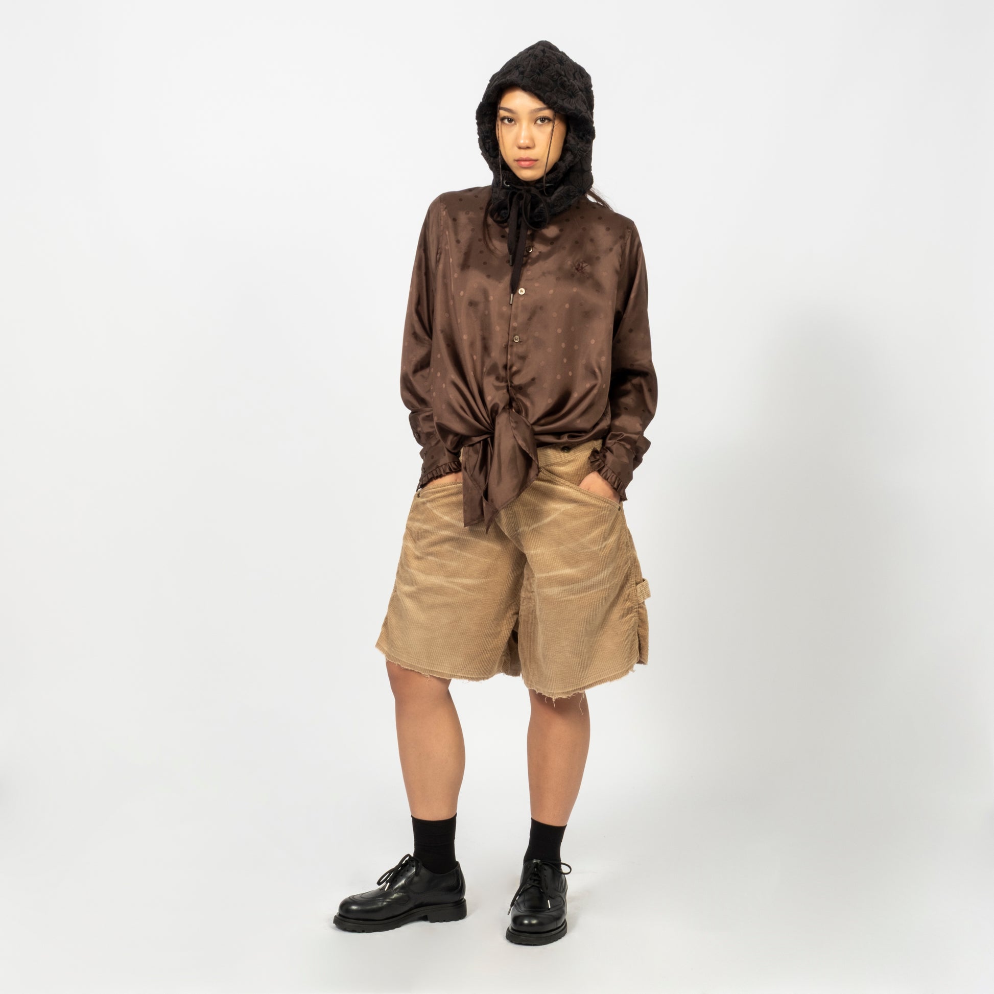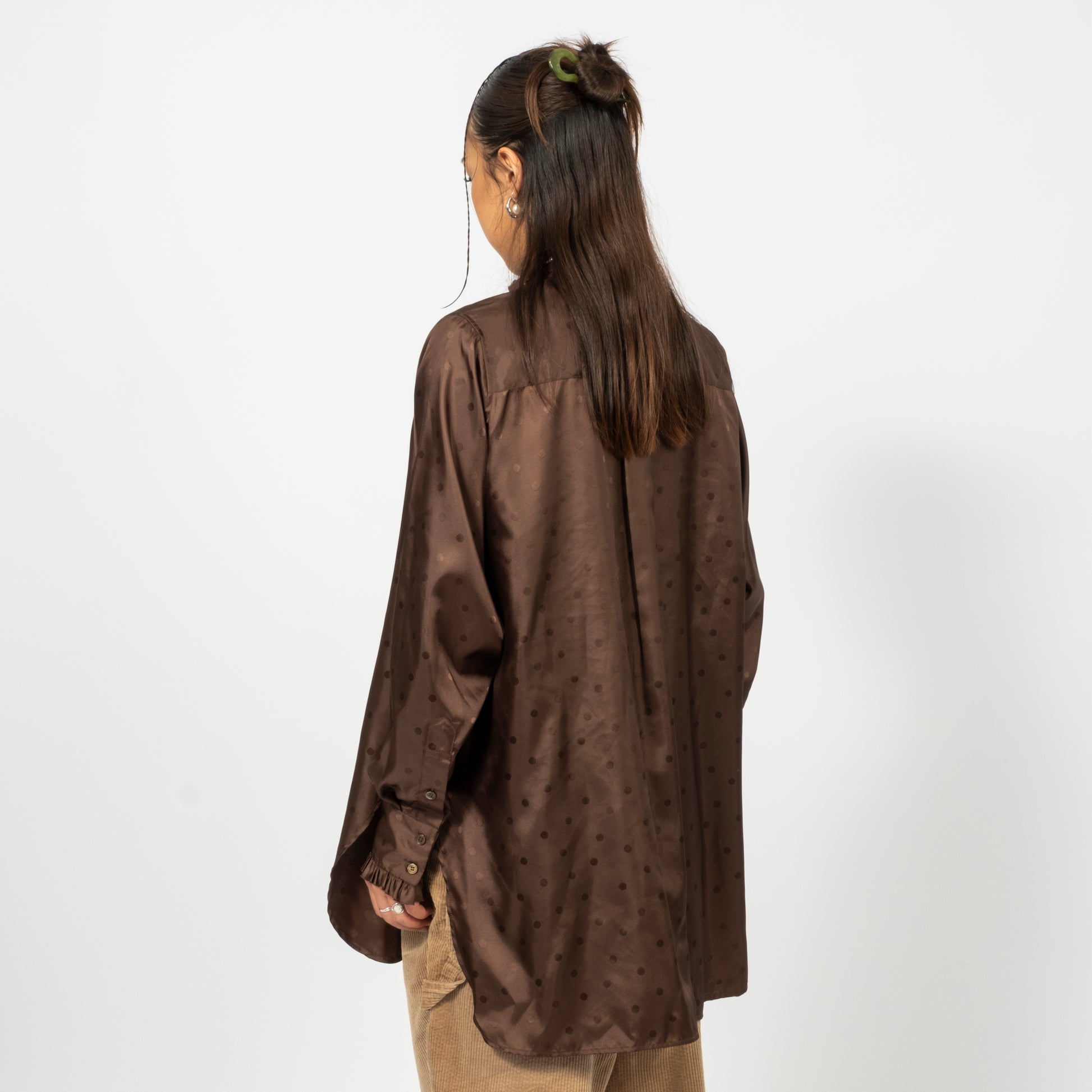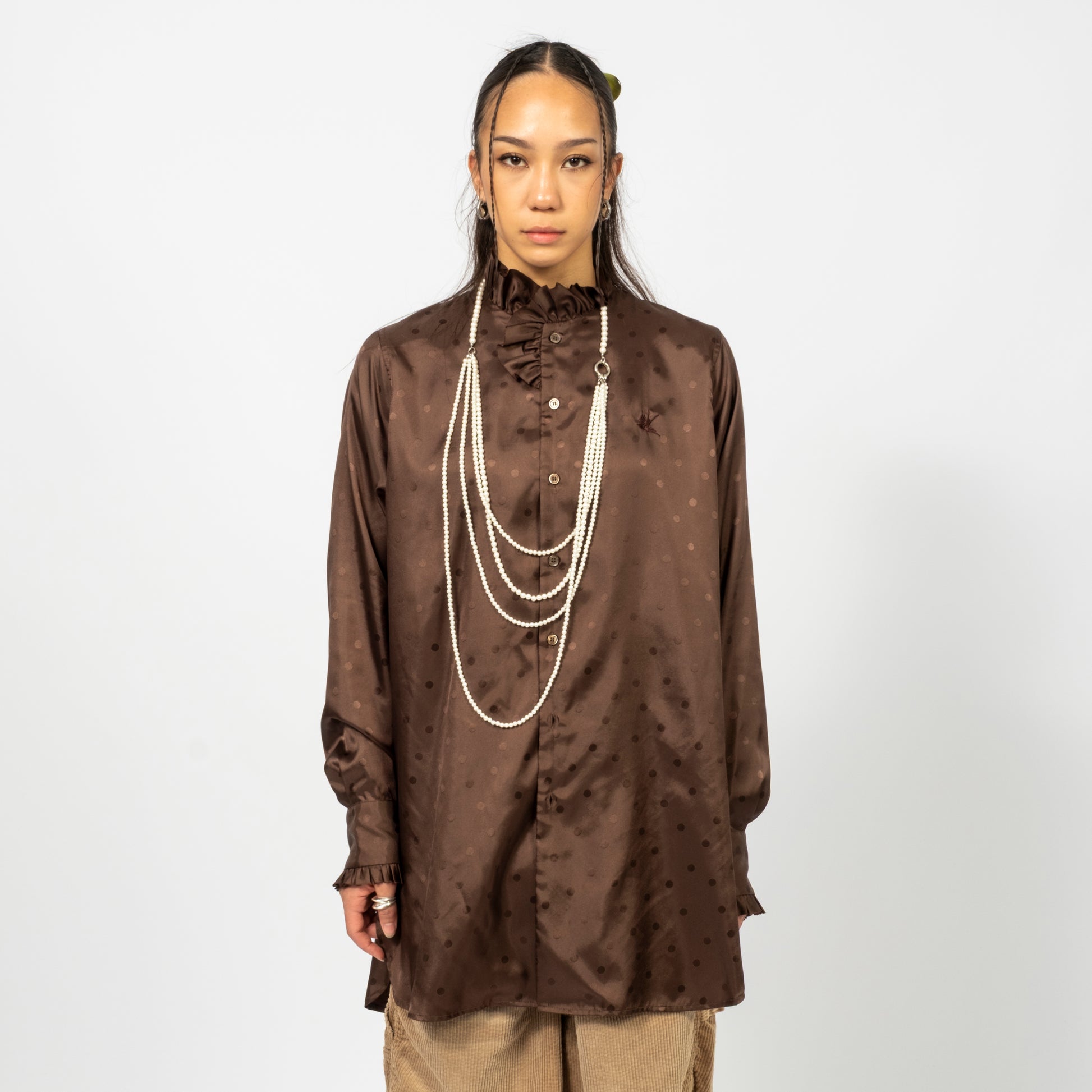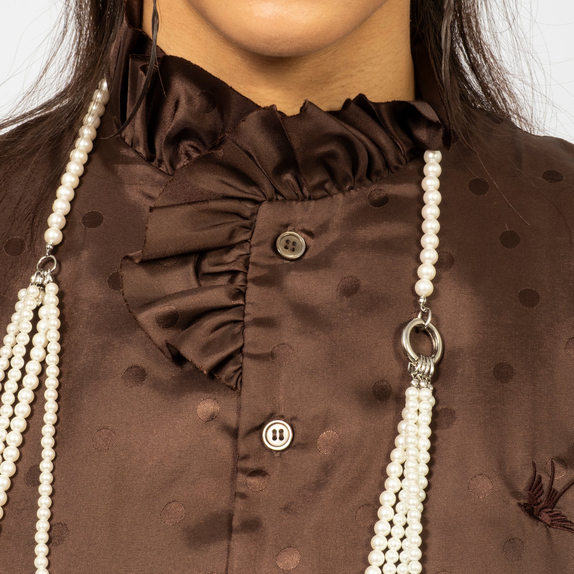 A long stand-collar shirt defined by voluminous ruffles that frame the neckline and cuffs, bringing soft movement to a clean silhouette. The jacquard fabric weaves brown dots and black leopard in tonal layers, offering depth and texture that differ from printed patterns, with a subtle sheen that highlights the motif through shadow. Light, refined, and versatile enough to style as a mini dress.