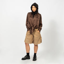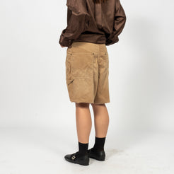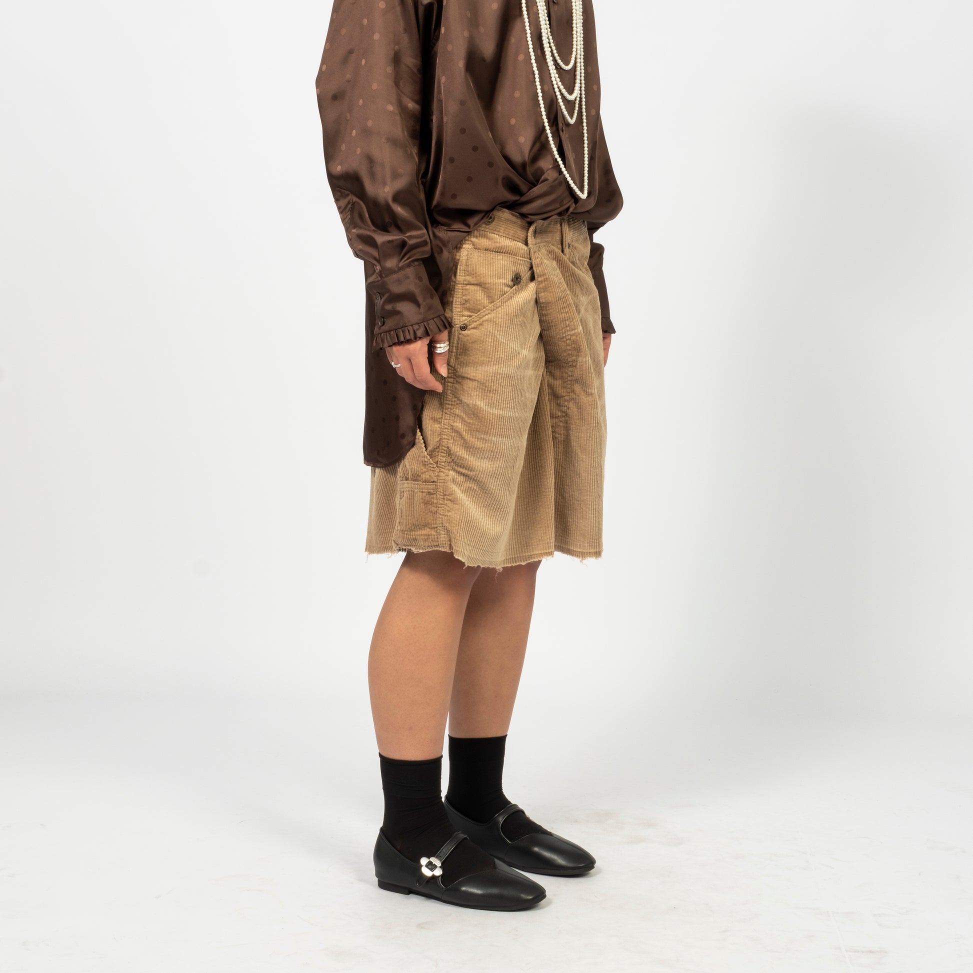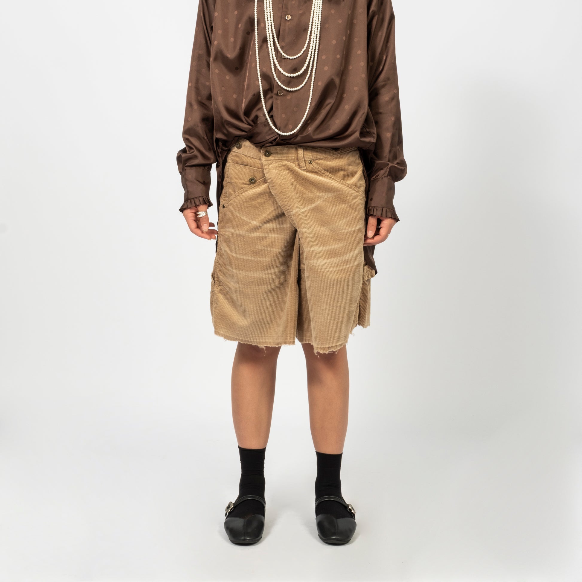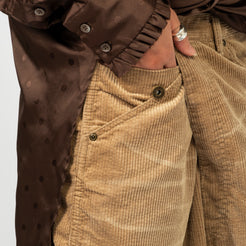 A relaxed RHODOLIRION take on rodeo-inspired trousers, designed with a versatile front panel that can be wrapped like Thai pants or cinched tightly with a belt. The cut-off style distressing brings a worn-in, vintage mood, amplified by the soft texture of 6-wale organic cotton corduroy. Easy to shape, expressive in silhouette, and rooted in a workwear sensibility.