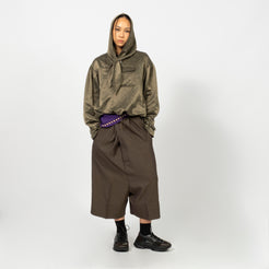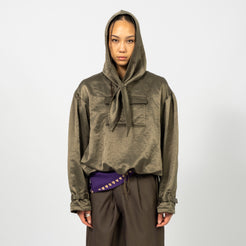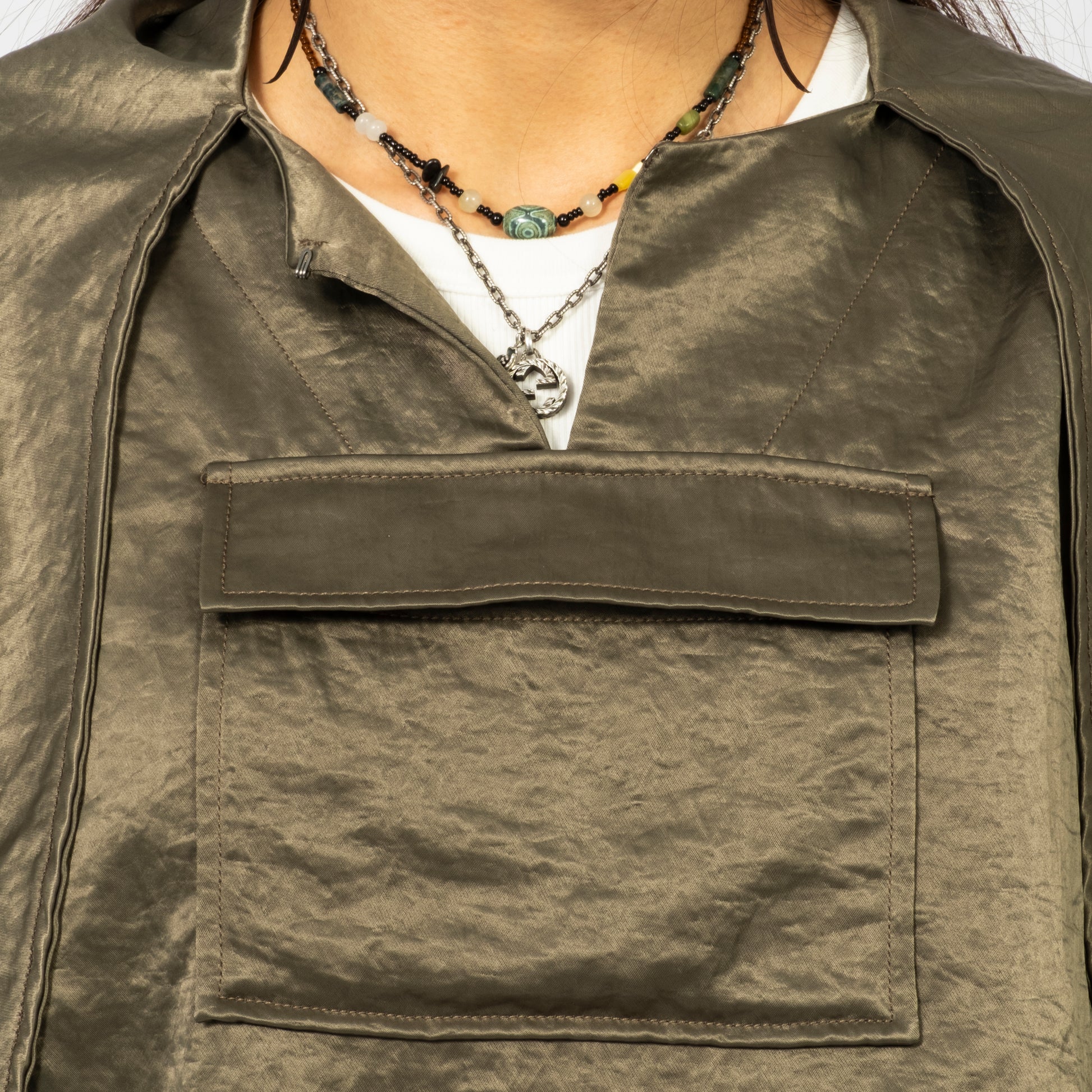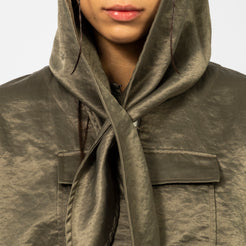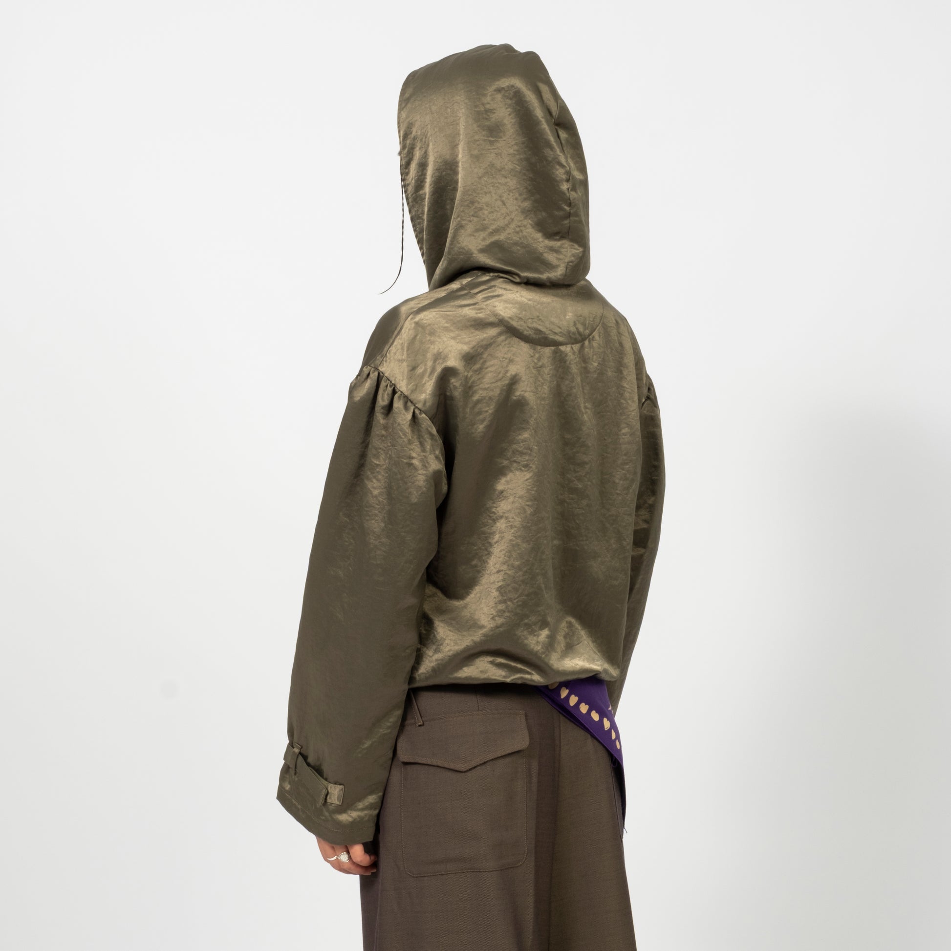A mid-weight outer layer inspired by US Army anoraks, defined by a front pocket, hood, and adjustable waist drawcord. The dropped sleeves are gathered for soft volume, balancing the functional shape. Cut from recycled-nylon satin with a tumbler finish, the fabric carries a natural wrinkle and a refined sheen that contrasts beautifully with its military roots. Light enough to throw on, yet elevated in texture and presence.