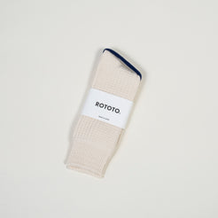 ROTOTO A nostalgic take on everyday essentials — these waffle-knit crew socks are made on traditional non-computerize...
