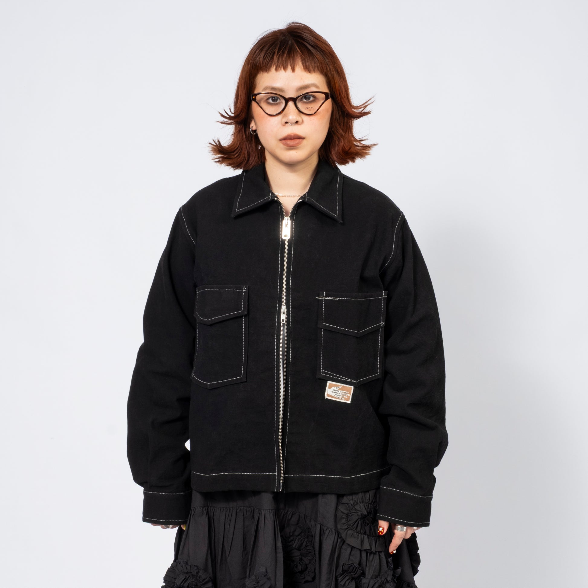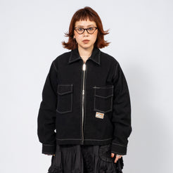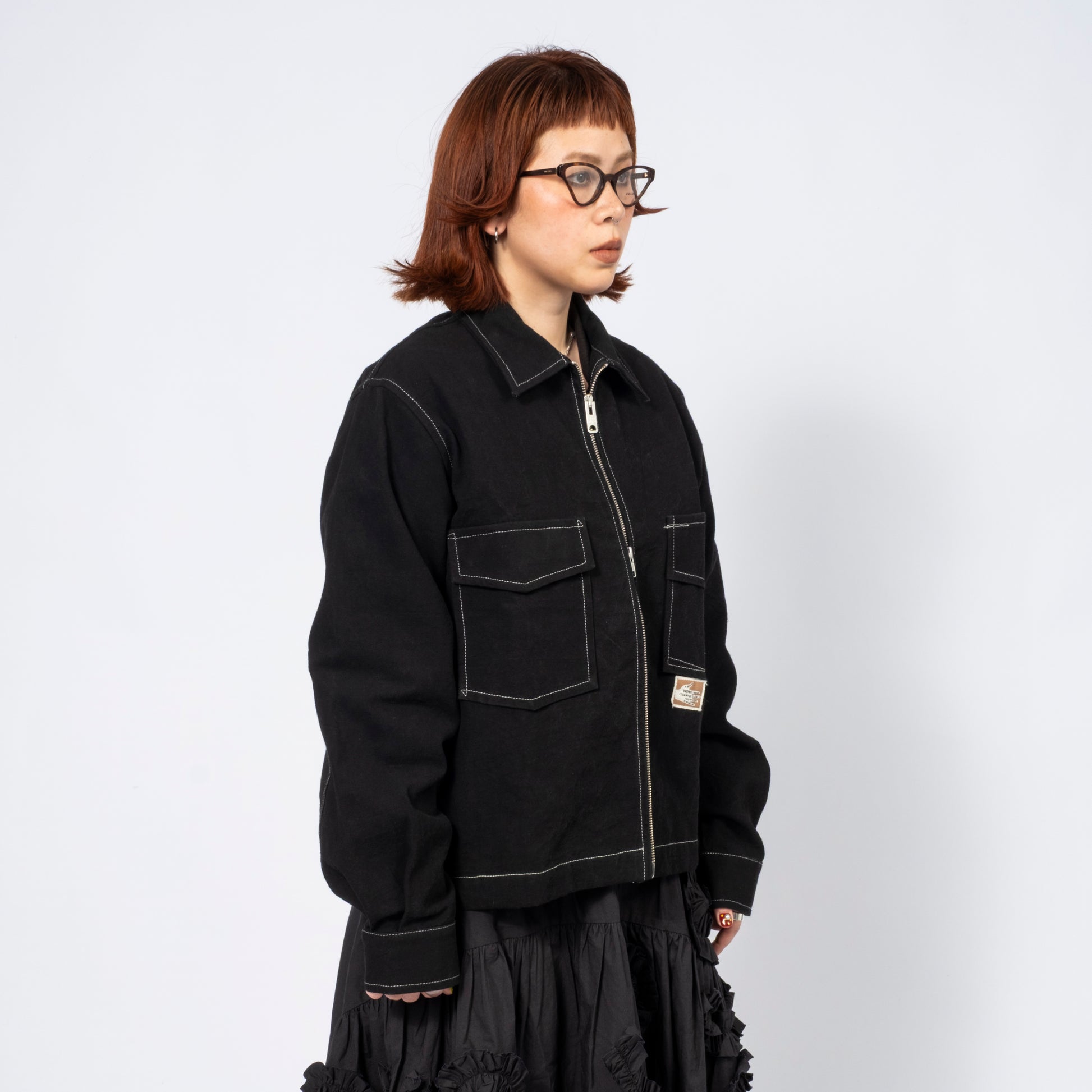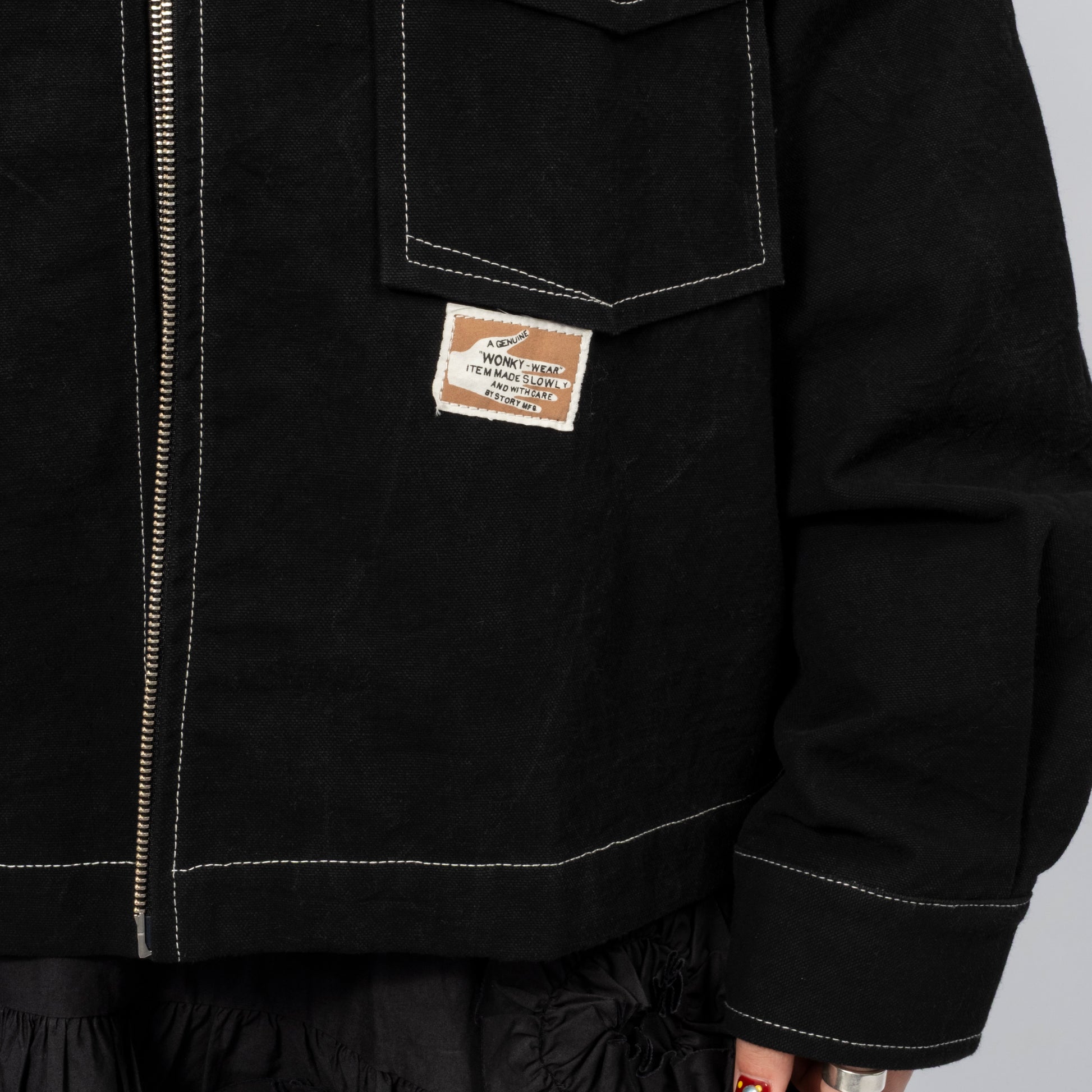 Workwear-inspired jacket in organic cotton twill, hand-dyed with natural dyes. Part of the Wonky-Wear capsule, celebrating offbeat vintage details through single-needle construction.