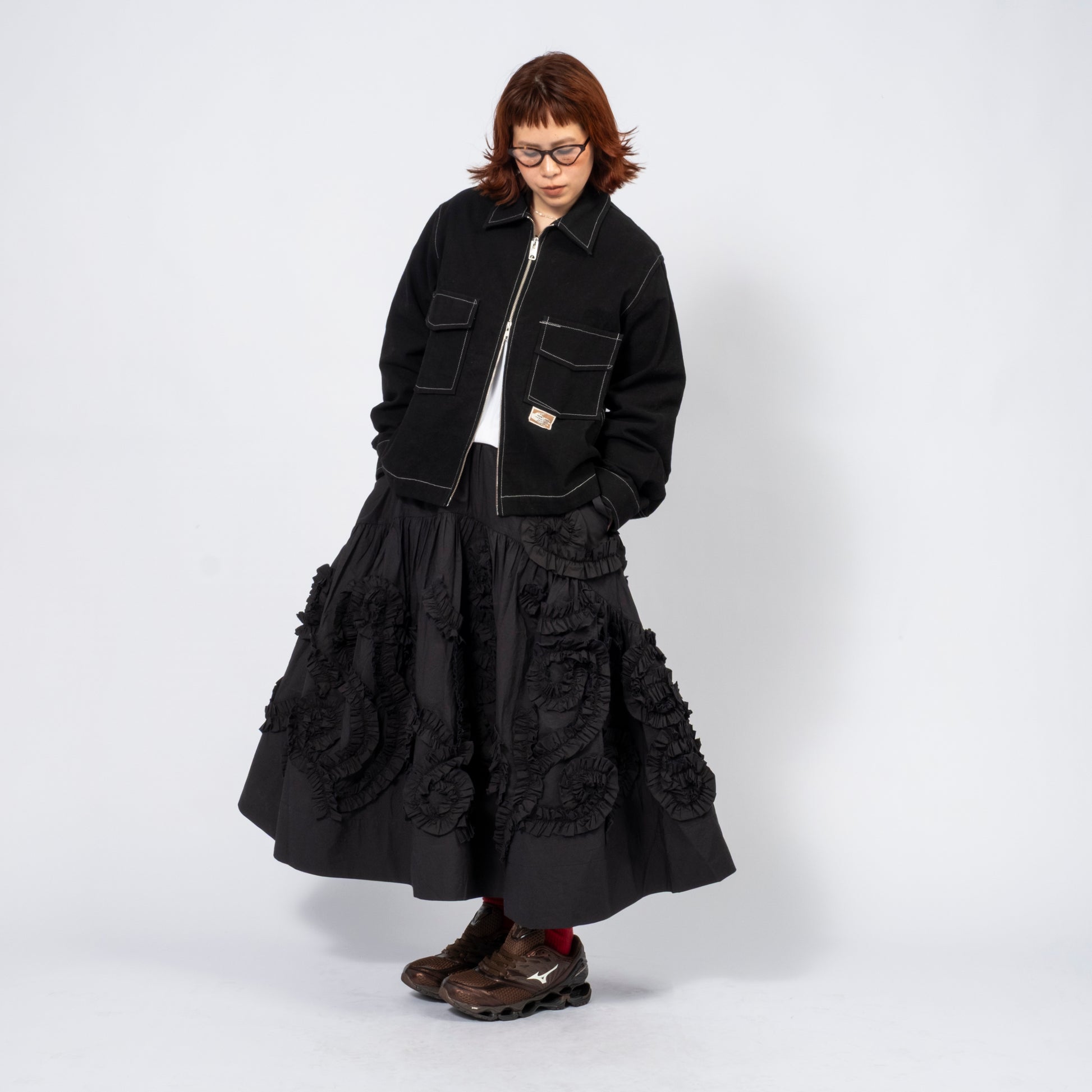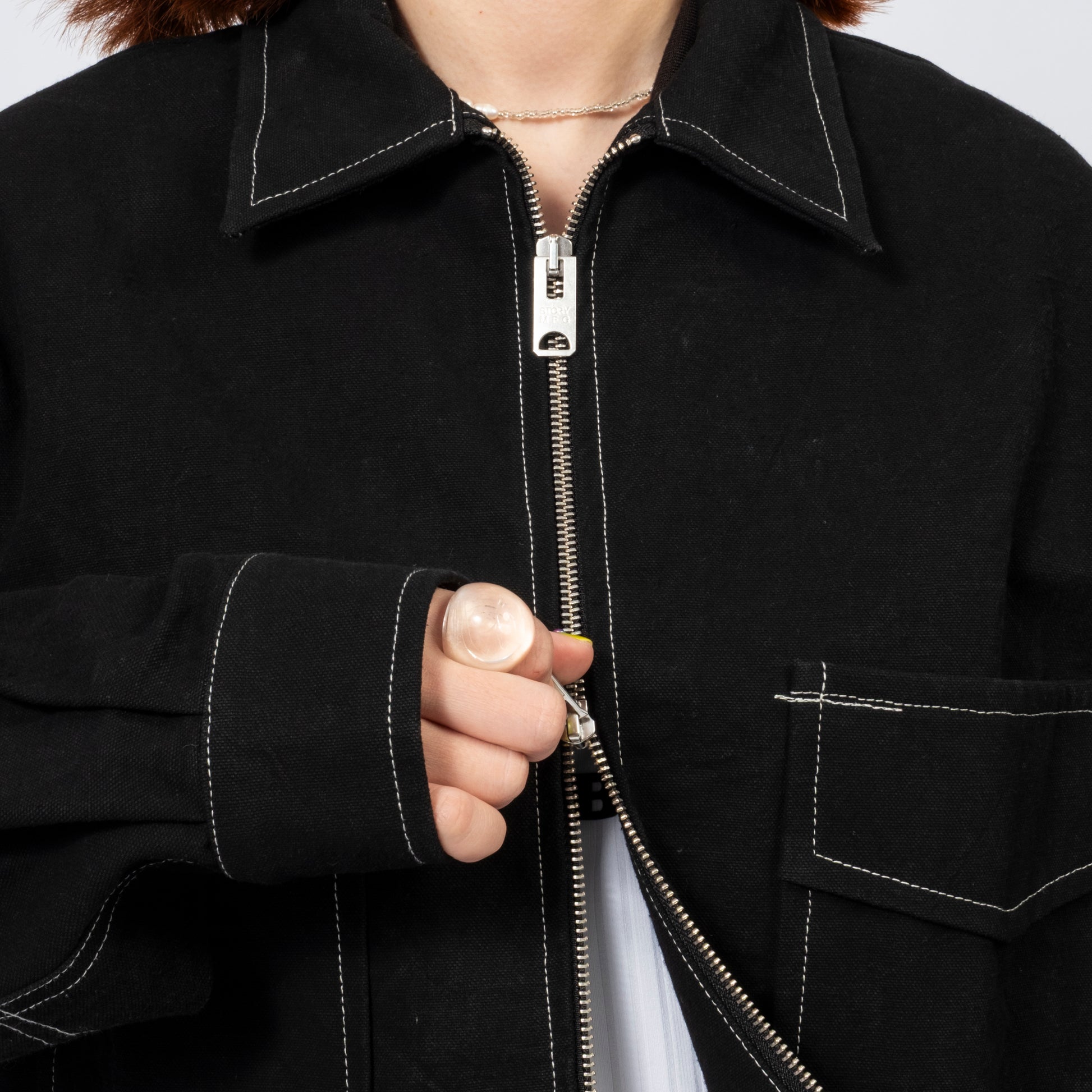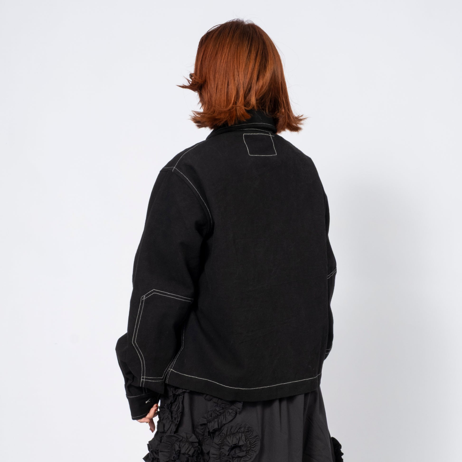 Workwear-inspired jacket in organic cotton twill, hand-dyed with natural dyes. Part of the Wonky-Wear capsule, celebrating offbeat vintage details through single-needle construction.