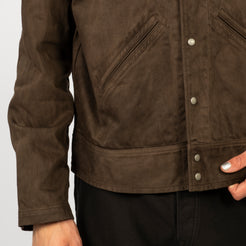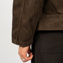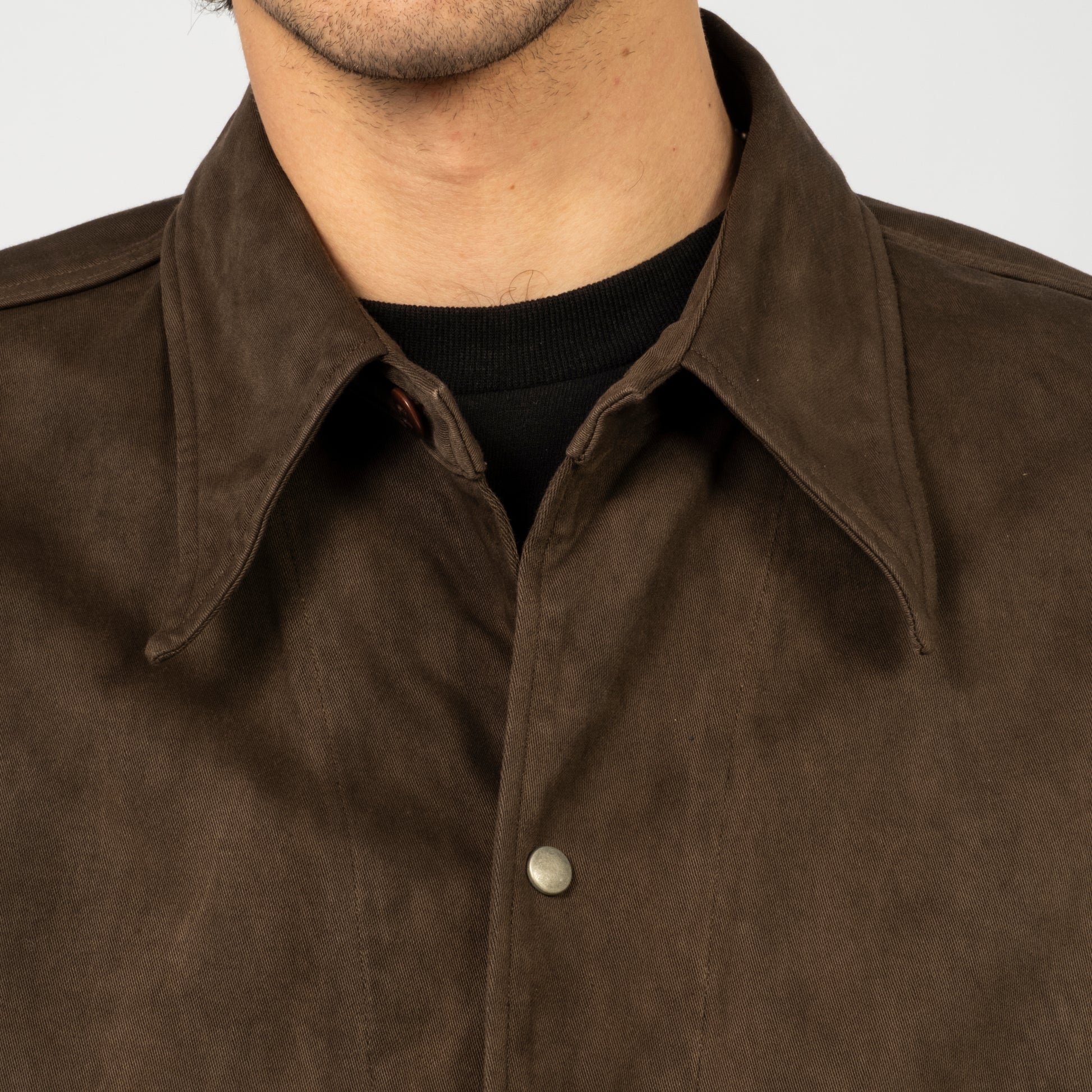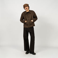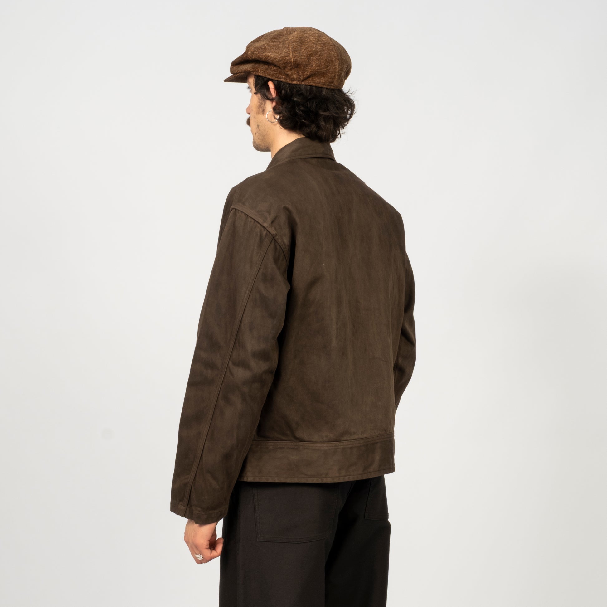 A jacket inspired by 1940s U.S. hospital uniforms, originally worn by recovering soldiers. Taiga Takahashi reimagines it with natural dyes and a rich satin fabric, giving the vintage design a soft, modern depth.