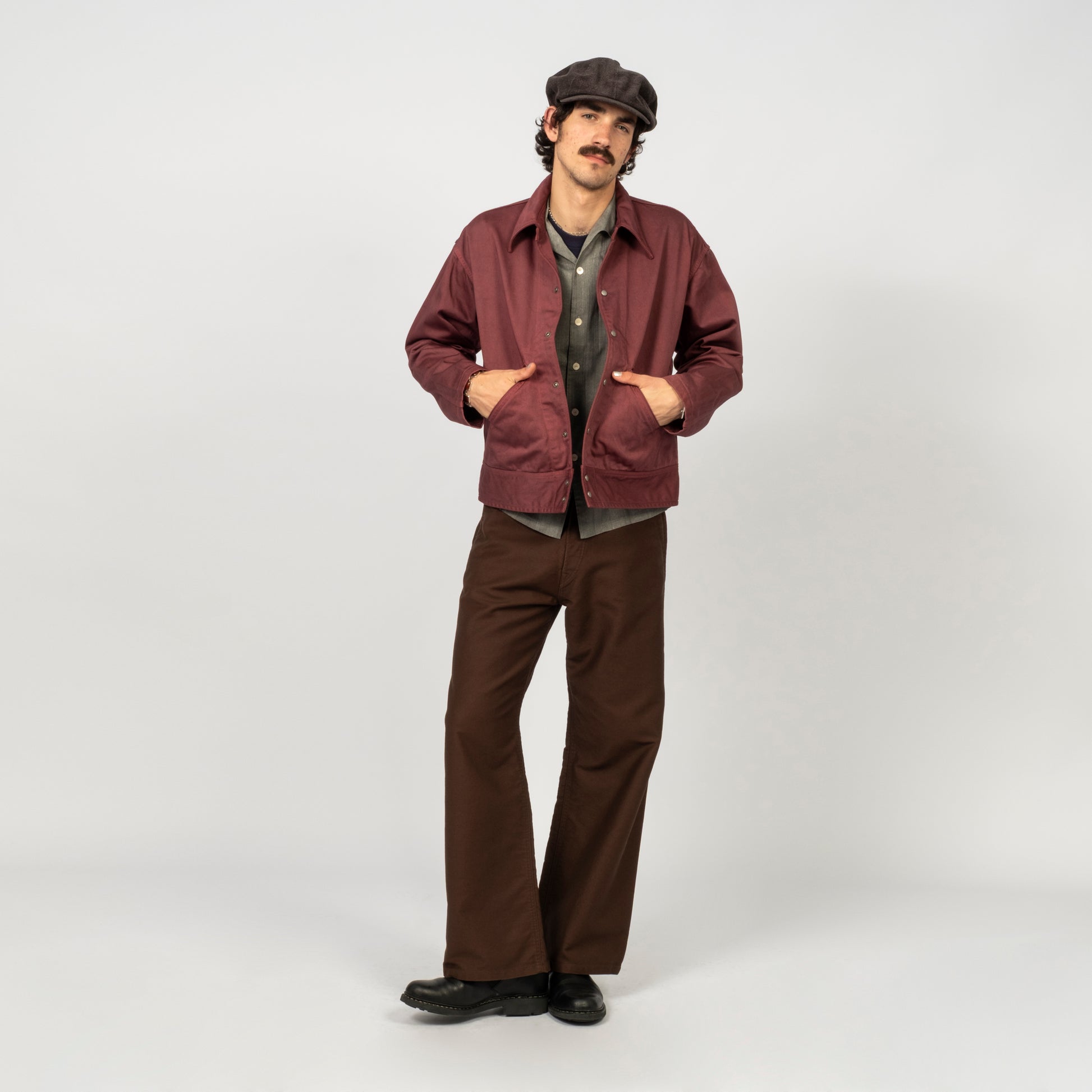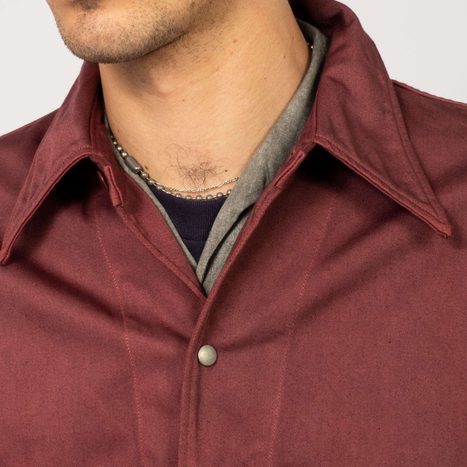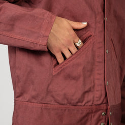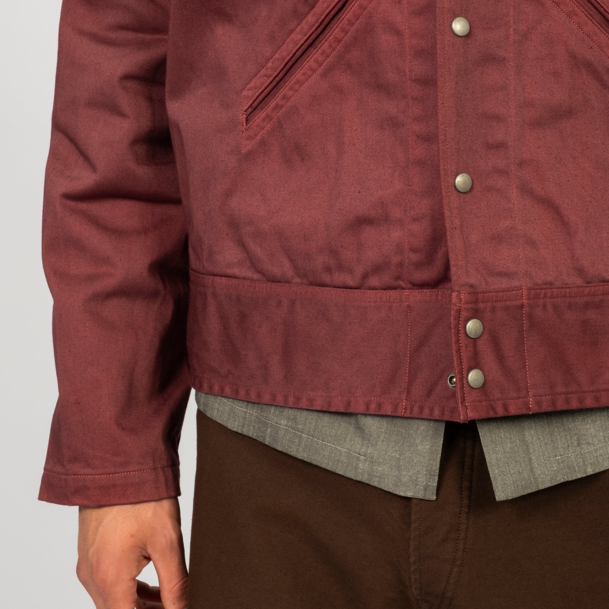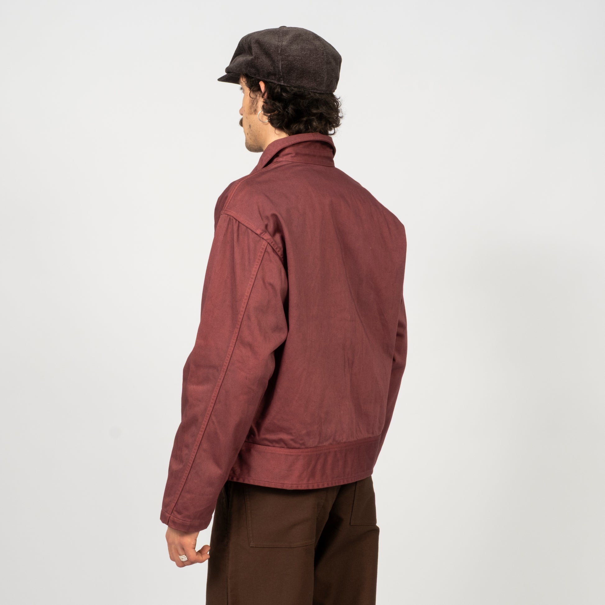 A jacket inspired by 1940s U.S. hospital wear, originally made for soldiers recovering in hospital. Taiga Takahashi recreates the piece using rich satin fabric and natural dyes, finishing it with a slightly violet Burgundy tone developed through multiple dye tests.