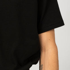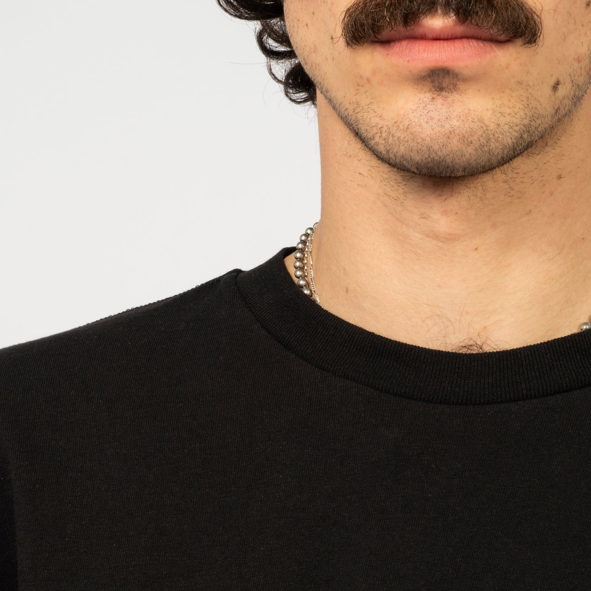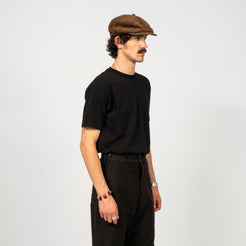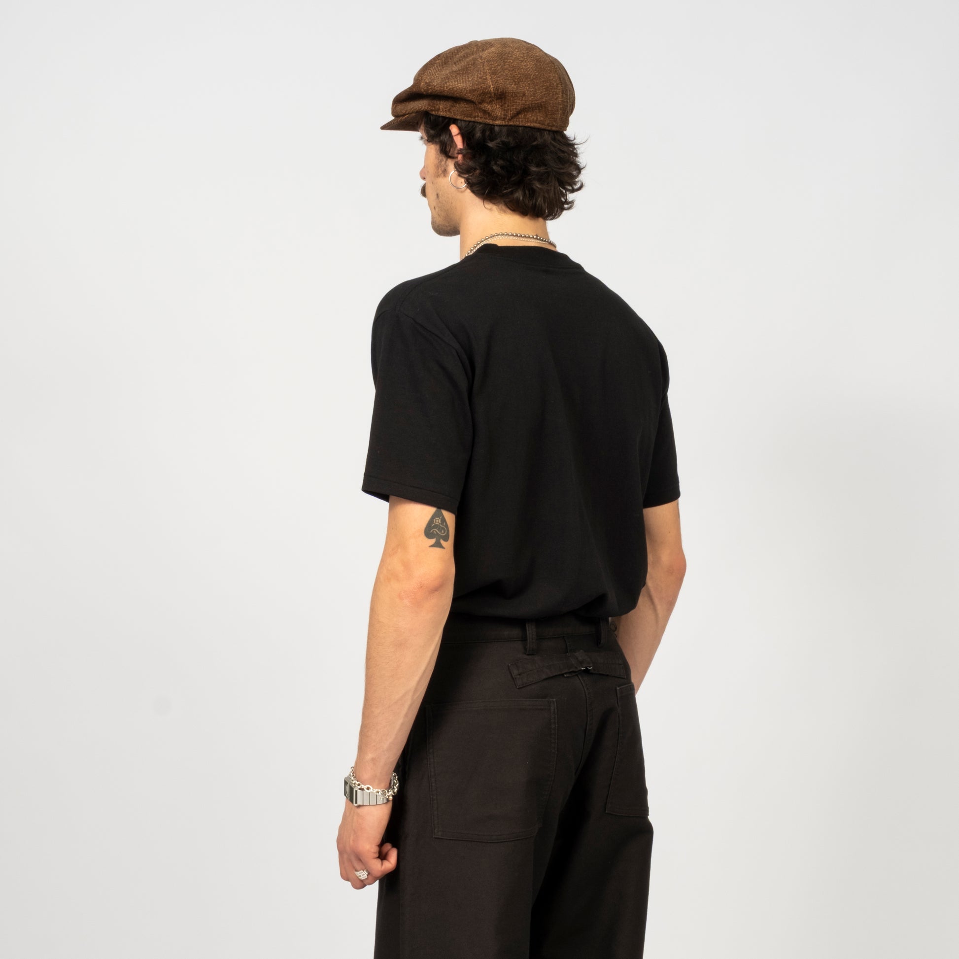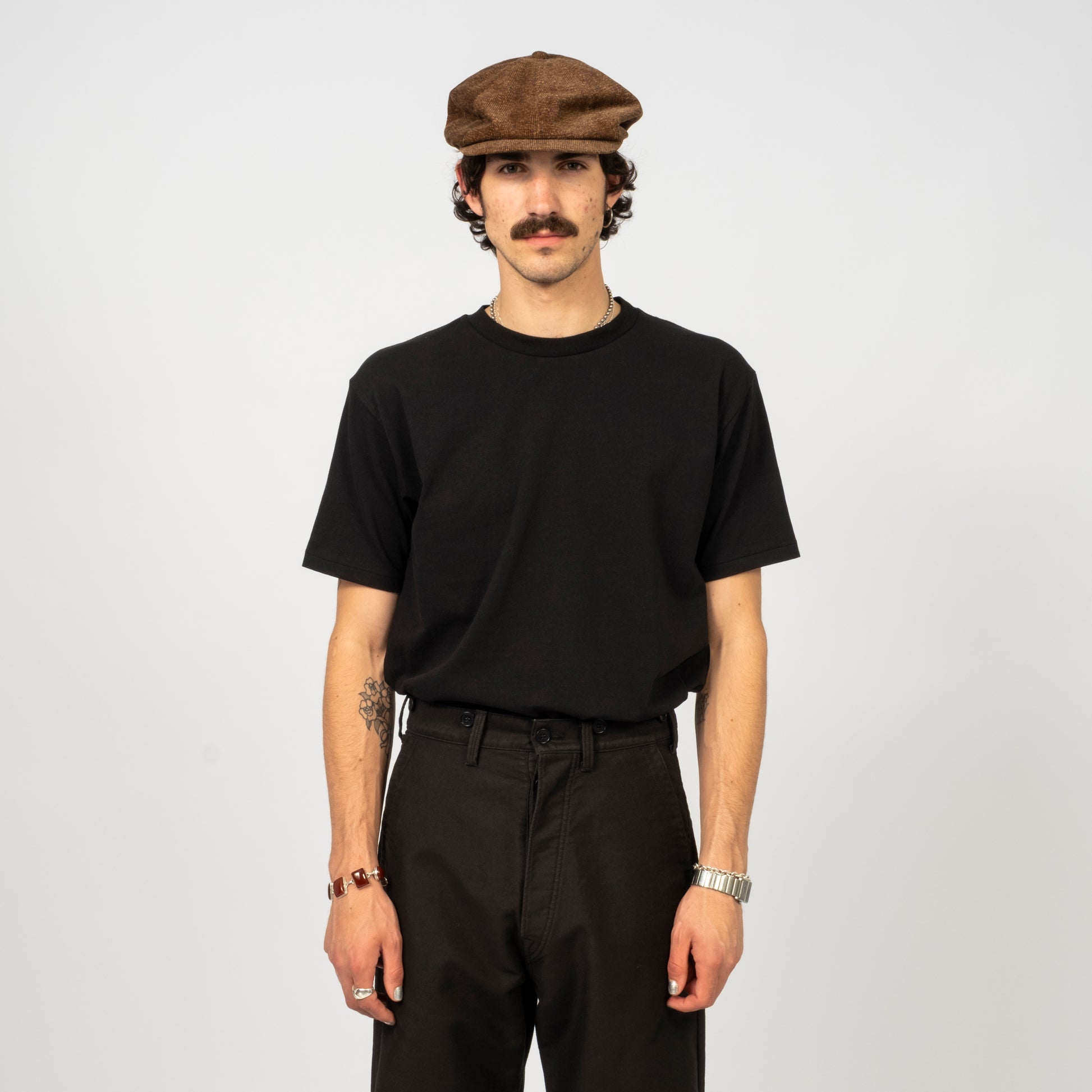 A new T-shirt developed from the long history of American everyday wear. It uses a seamless, circular-knit neck rib finished with a 1960s double-chain stitch machine for a strong, vintage-style collar.