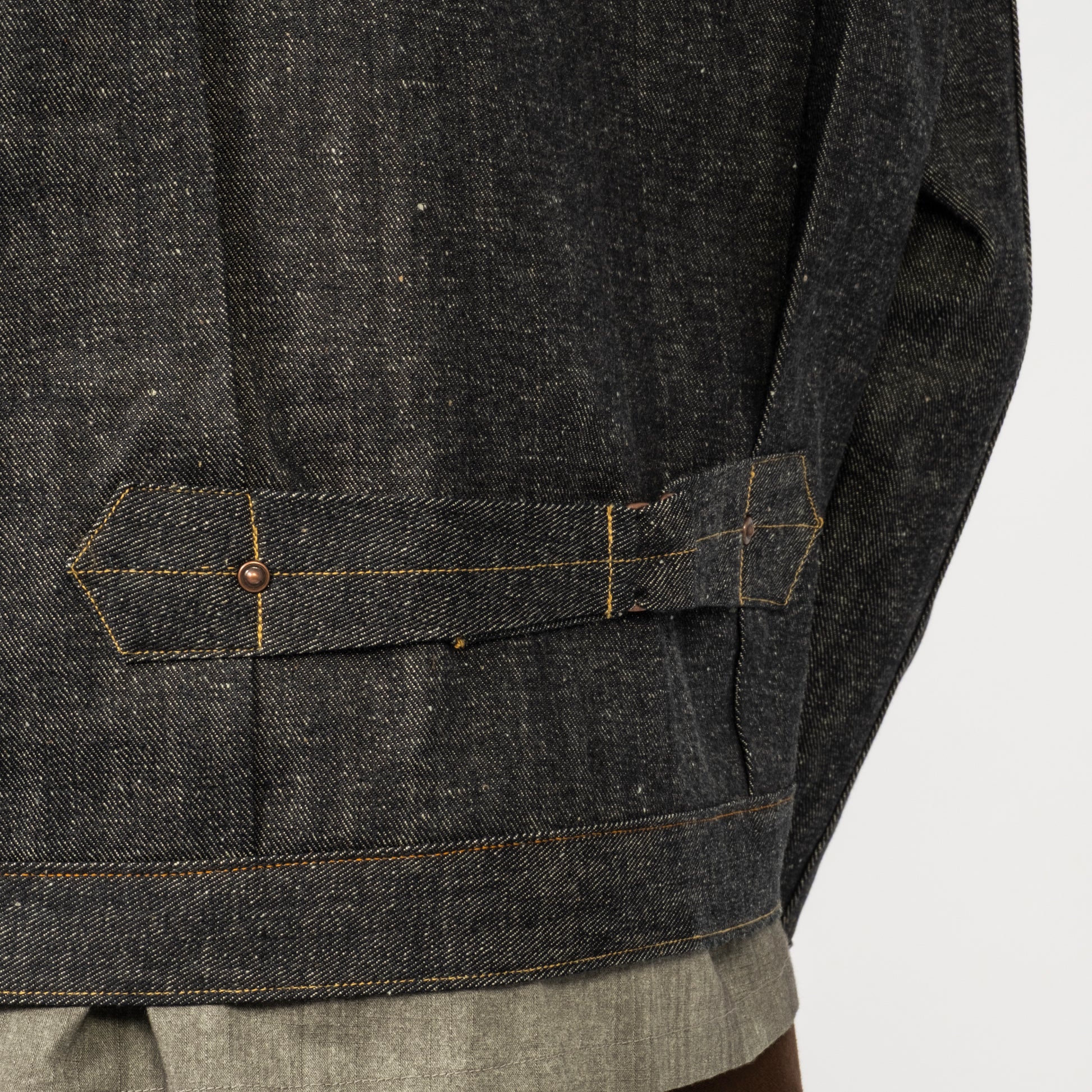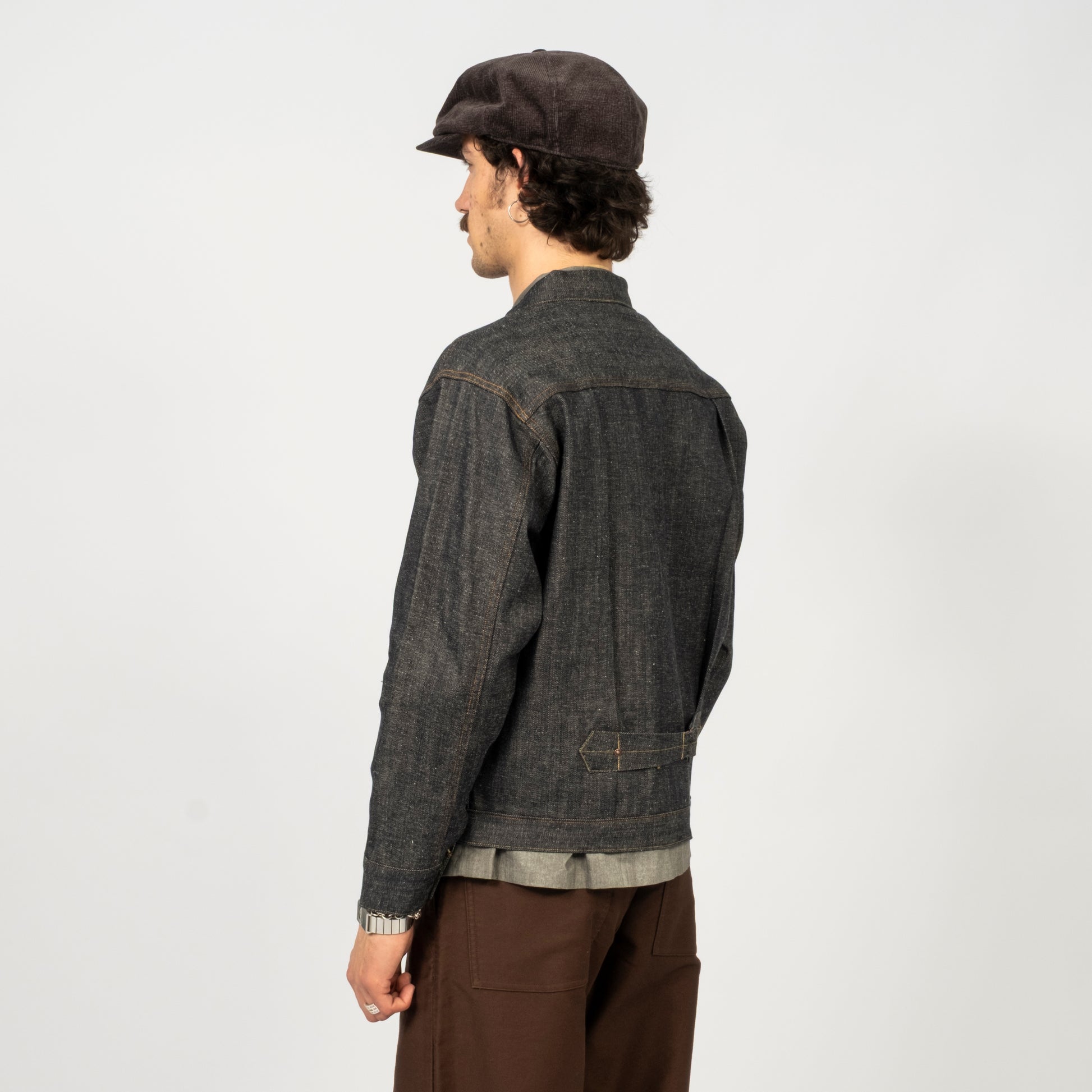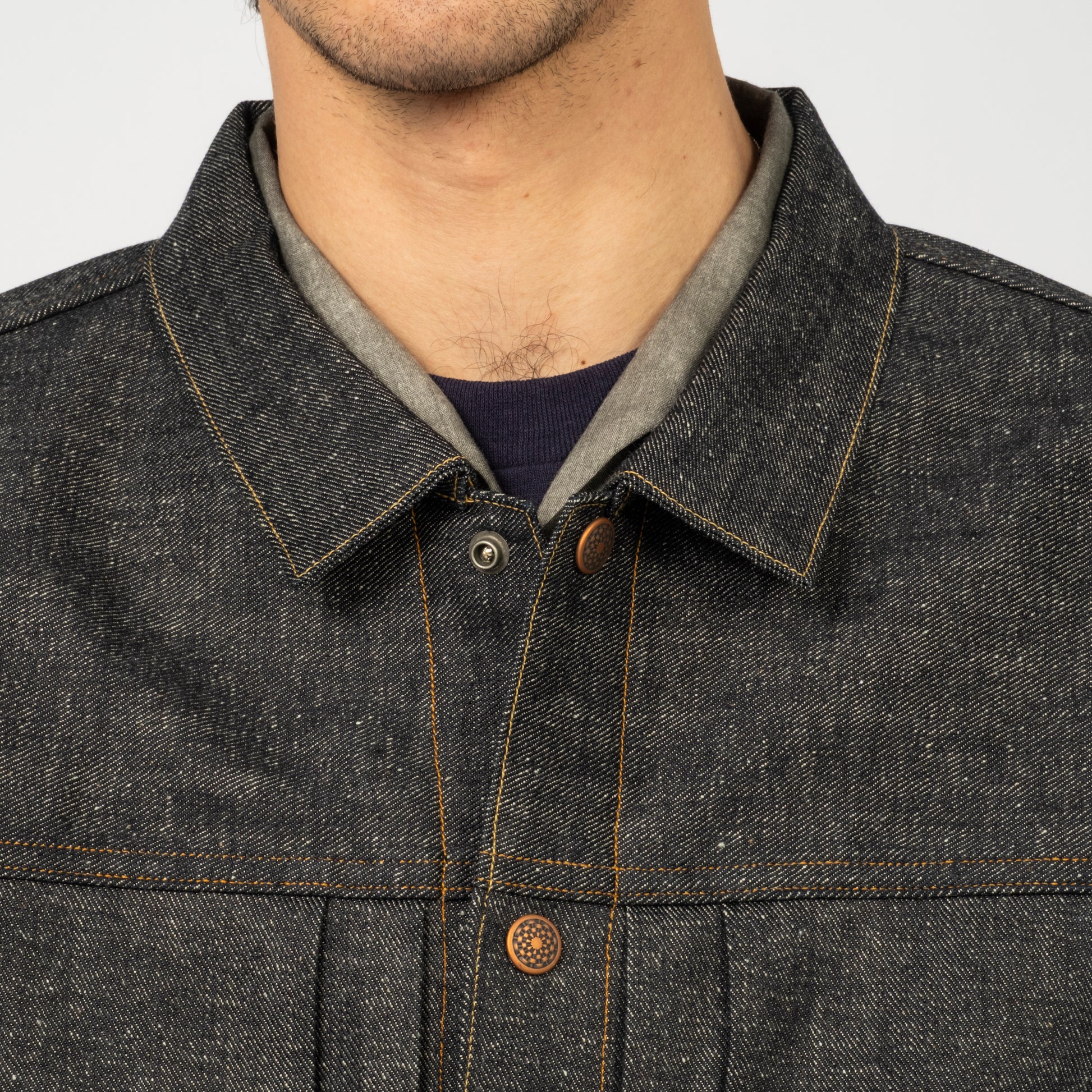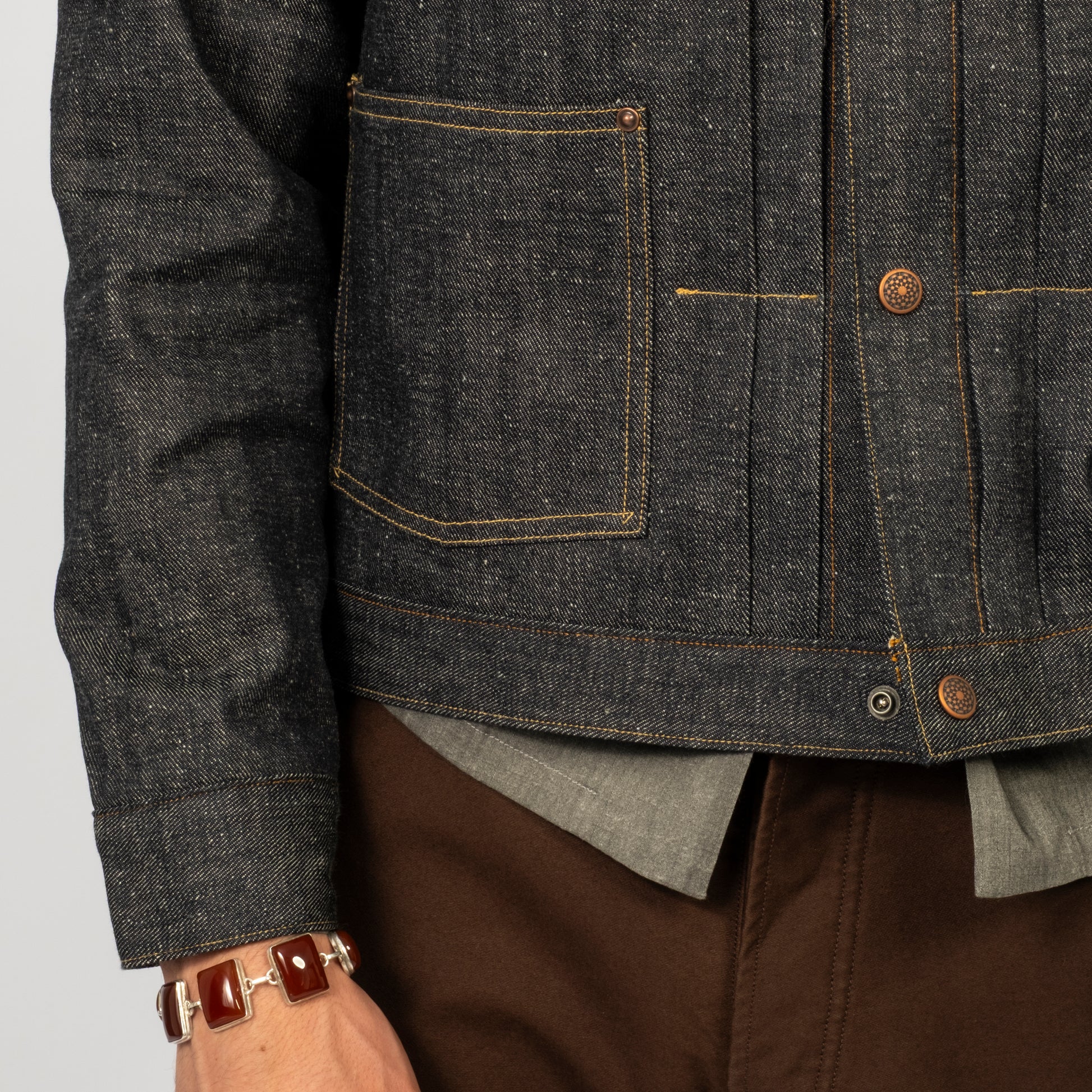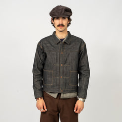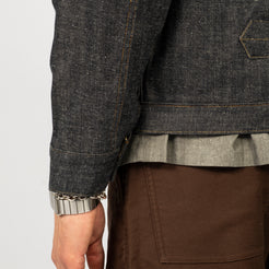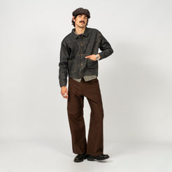 Taiga Takahashi’s iconic denim jacket, made from original selvedge denim woven slowly on old shuttle looms in Okayama. The fabric has a natural, uneven texture with a deep indigo tone created by mixing indigo and sulfur dyes.