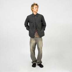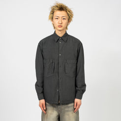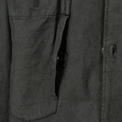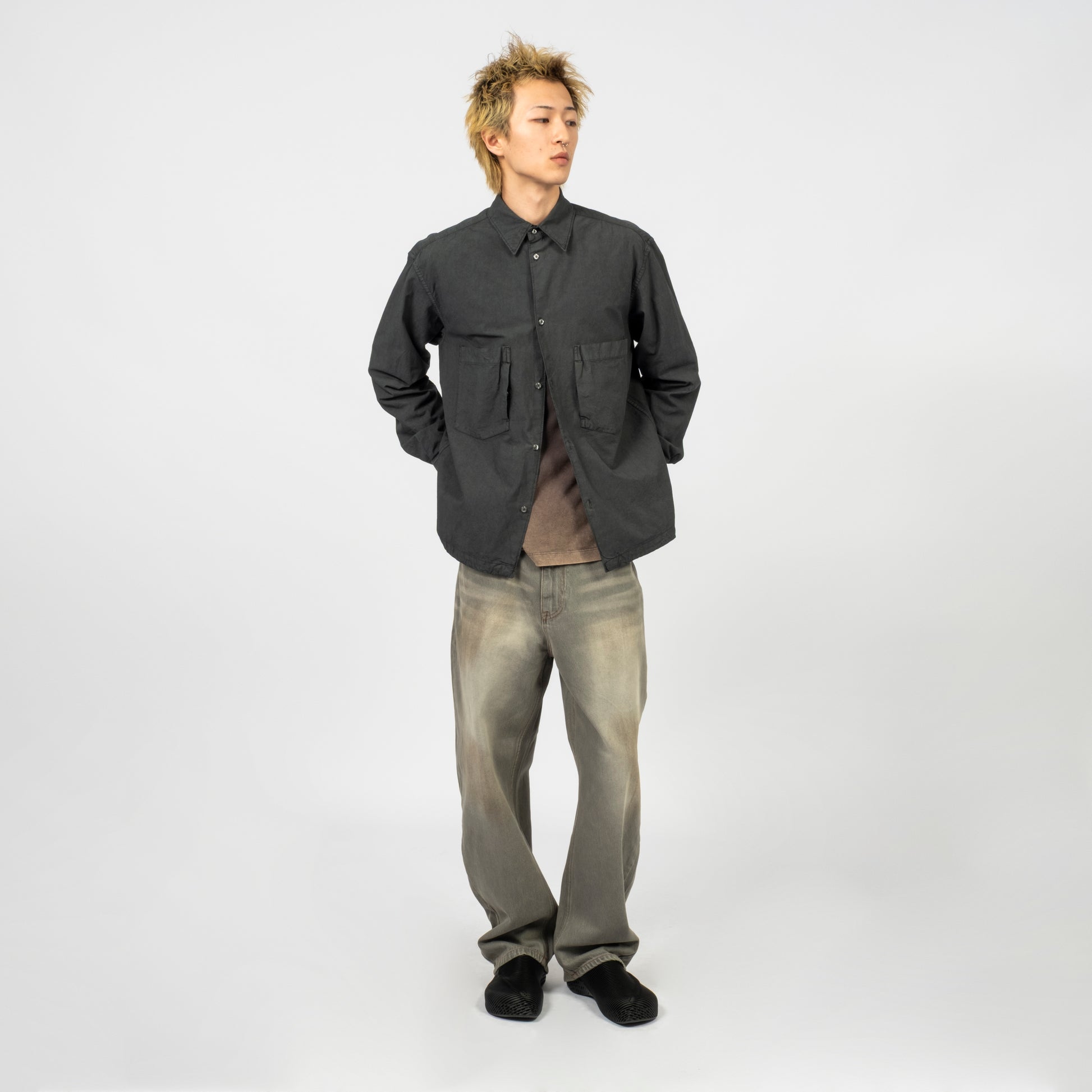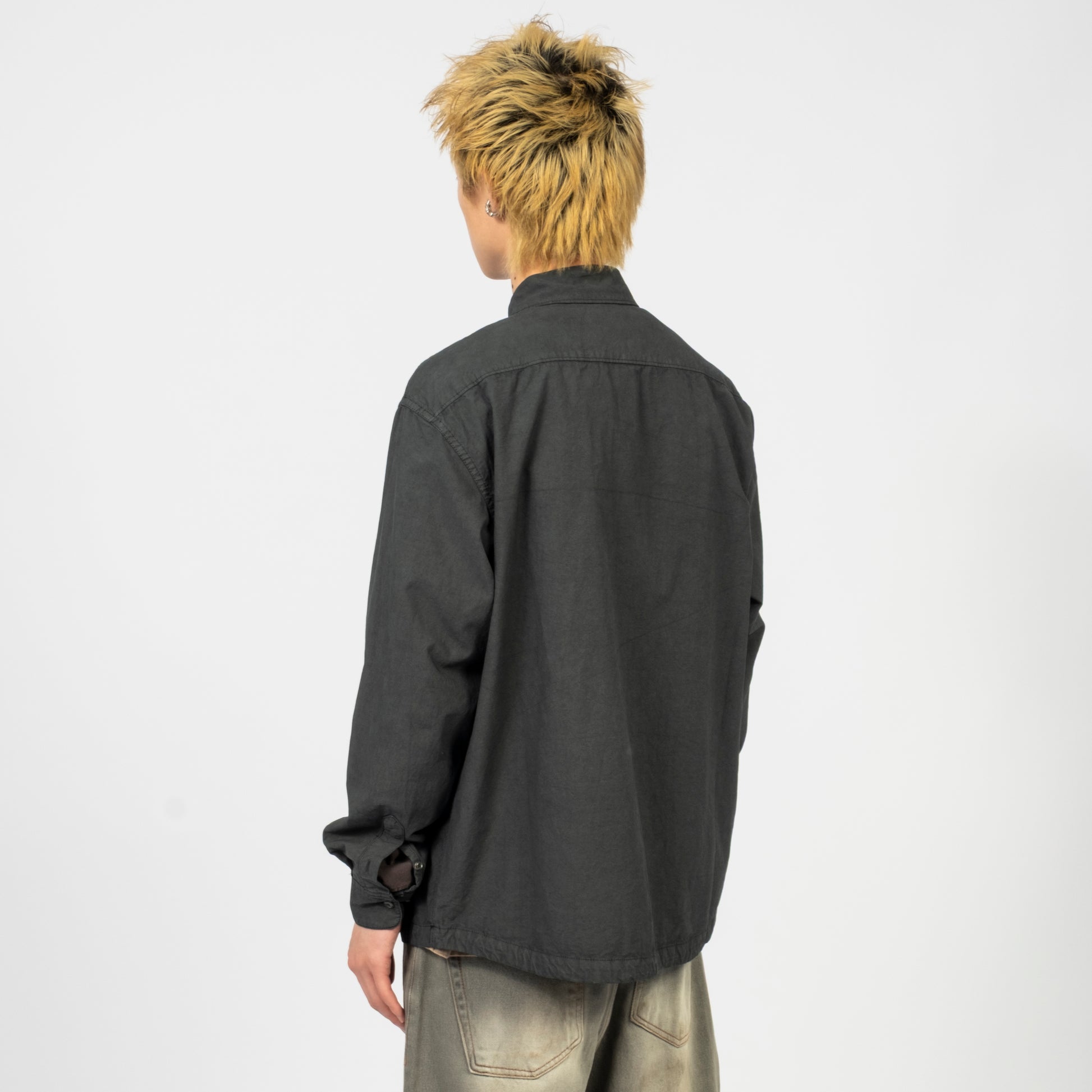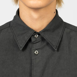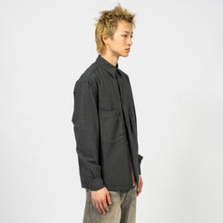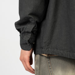 An oversized shirt with subtle structure and softness, elevated with mother-of-pearl buttons. The curved hem is finished with drawstrings for adjustable shape, making the piece easy to style across seasons.