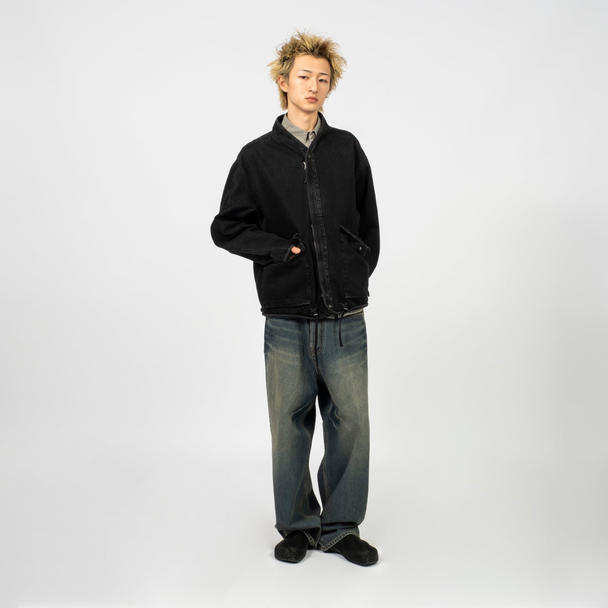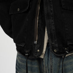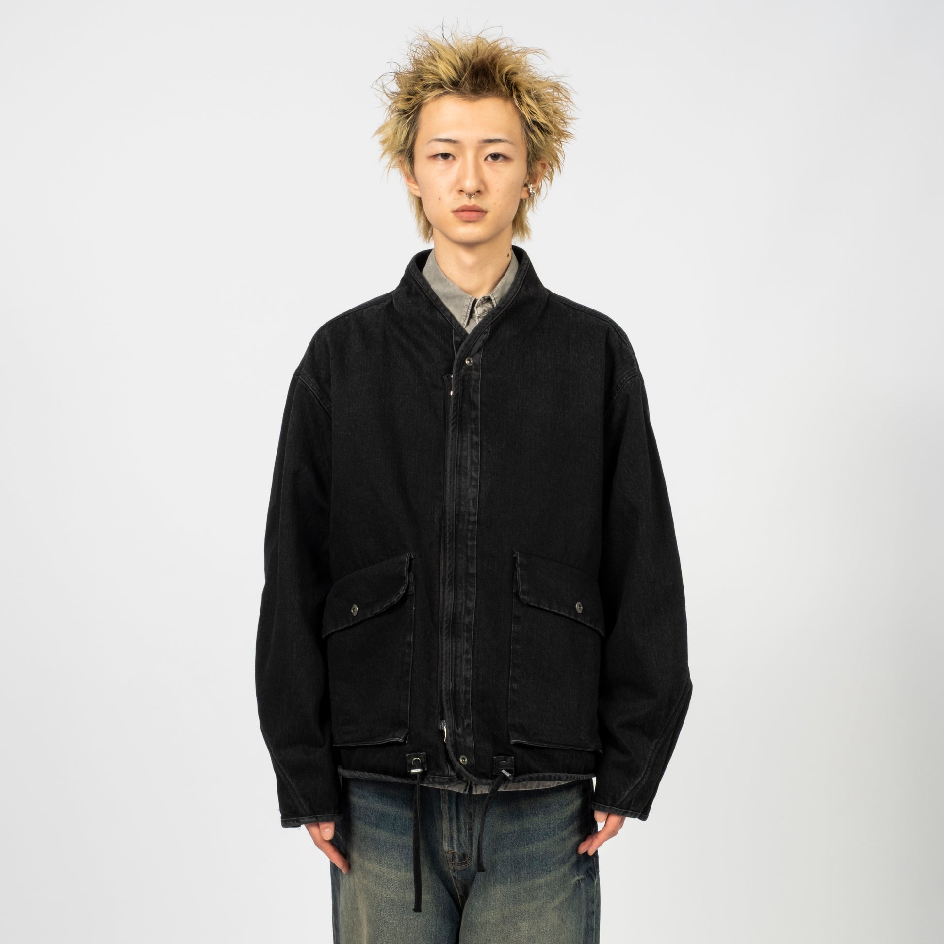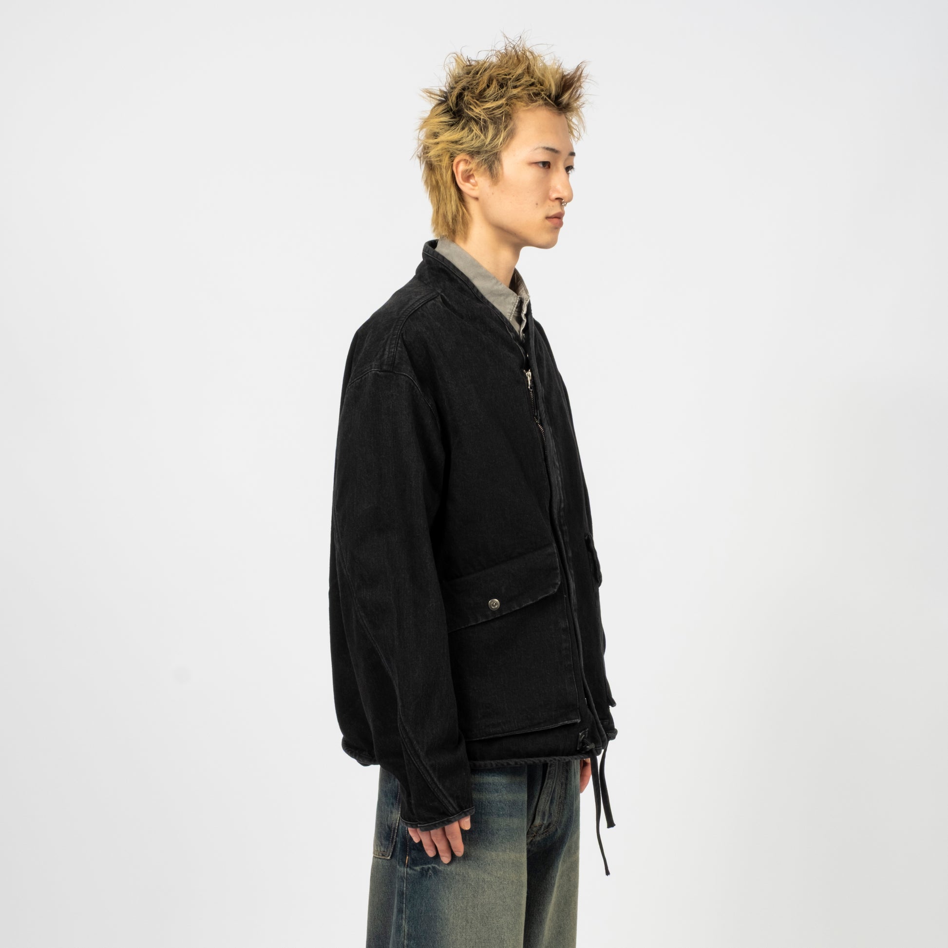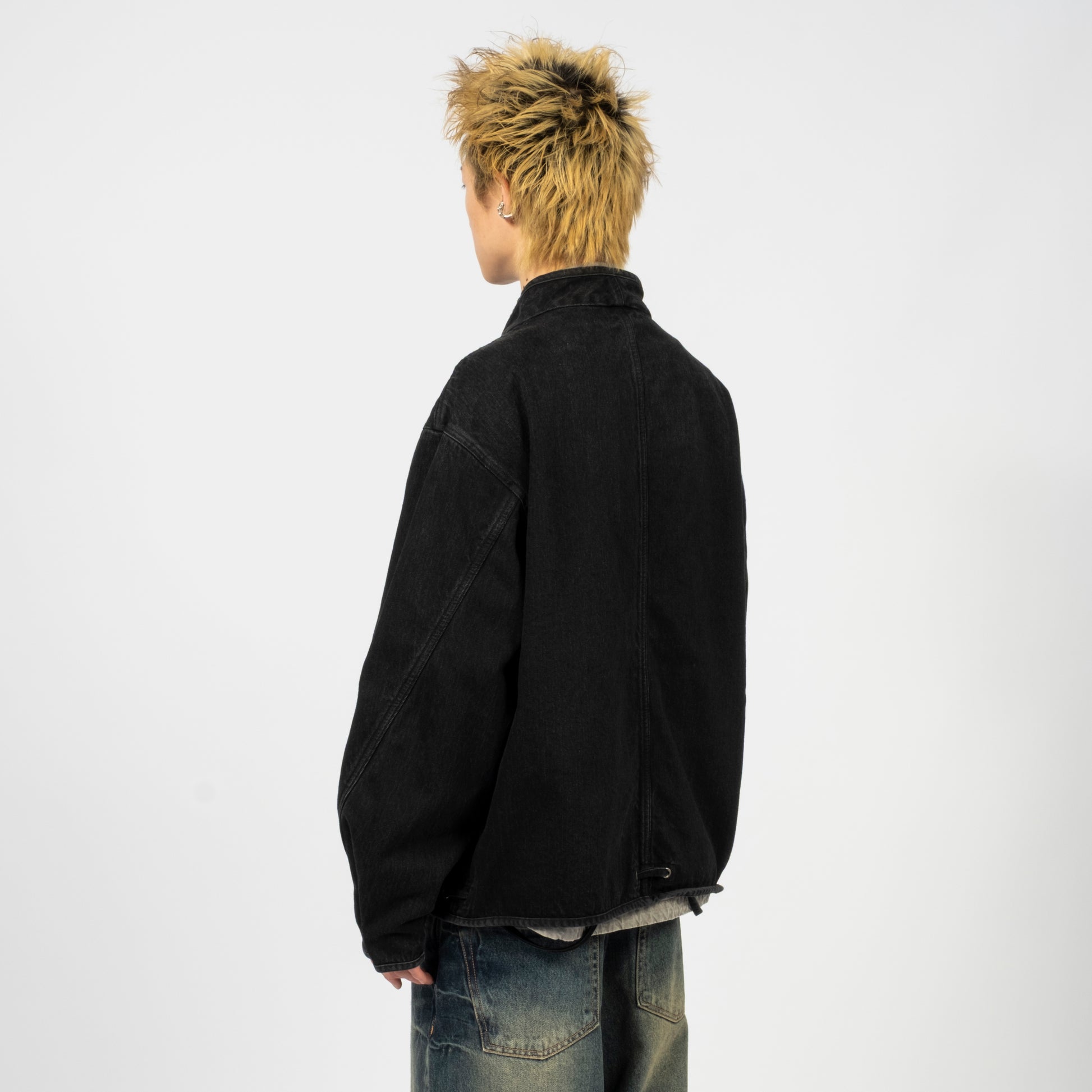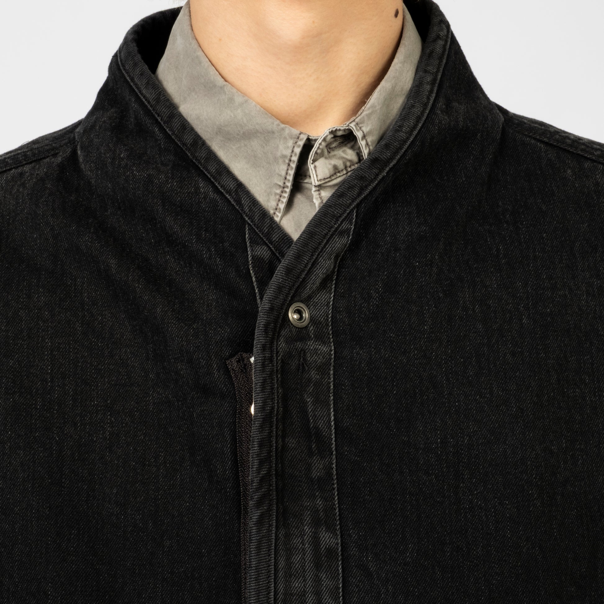 A collarless denim jacket in a washed black tone, designed with an oversized silhouette and structured detailing. The two-way zipper sits under a snap-button flap, while the waist drawstrings allow subtle shaping when needed.