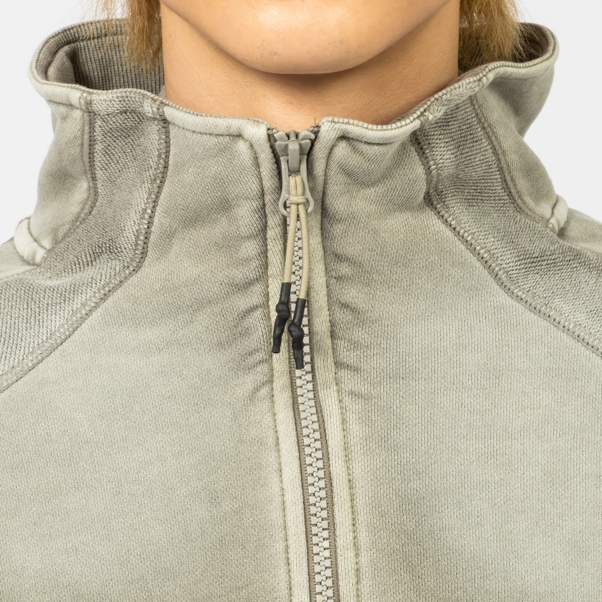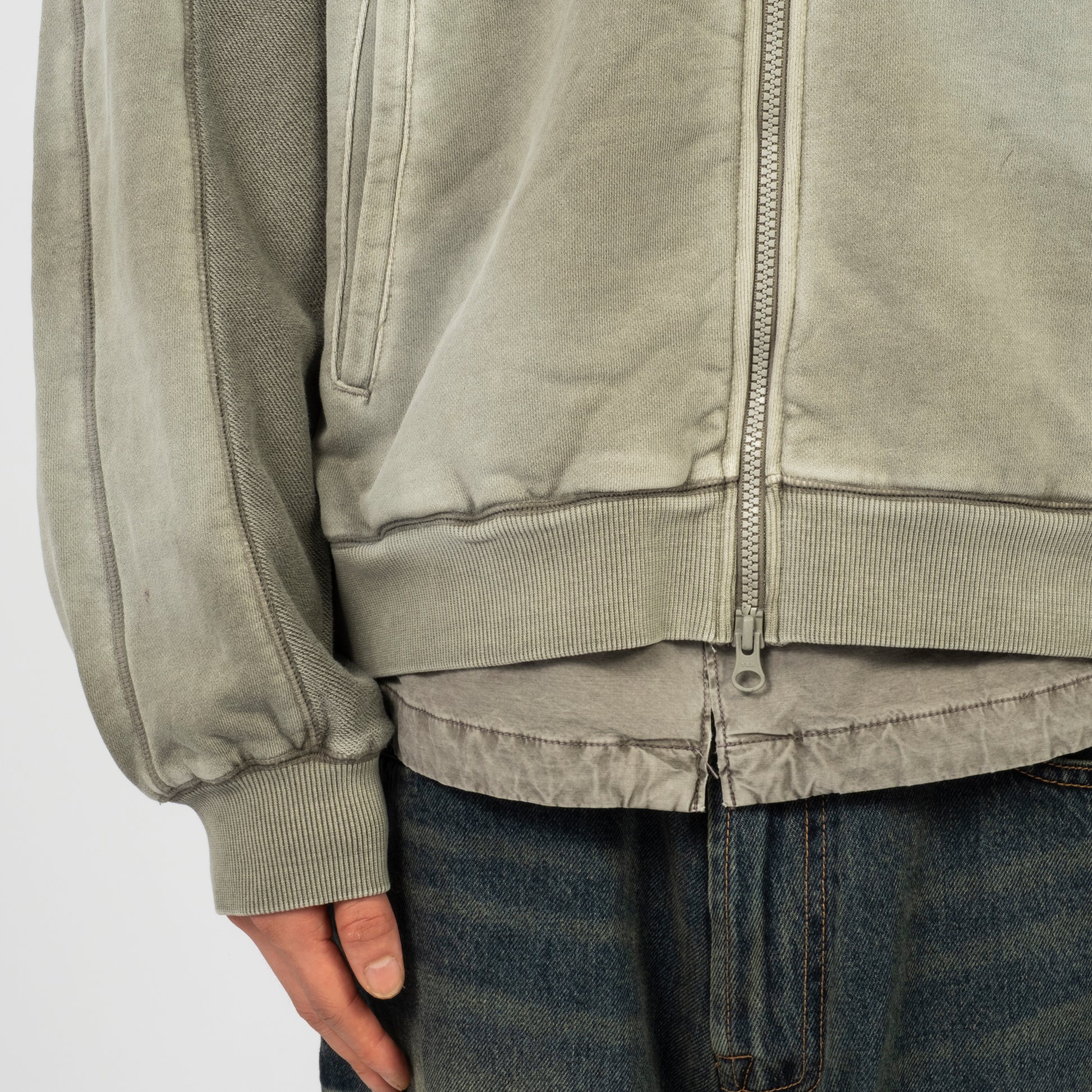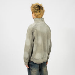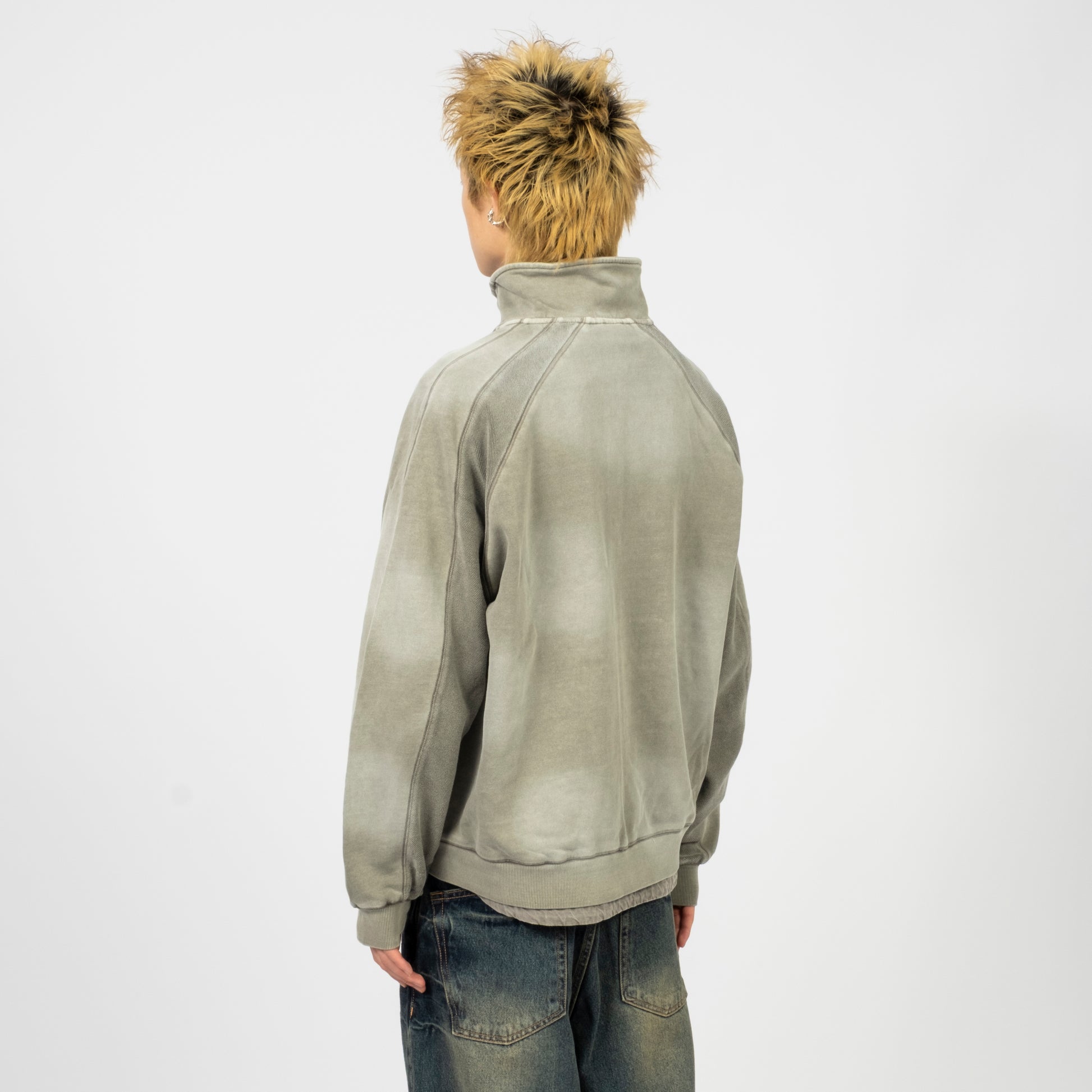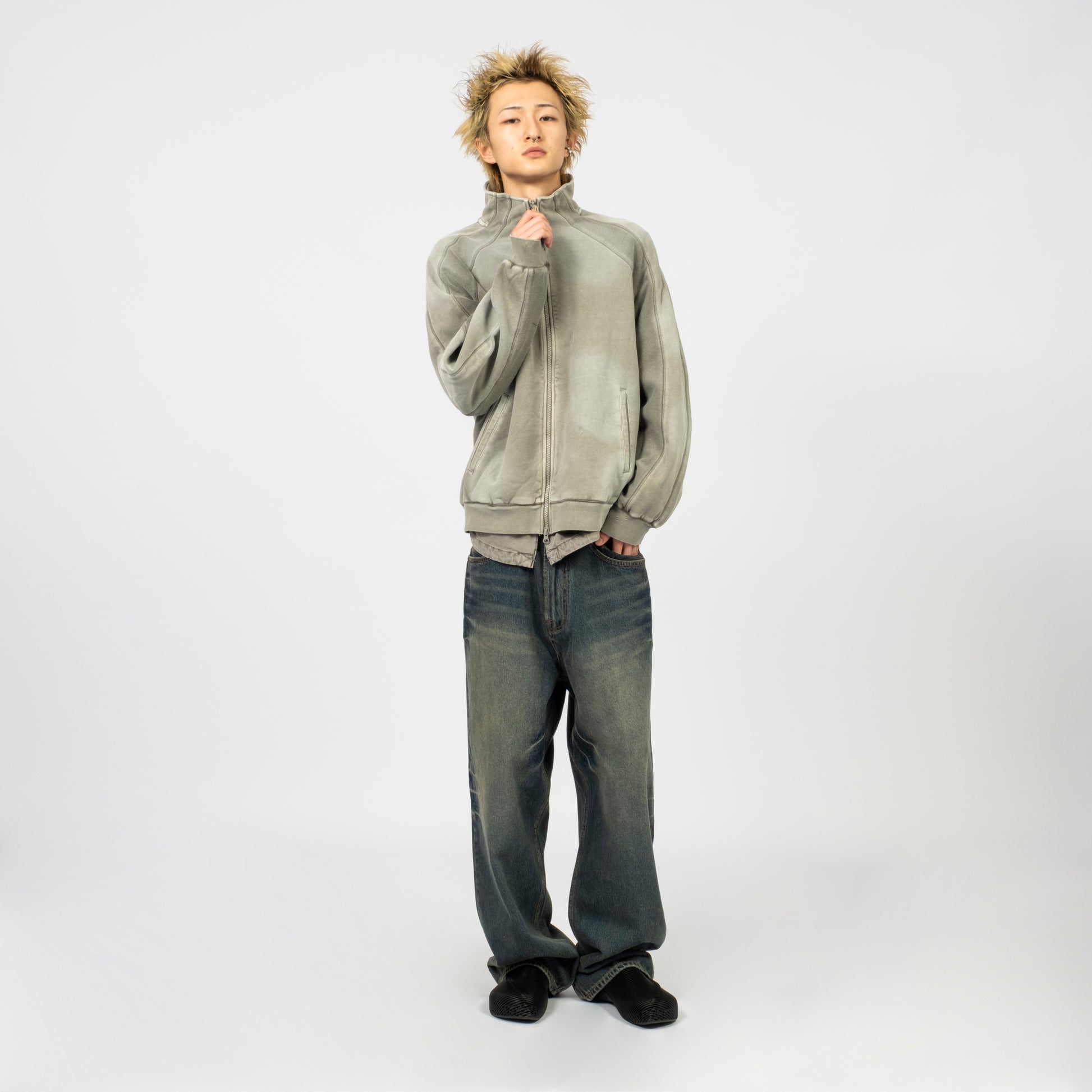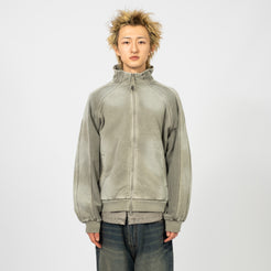 A washed sage green zip-up built from soft cotton jersey, finished with contrasting reversed panels for a subtle dimensional look. The stand collar and two-way zipper give it a clean, structured feel while keeping the silhouette oversized and easy.