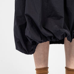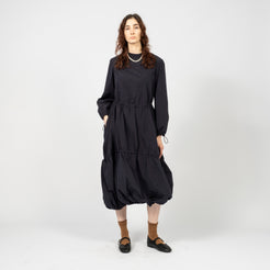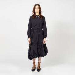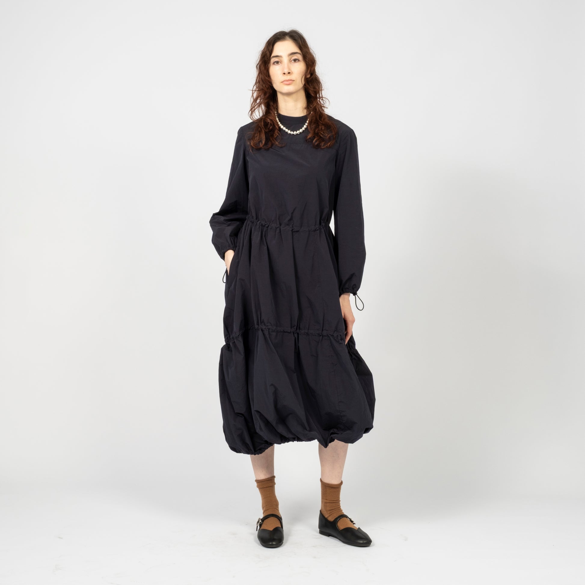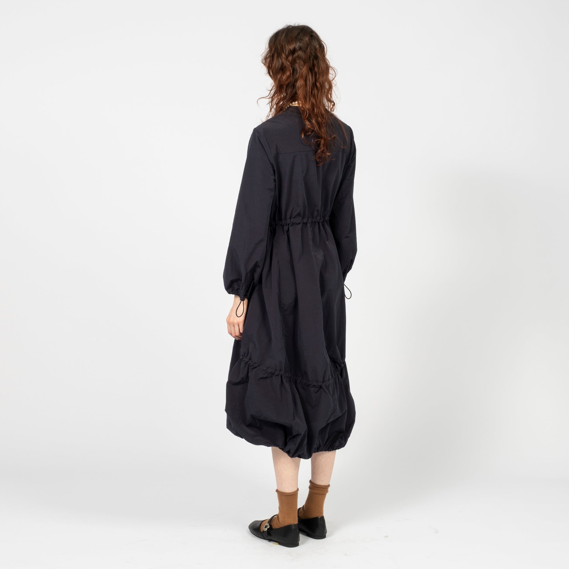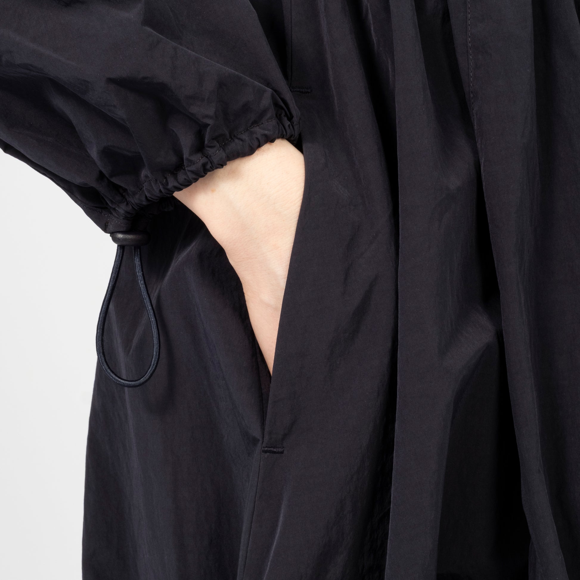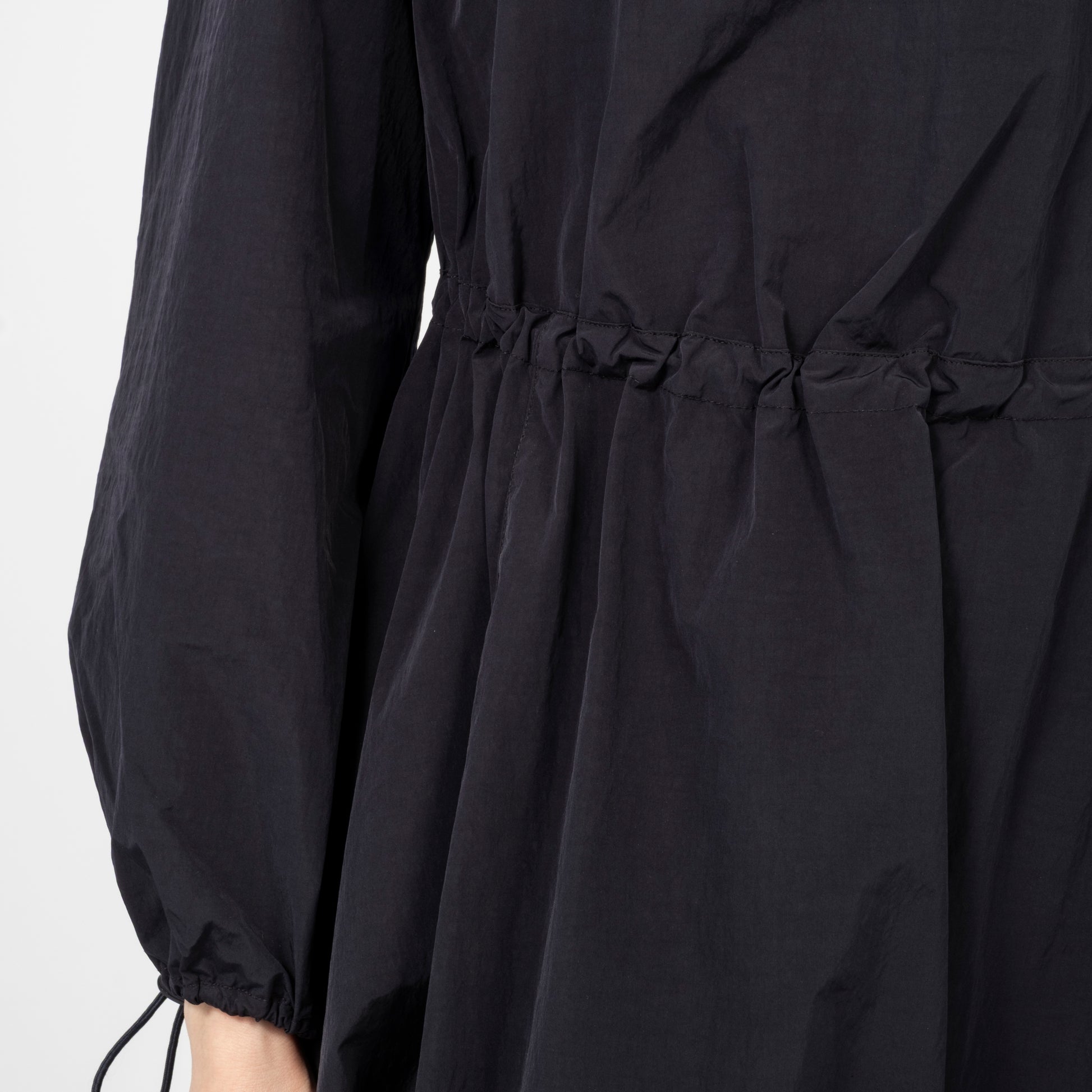 Ankle-length dress crafted from a technical cotton blend with adjustable drawcords at the waist, hip, and hem for a custom silhouette. Designed with a stand collar, wide adjustable sleeves, and a relaxed, fluid fit.