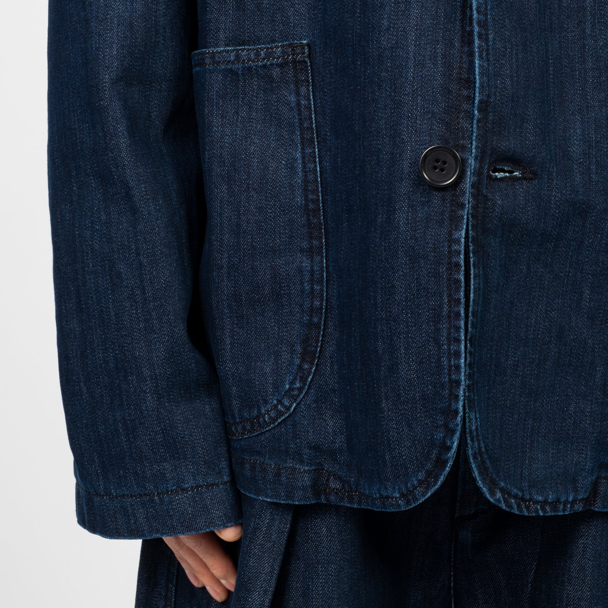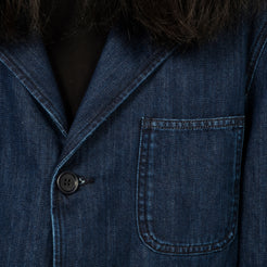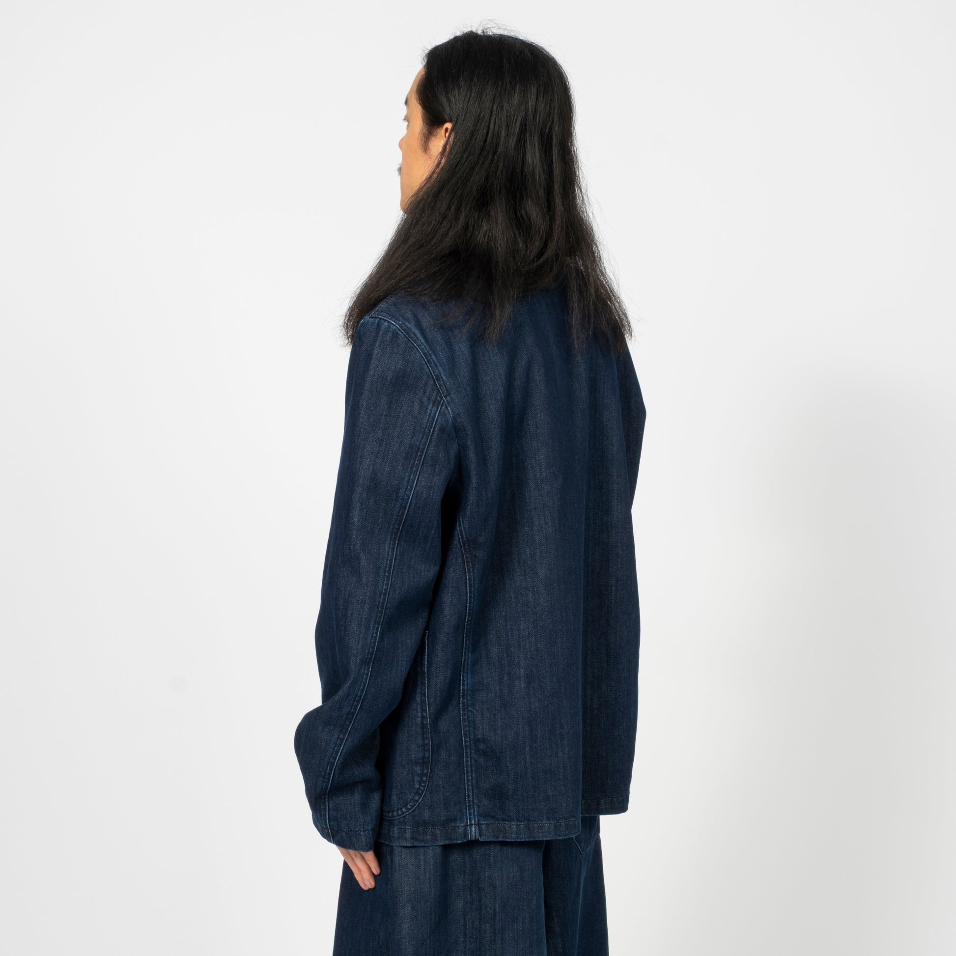 A relaxed interpretation of the classic blazer, crafted from indigo organic cotton for a soft, natural feel. Featuring patch pockets and corozo buttons, its half-lined construction offers light structure and everyday ease.