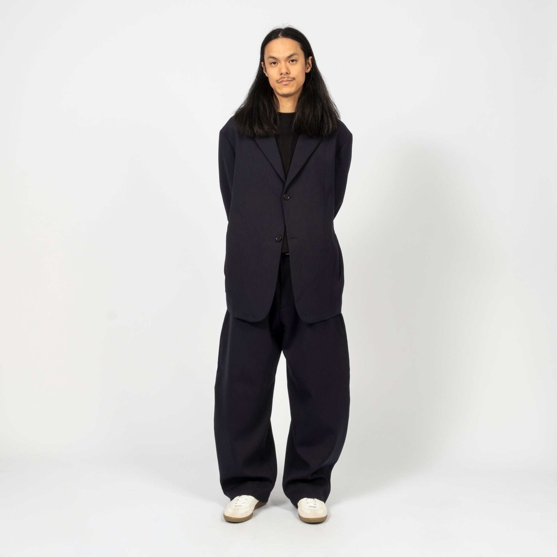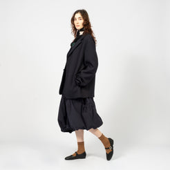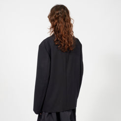 Relaxed single-breasted blazer cut from a Portuguese wool blend suiting fabric. Detailed with clean front seams, invisible zip pockets, and corozo button fastening. Twill lined for comfort with an oversized, gender-neutral silhouette.